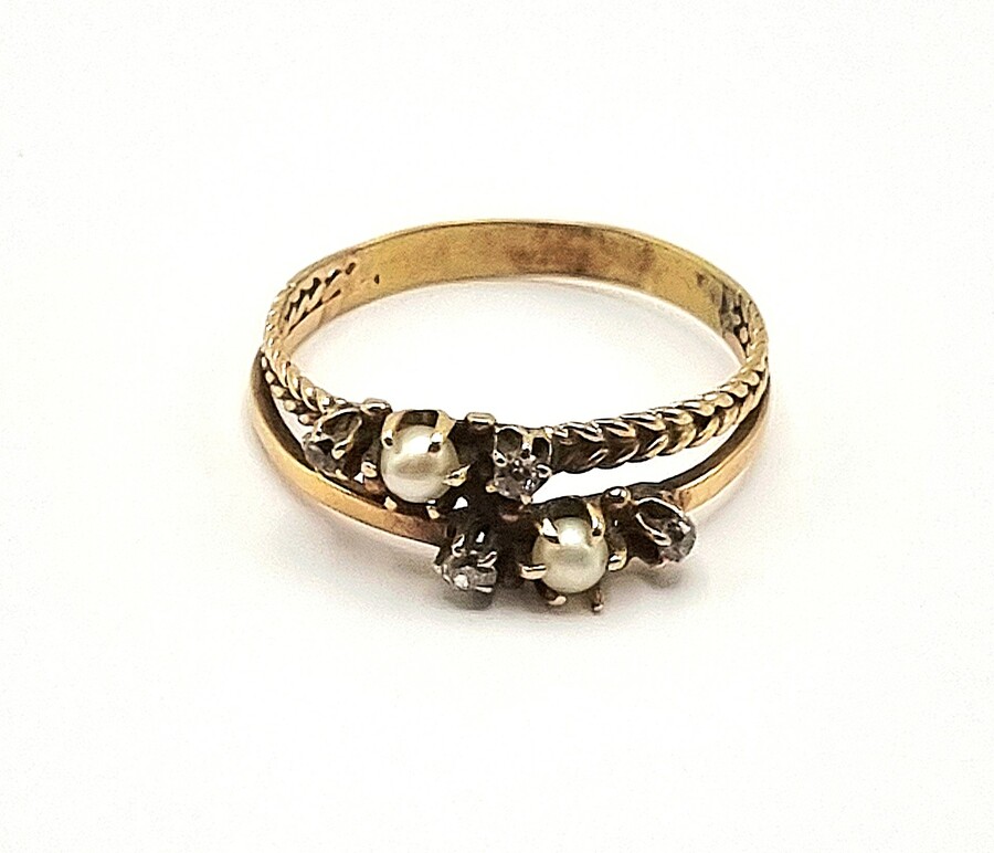 Gouden ring van 14 karaat, gedateerd begin 20e eeuw, uitgevoerd in de Edwardiaanse Belle Époque-stijl. De ring is vervaardigd door smeden en omvat een gesmede dubbele band, waarvan één deel gevlochten is. De kop is een asymmetrische clusterzetting bezet met twee parels, geflankeerd door vier kleine diamanten, gezet in chatons.