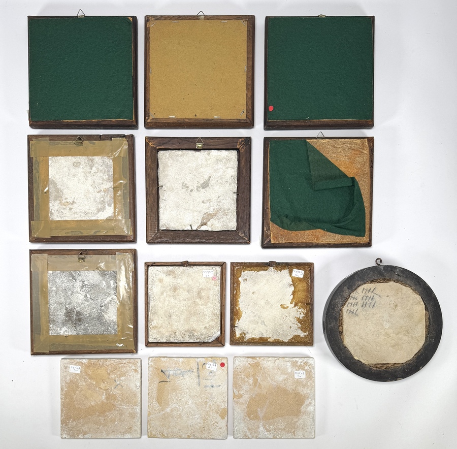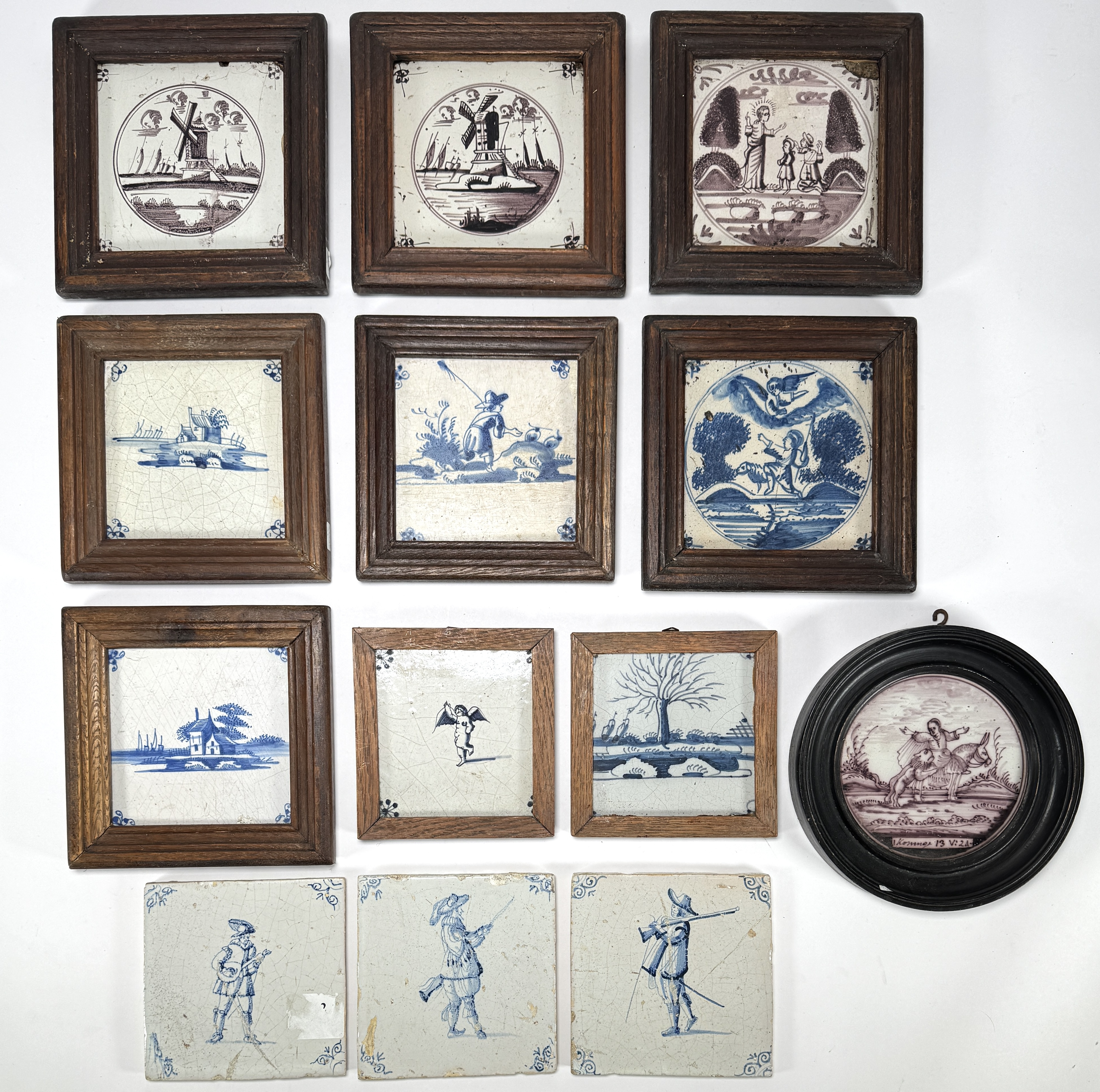 Collectie van dertien Hollandse tegels, vervaardigd in de 18e/19e eeuw. Het kavel omvat tien ingelijste exemplaren en drie losse tegels, uitgevoerd in tin geglazuurd aardewerk. De handgeschilderde decors tonen landschappen, Bijbelse scènes, ruiters en figuren in Delfts blauw en mangaan. Wil je de tegels in het echt bekijken? Kom naar de kijkdagen op 28, 29 en 30 november! |