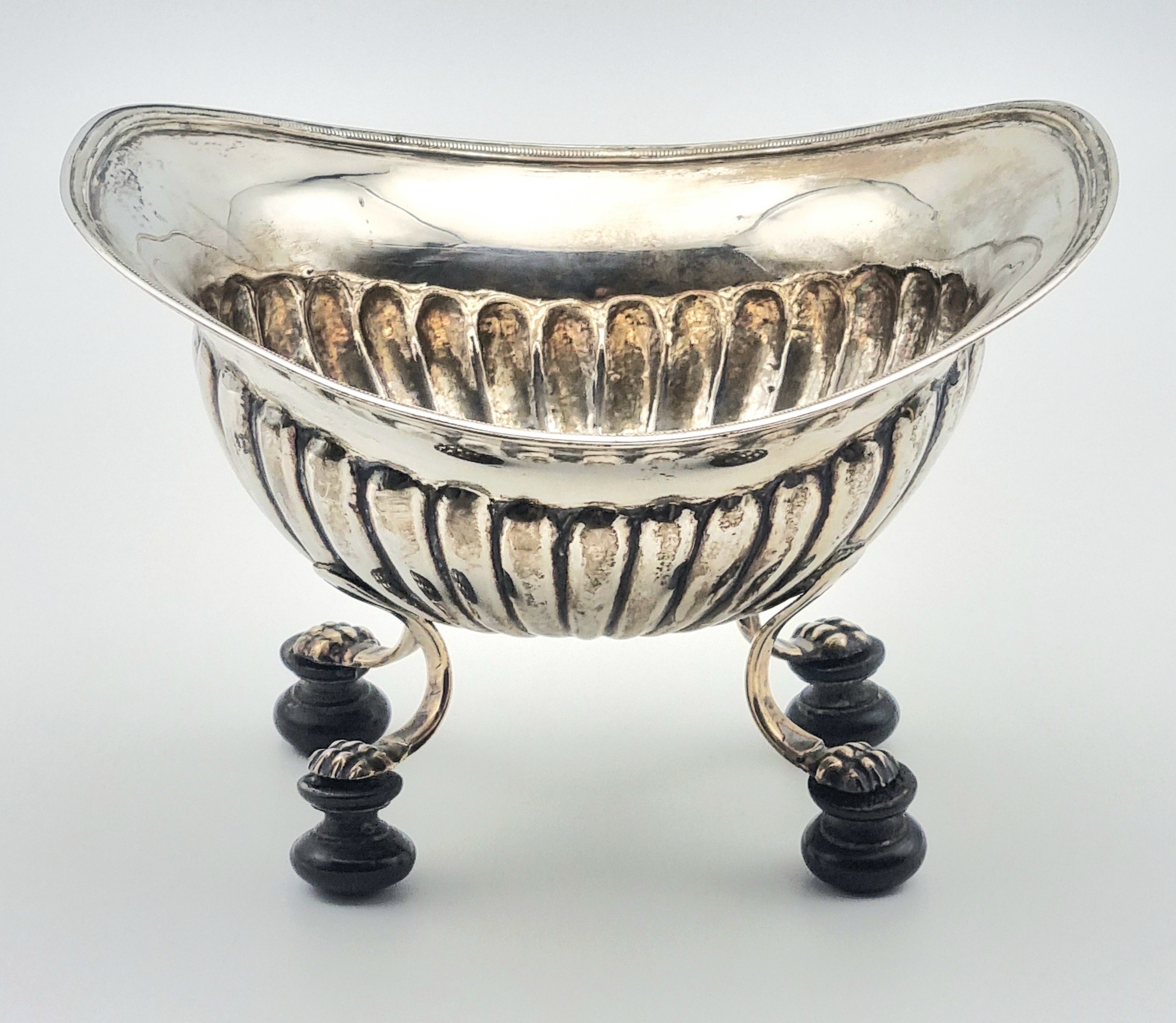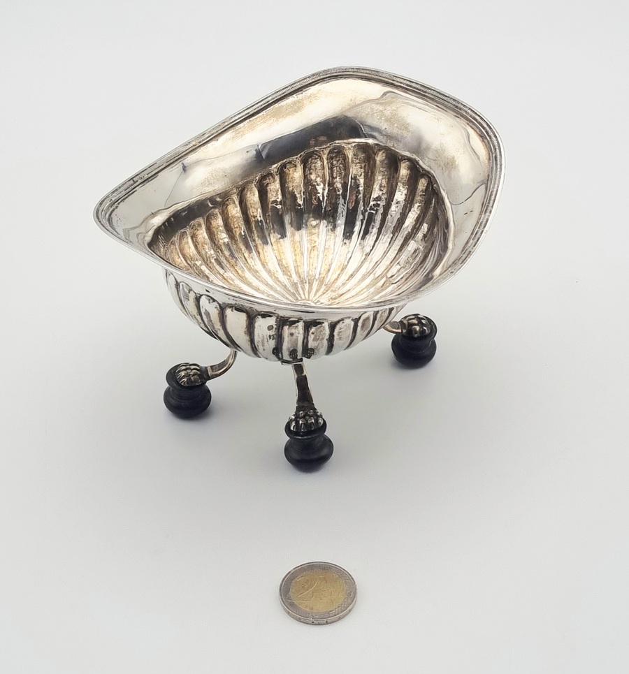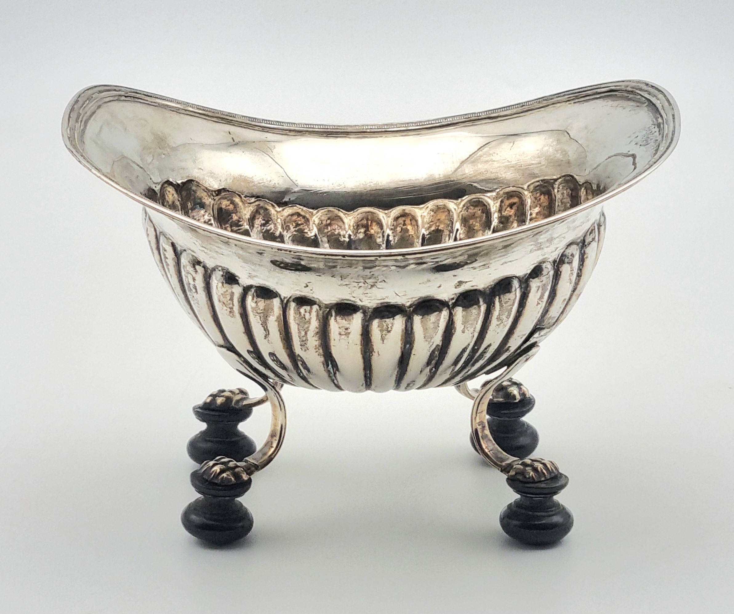 Zilveren pijpkomfoor van 835/1000 zilver, met Nederlandse keurmerken; meesterteken, de lopende leeuw 2, minervakop en jaarletter, uitgevoerd in een neoclassicistische stijl, circa 1820–1850. De ovale komfoor is versierd met gedreven cannelures en staat op vier korte pootjes met zwart houten knoppen. Registreer nu en bied eenvoudig online mee op deze pijpkomfoor. |