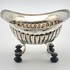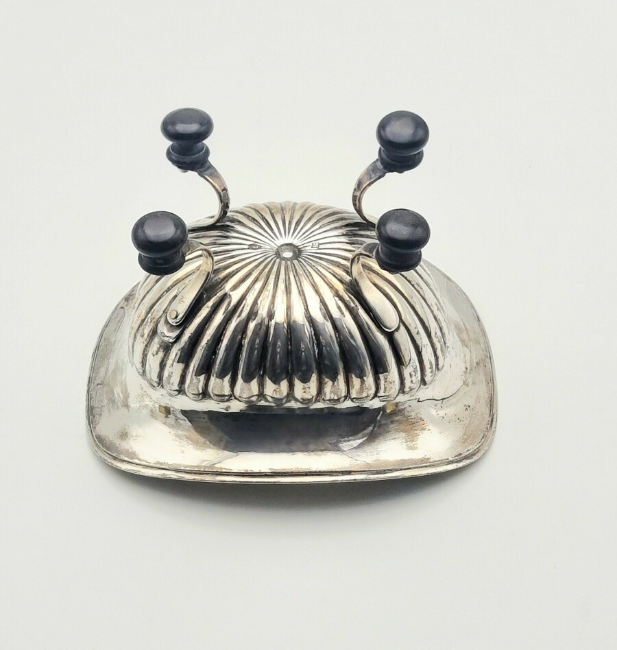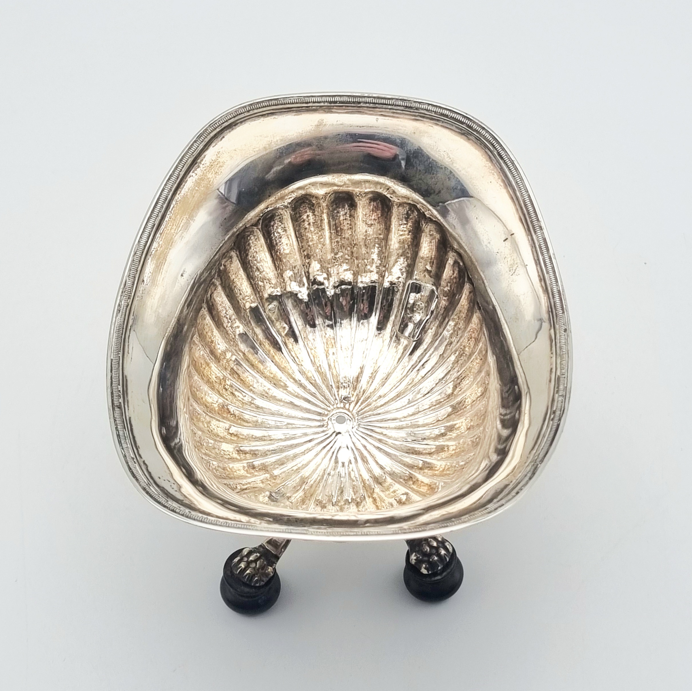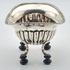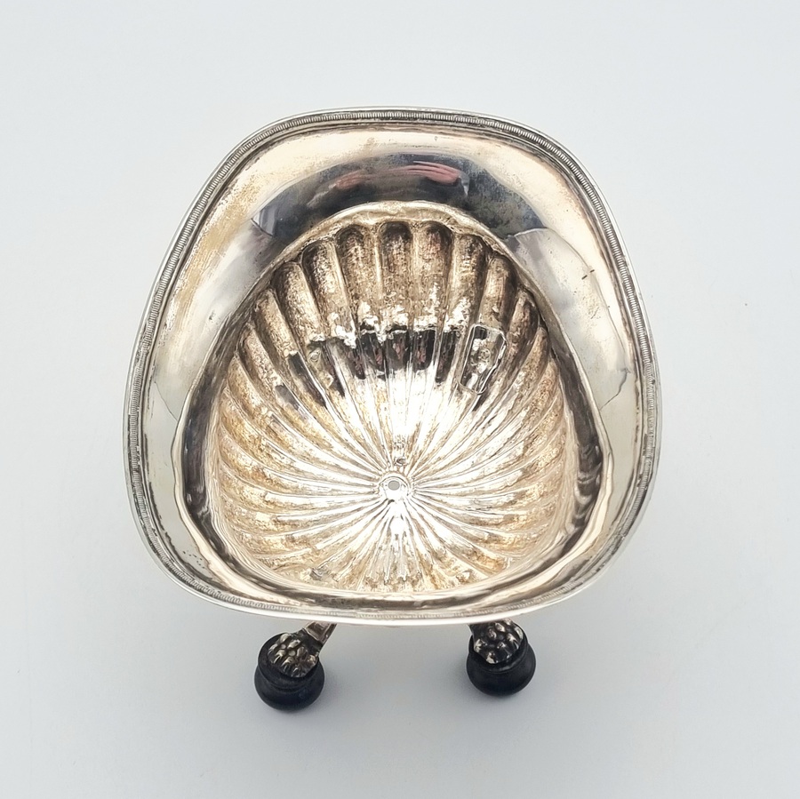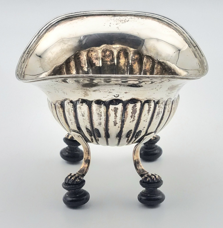 Zilveren pijpkomfoor van 835/1000 zilver, met Nederlandse keurmerken; meesterteken, de lopende leeuw 2, minervakop en jaarletter, uitgevoerd in een neoclassicistische stijl, circa 1820–1850. De ovale komfoor is versierd met gedreven cannelures en staat op vier korte pootjes met zwart houten knoppen. Registreer nu en bied eenvoudig online mee op deze pijpkomfoor. |