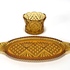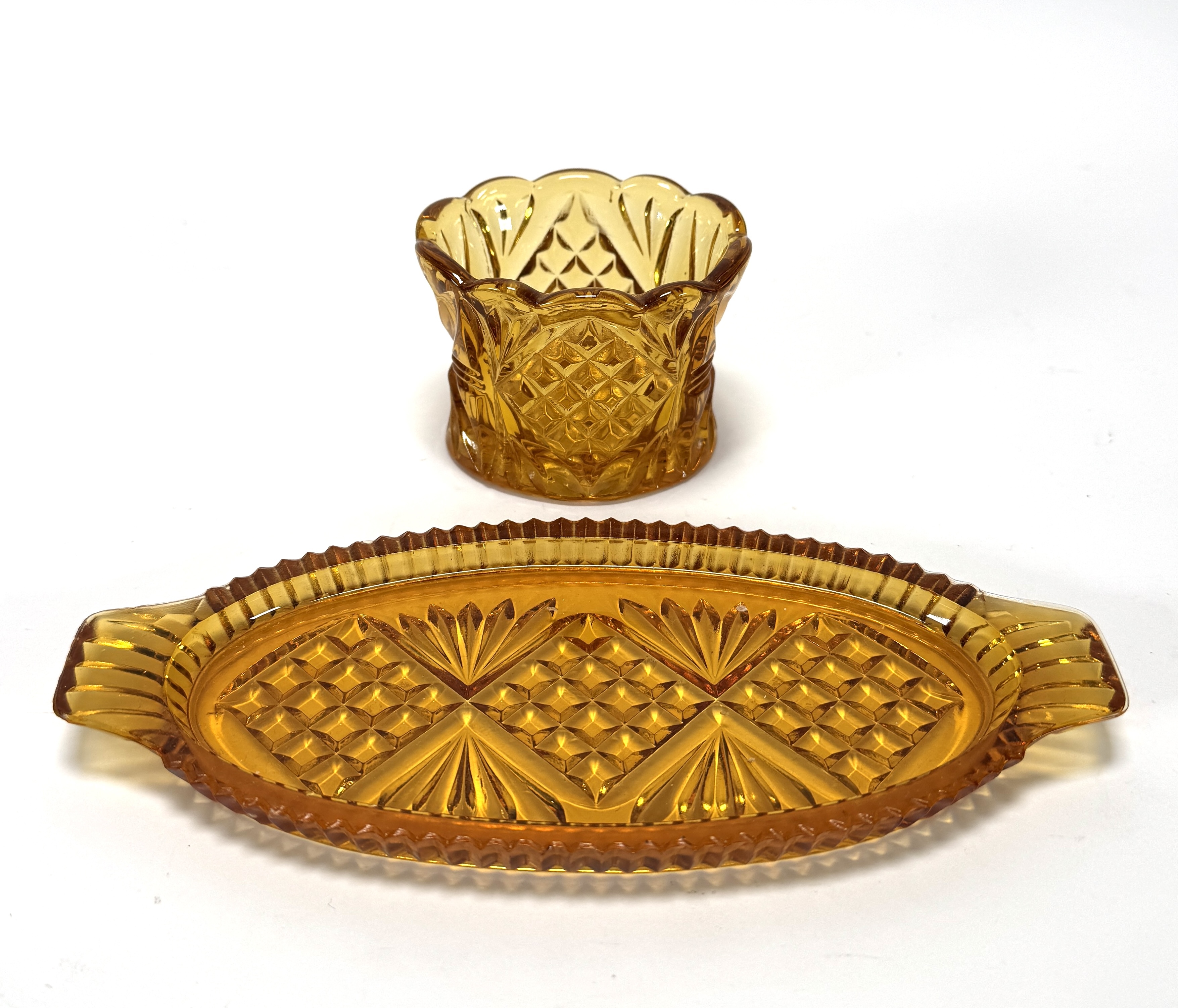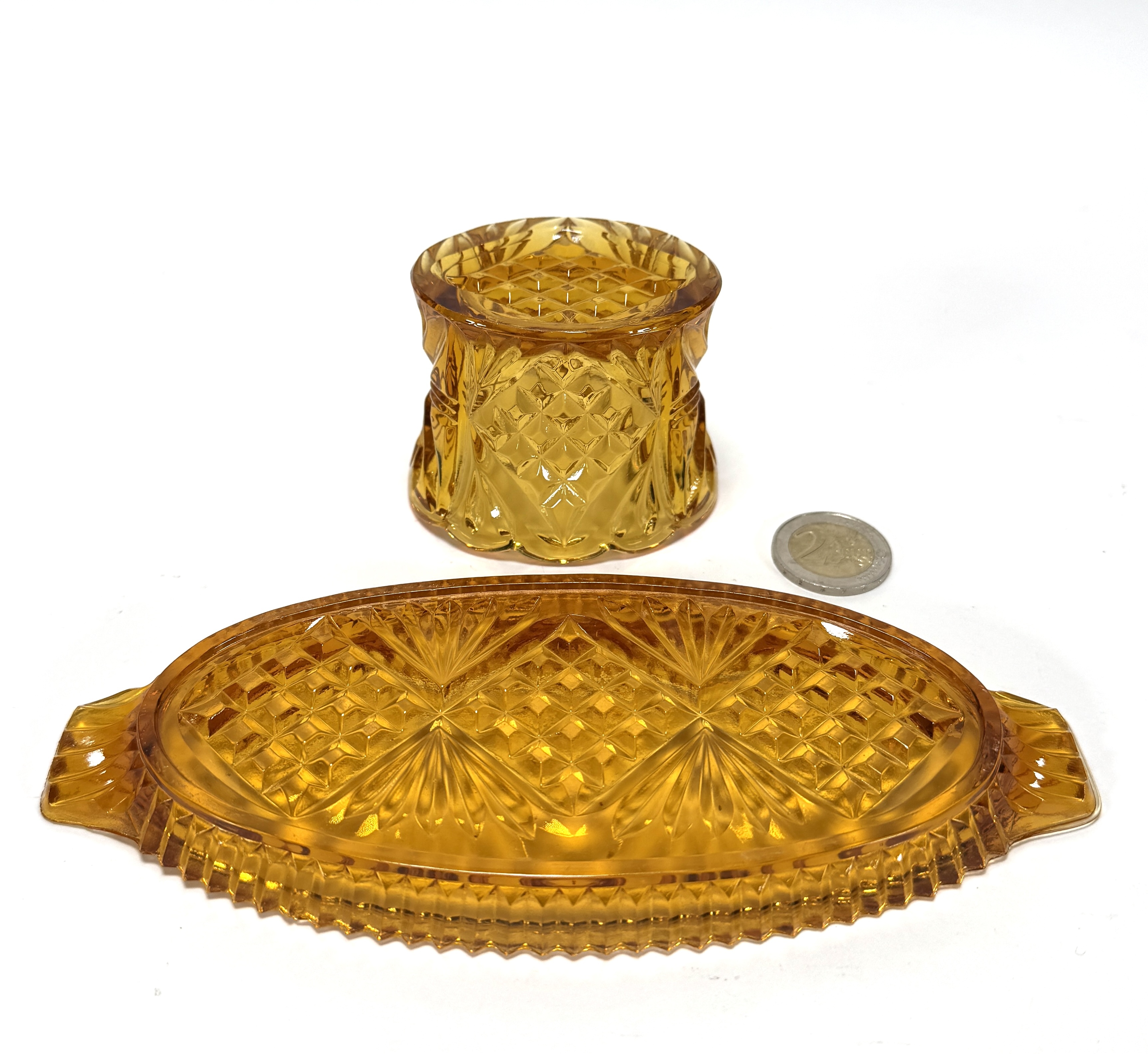 Art Deco amberkleurig persglas, vervaardigd eerste helft 20e eeuw, bestaand uit een ovaal serveerschaal met grepen en een lepelvaasje, beide gedecoreerd met waaiermotieven. Klaar om te bieden? Registreer je nu en doe mee aan de veiling! |