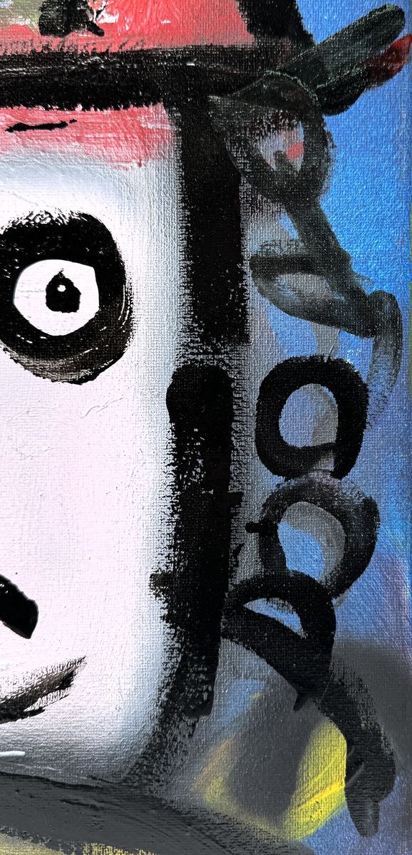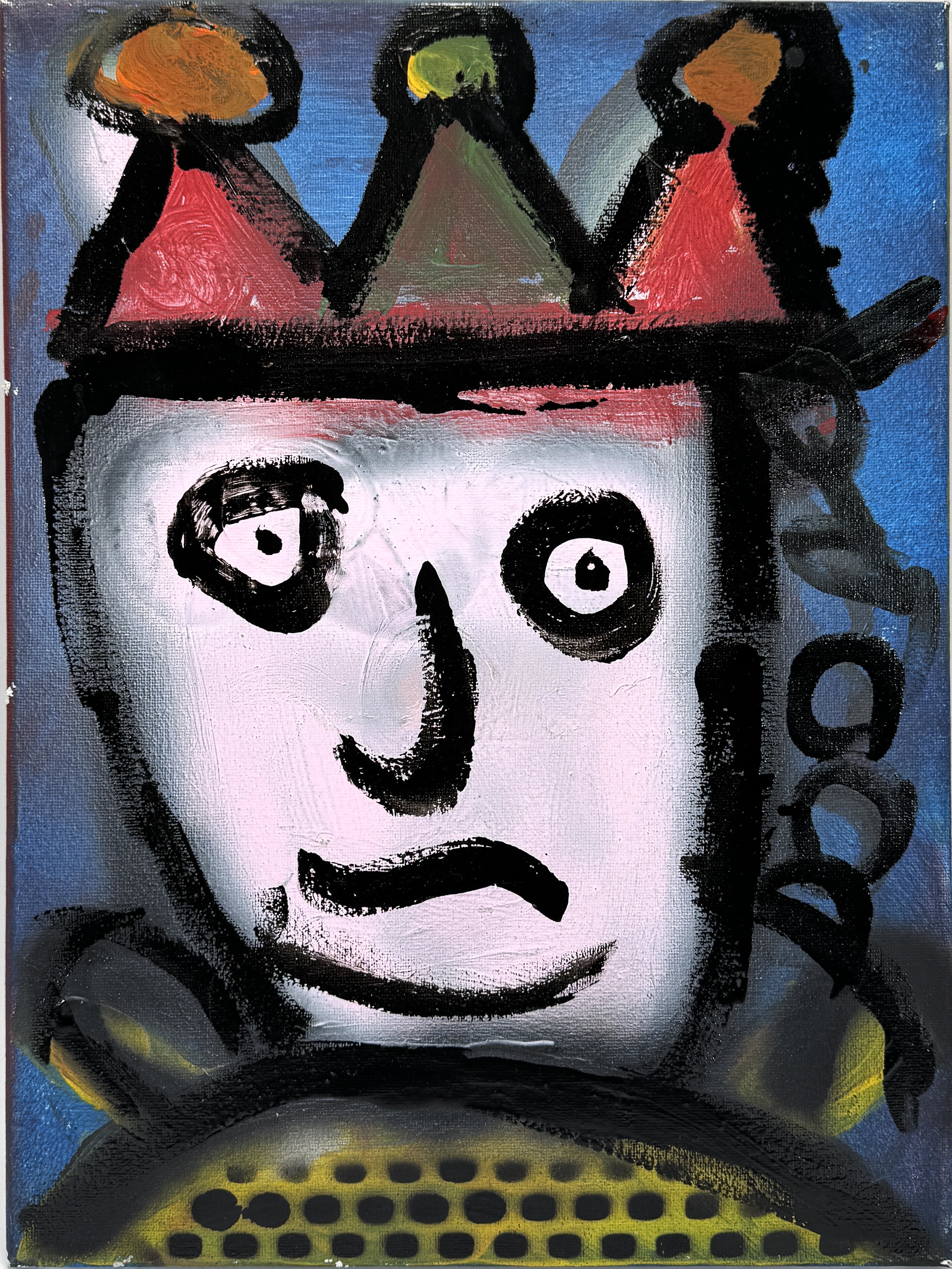 Acrylverfschilderij op doek in een expressieve stijl naar Herman Brood. Het werk toont een geabstraheerd figuur met kroon op een blauwe ondergrond. Voeg dit schilderij toe aan je verzameling en doe een bod! |