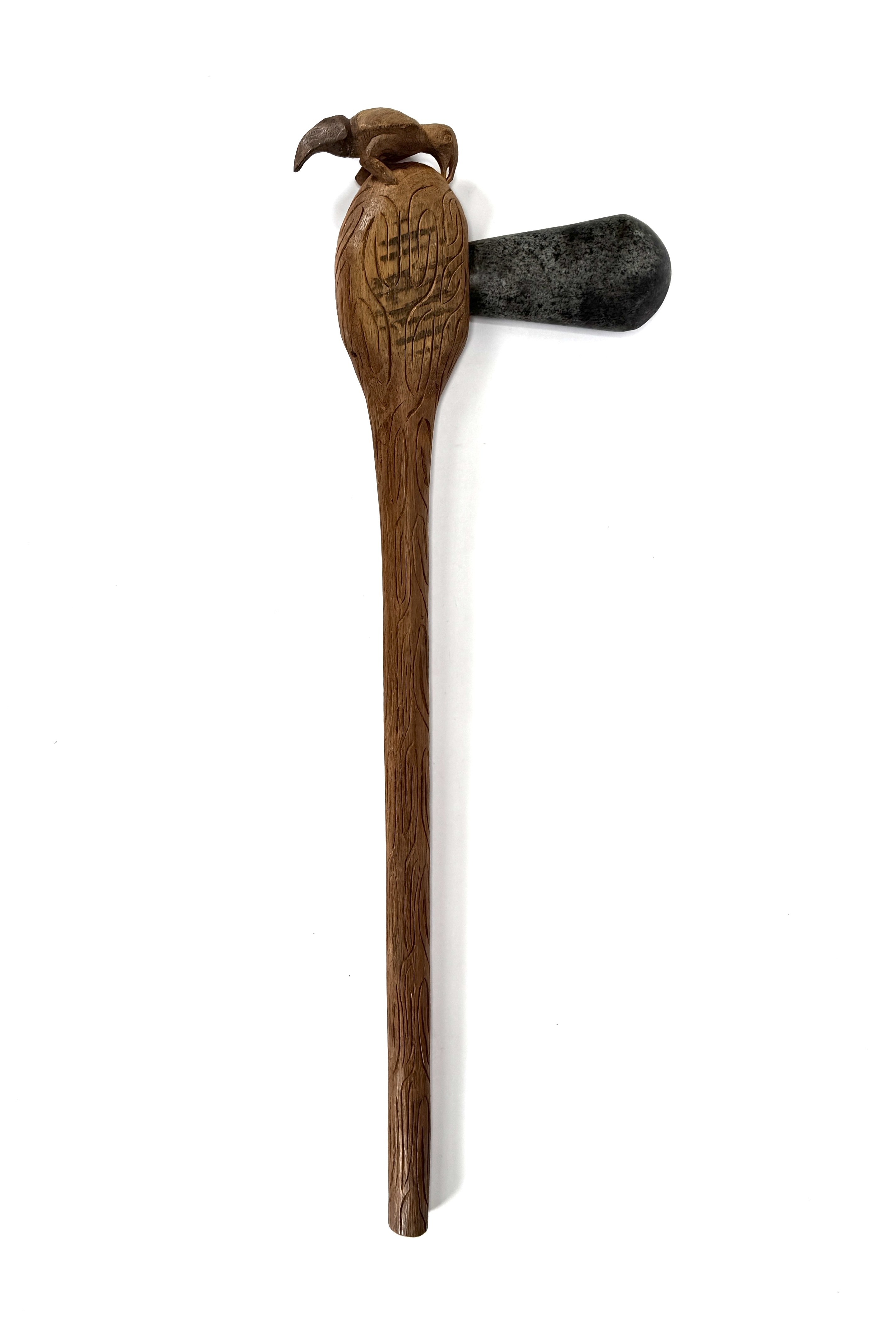 Houten ceremonieel bijl uit midden 20e eeuw, met gepolijste stenen kop en gesneden handvat voorzien van decoratieve graveringen en een dierfiguur op het uiteinde. Uit het Cepic gebied in Papua Nieuw Guinea. Het lange handvat is rijk versierd, de overgang steen-hout strak uitgevoerd. Geïnteresseerd? Bezoek onze kijkdagen op 28, 29 of 30 november van 11:00 tot 17:00 uur! |