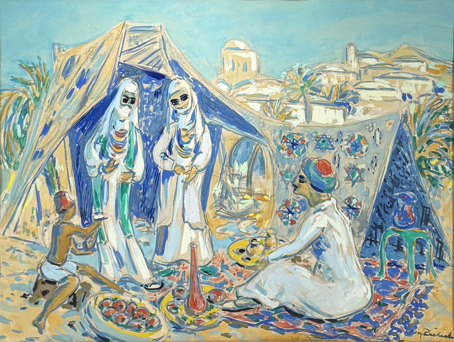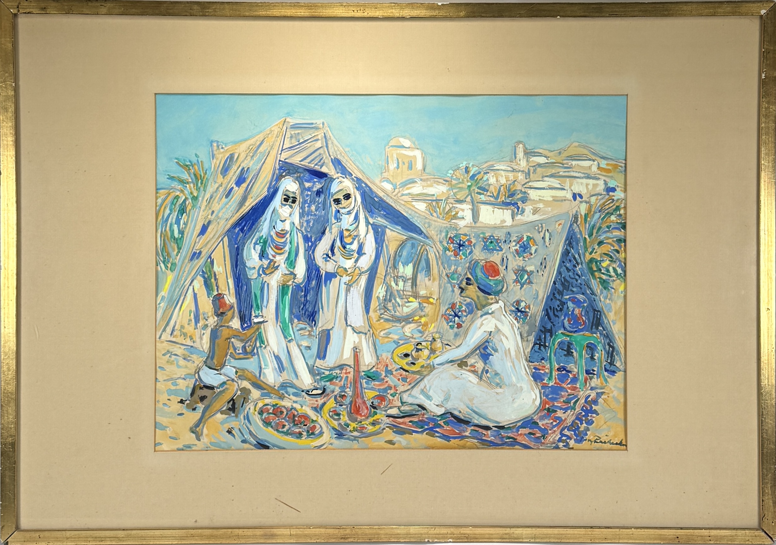 Gouache door Max Raedecker (1914–1987), uitgevoerd op papier, gesigneerd rechtsonder, voorstellend een kleurrijke marktscène met figuren voor een tent in Noord-Afrika, midden 20e eeuw. Het losse penseelwerk en het levendige kleurgebruik van deze Nederlandse schilder zijn kenmerkend voor zijn naoorlogse werk en zijn thematische reizen. Kom langs tijdens de kijkdagen (28 t/m 30 november) en ontdek deze gouache zelf! |