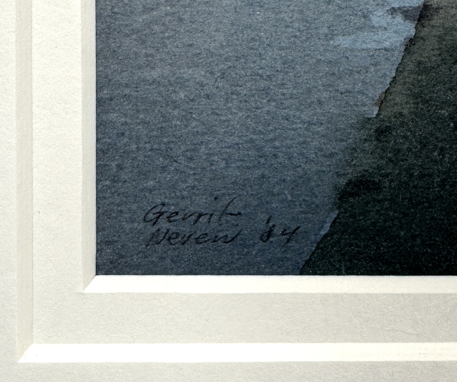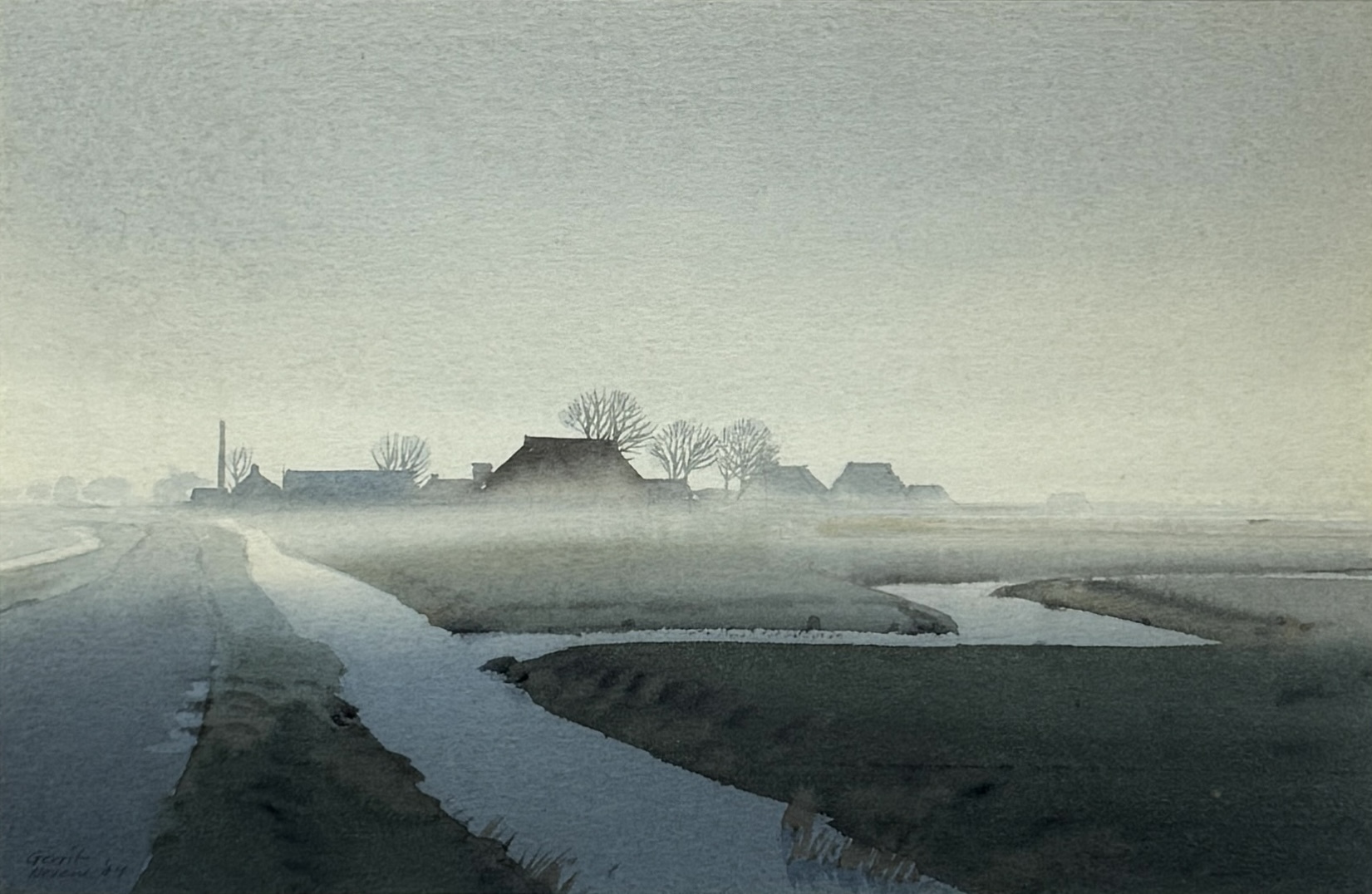 Aquarel op papier, uitgevoerd in lyrisch impressionistische stijl door de Nederlandse kunstenaar Gerrit Neven (1939-2022). Het werk uit 1984 toont een mistig polderlandschap met een waterloop, boerderijen en bomen op de horizon. Linksonder gesigneerd en gedateerd.. Wil je dit schilderij in het echt bekijken? Kom naar de kijkdagen op 28, 29 en 30 november! |