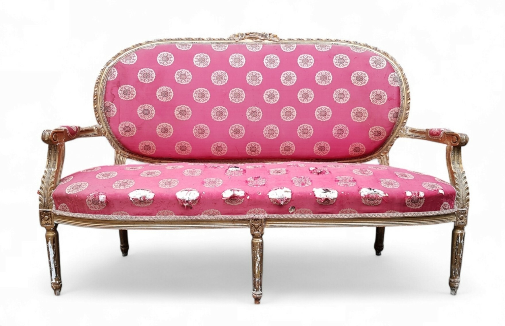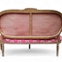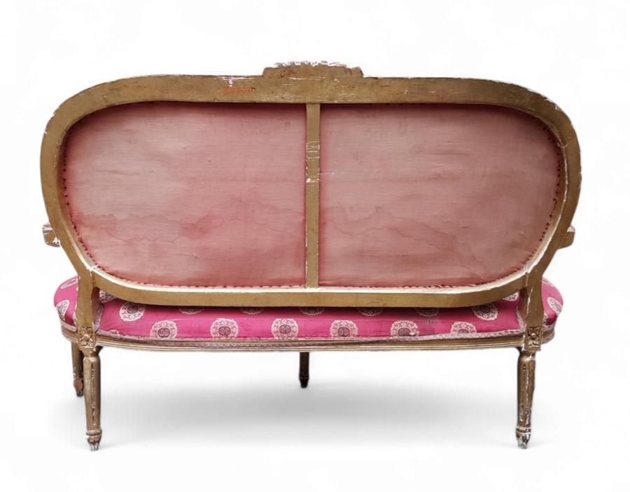 Neo-Lodewijk XVI stijl zitbank uitgevoerd in goudkleurig beschilderd hout met houtsnijwerk en gestoffeerd textiel, tweede helft 20e eeuw. Kenmerkend zijn de cannelures op de taps toelopende poten, de symmetrische vormgeving en het roze textiel met cirkelpatroon dat schade aan de zitting vertoont. Het meubel vereist restauratie van zowel frame als bekleding. Klaar om te bieden? Registreer je nu en doe mee aan de veiling! |