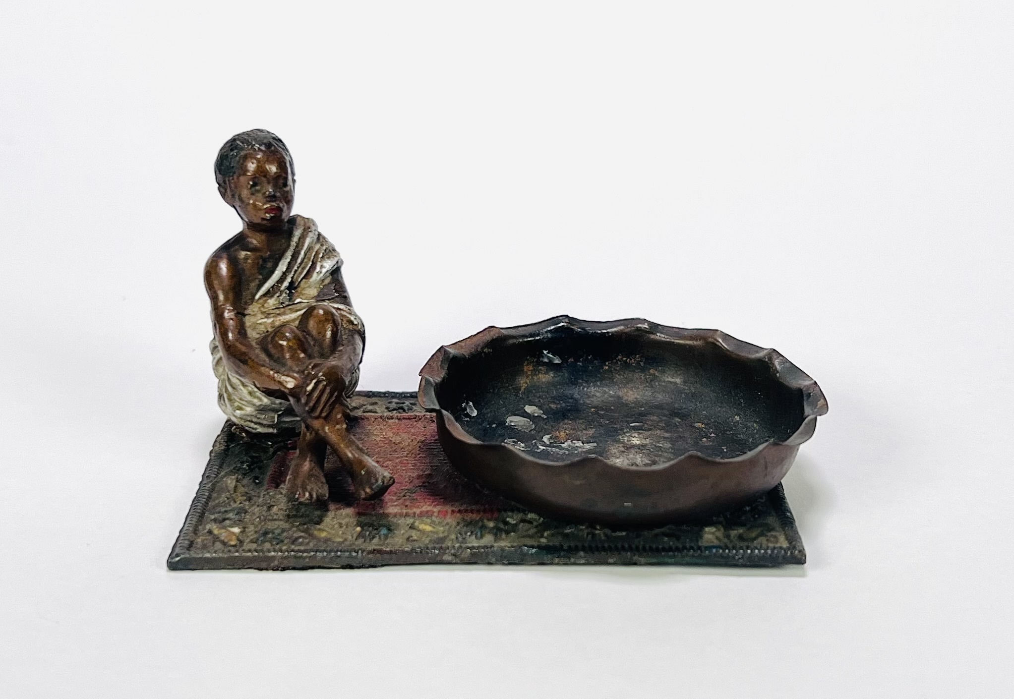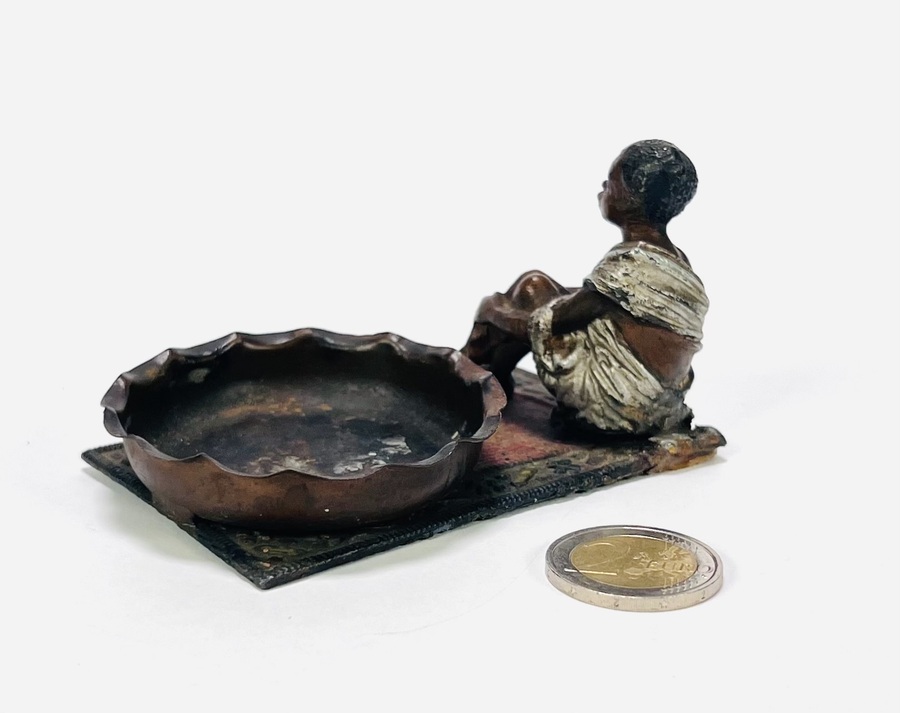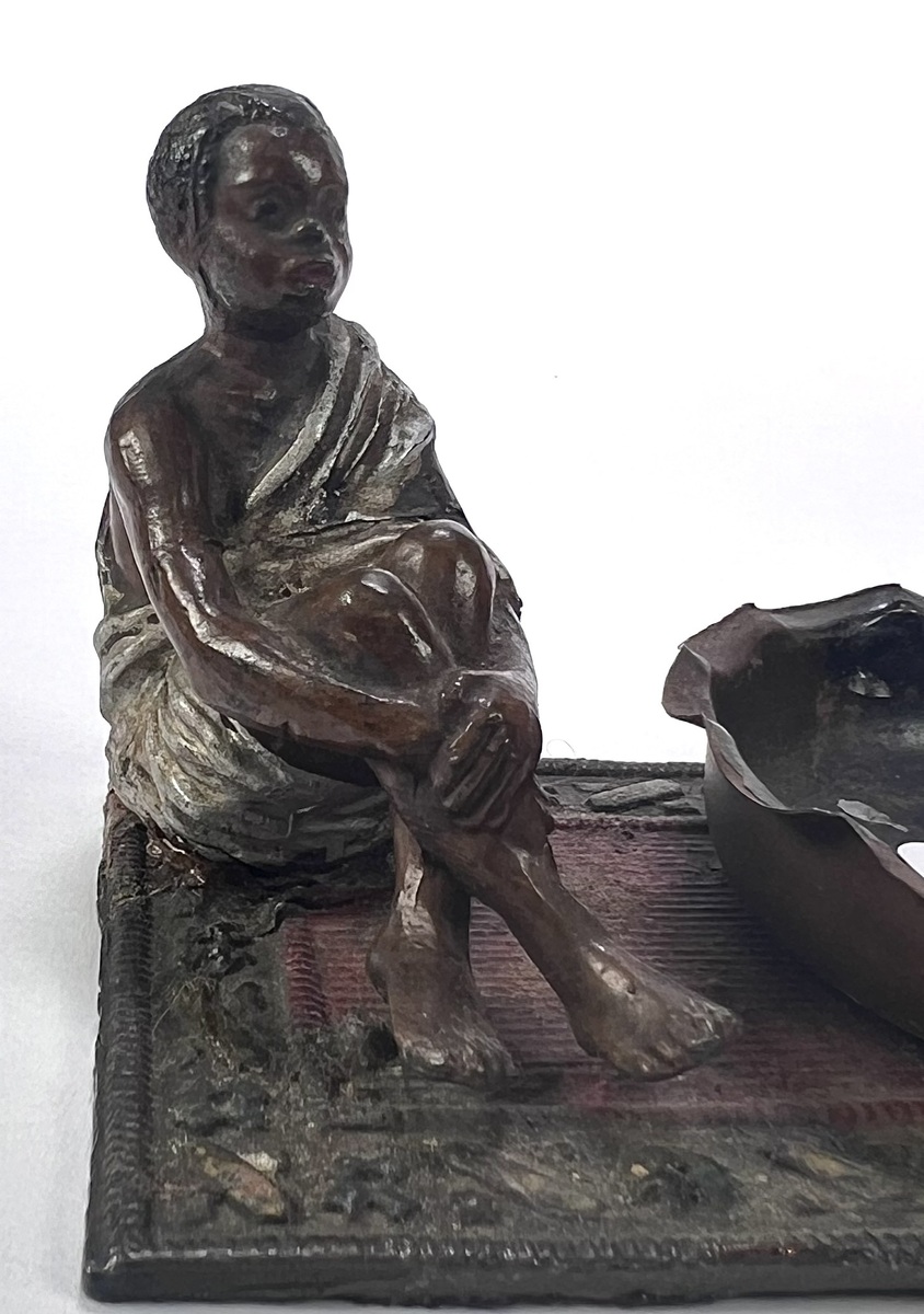 Wit metalen gegoten beeld met zittende jongen in wit gewaad naast een gegolfde, ovale schaal, begin 20e eeuw. Uitgevoerd in gepatineerd en gepolychromeerd metaal op een voetplaat met tapijtdecor. Weense stijl met koloniale invloeden, ongesigneerd. Wil je direct deelnemen? Plaats vanaf 22 augustus alvast een schriftelijk bod via onze website! |