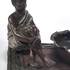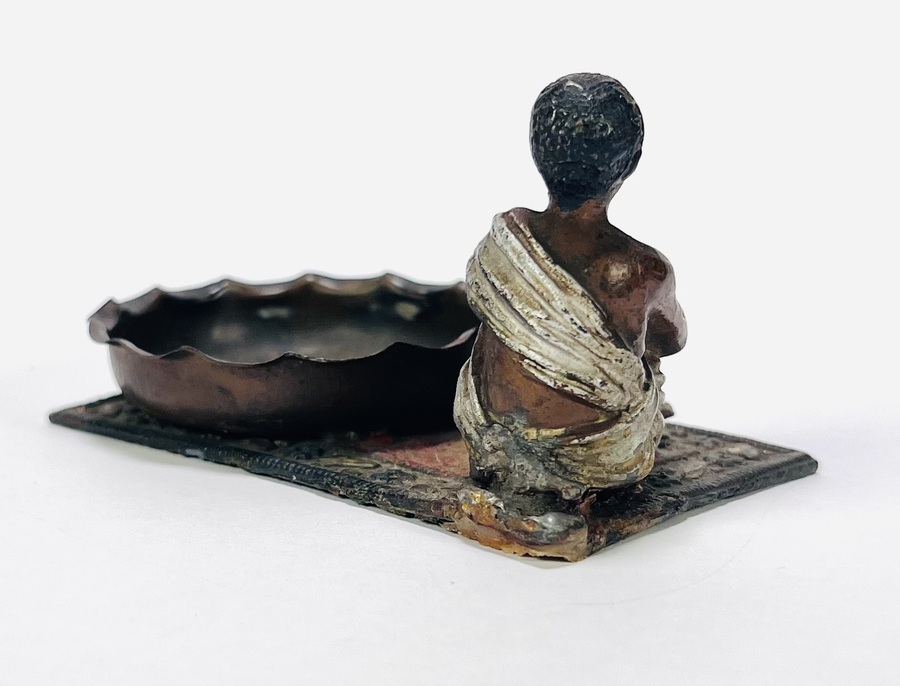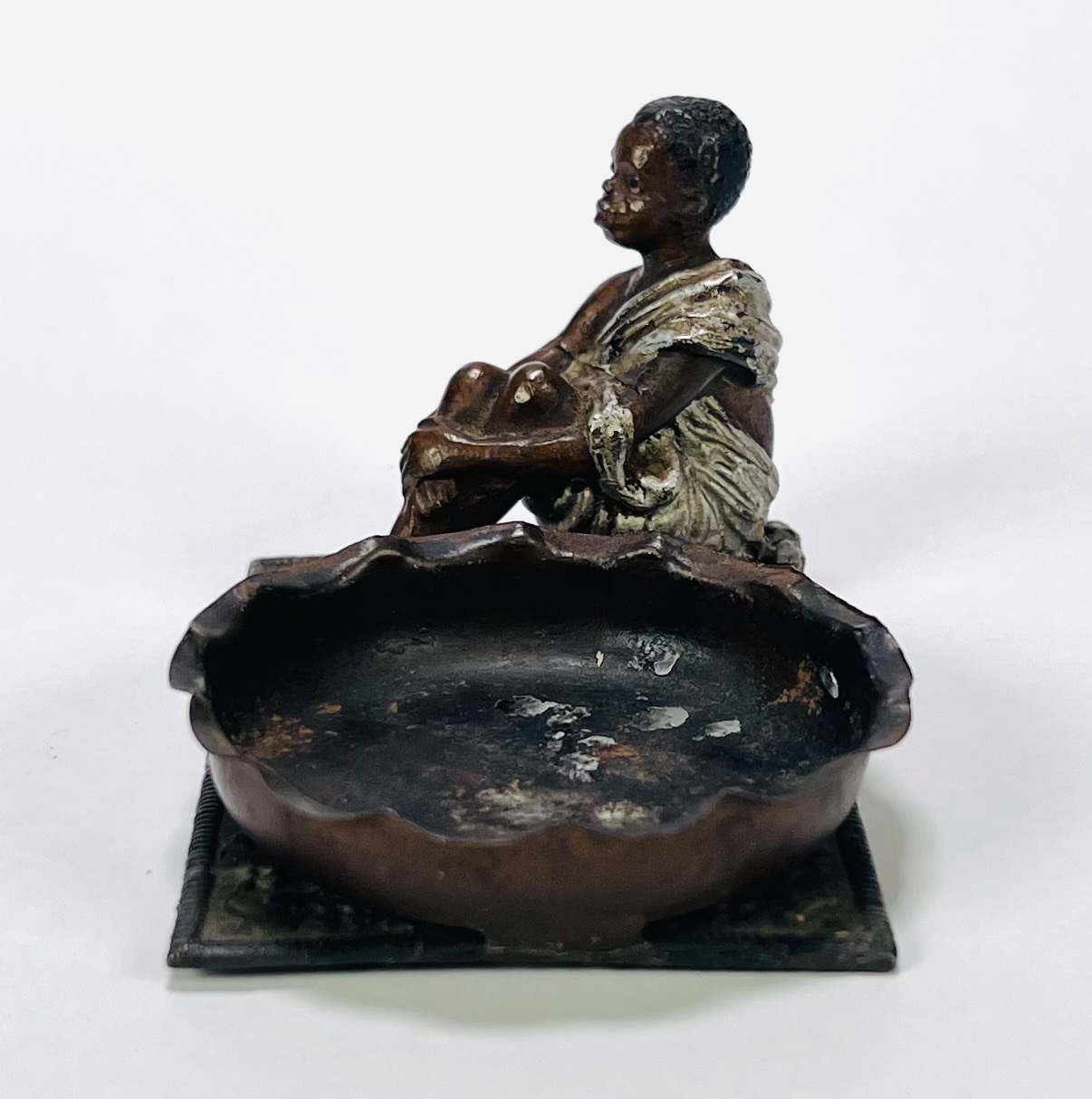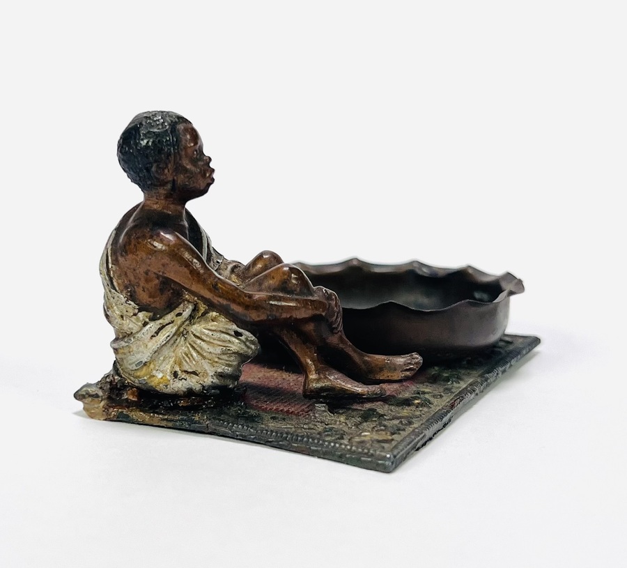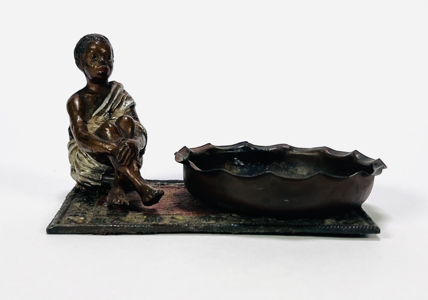 Wit metalen gegoten beeld met zittende jongen in wit gewaad naast een gegolfde, ovale schaal, begin 20e eeuw. Uitgevoerd in gepatineerd en gepolychromeerd metaal op een voetplaat met tapijtdecor. Weense stijl met koloniale invloeden, ongesigneerd. Wil je direct deelnemen? Plaats vanaf 22 augustus alvast een schriftelijk bod via onze website! |