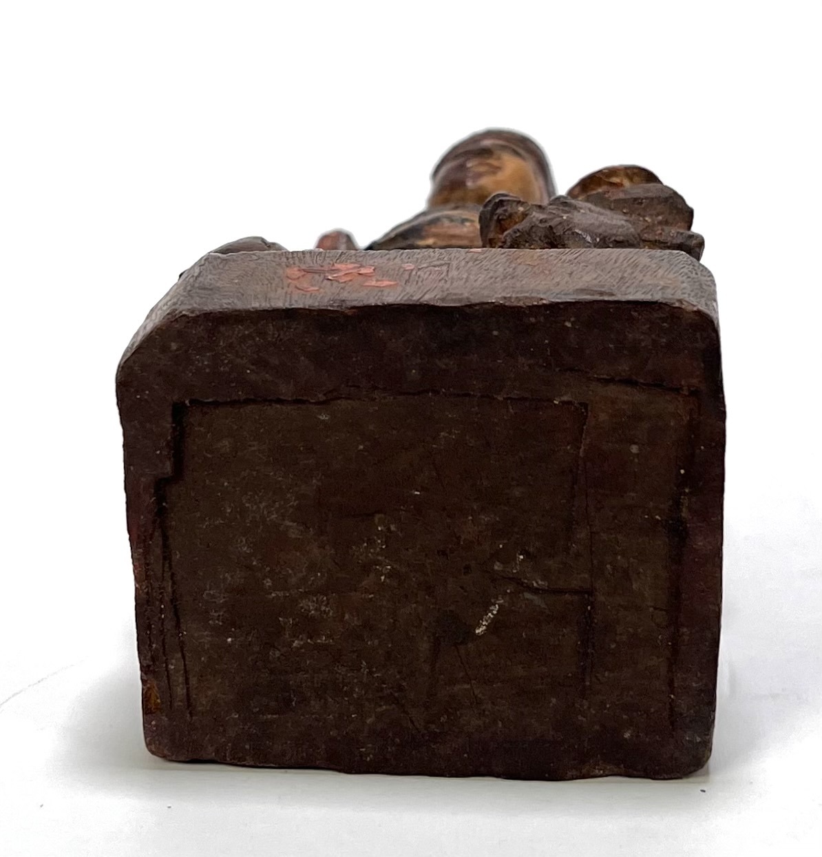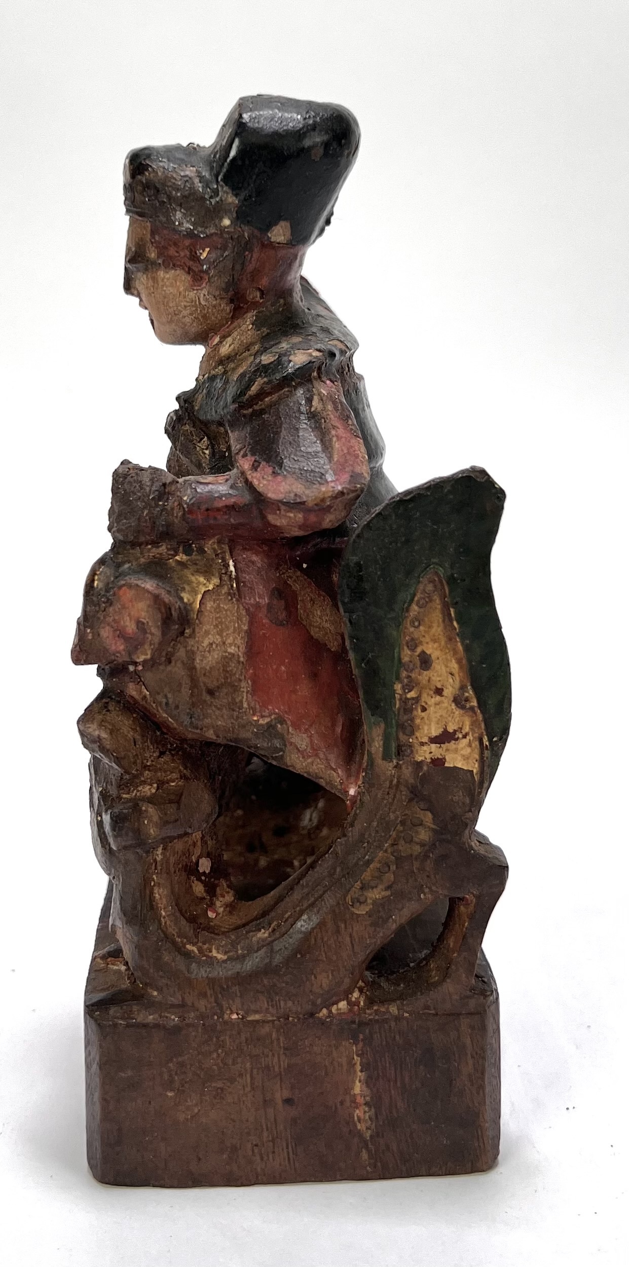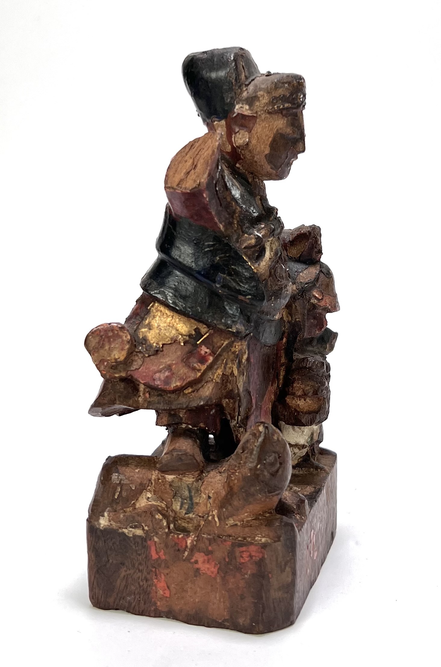 Traditioneel Chinees beeld van hout, handmatig gesneden en afgewerkt met polychrome verf en restanten van bladgoud. Het beeld stelt een gepantserde krijger voor, geflankeerd door een Shishi-figuur aan zijn voeten, daterend einde van de 19e. Ontdek dit beeld en voeg het toe aan jouw collectie! Registreer nu voor de veiling. |