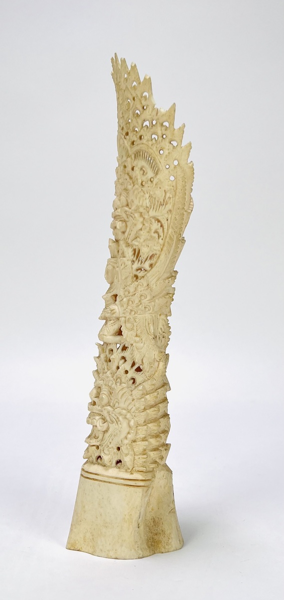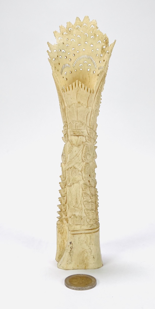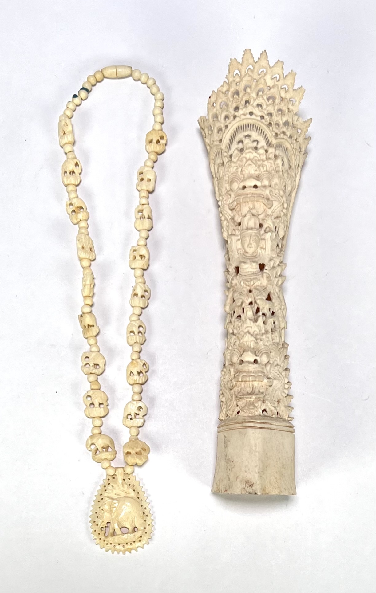 Twee benen Indonesische snijwerken, tweede helft 20e eeuw. Het betreft een opengewerkte beeld met gestapelde mythische figuren en een ketting met kralen en hanger met een afbeelding van een olifant, uitgevoerd in een zeer gedetailleerde Balinese stijl. Klaar om te bieden? Registreer je nu en doe mee aan de veiling! |