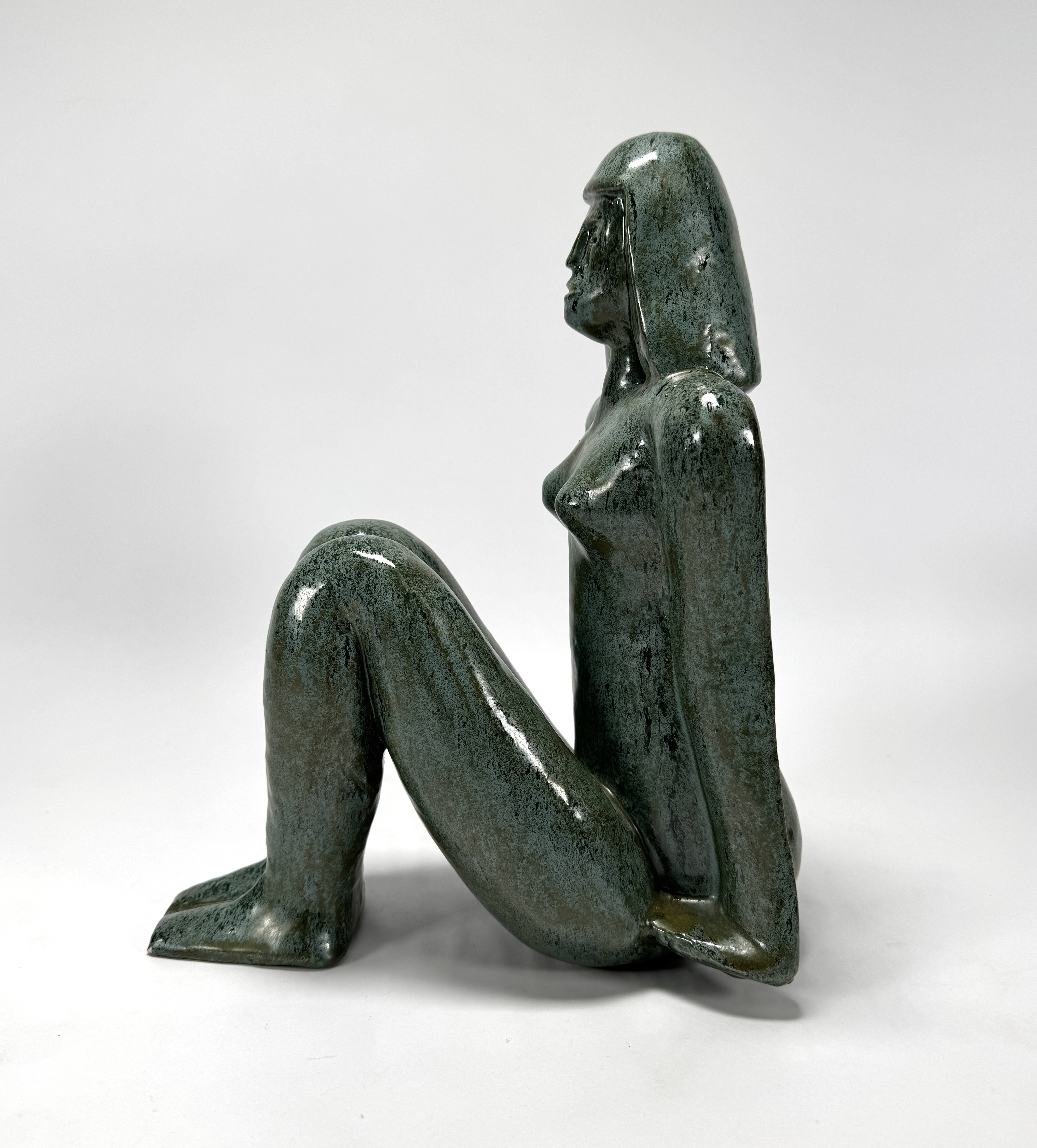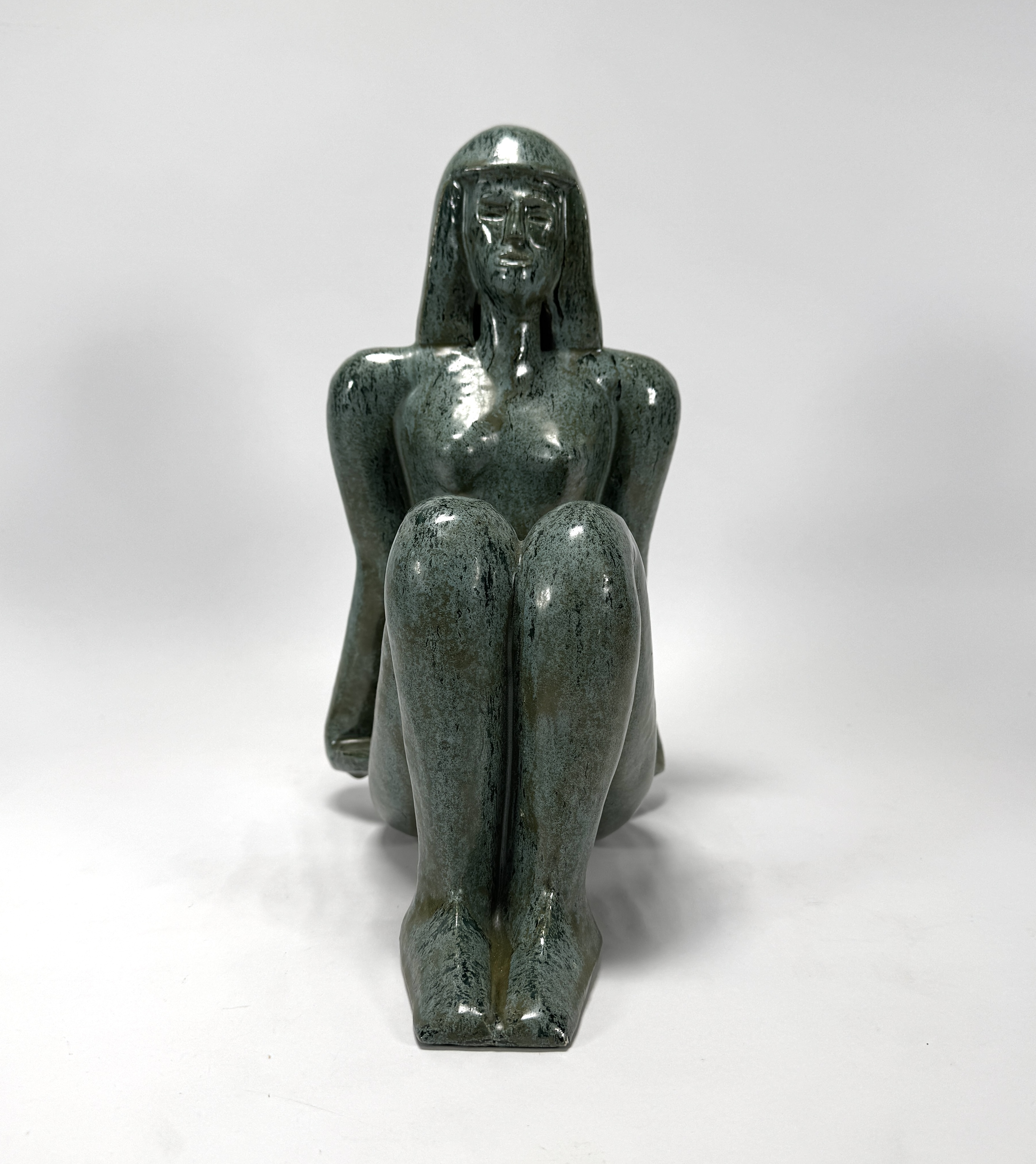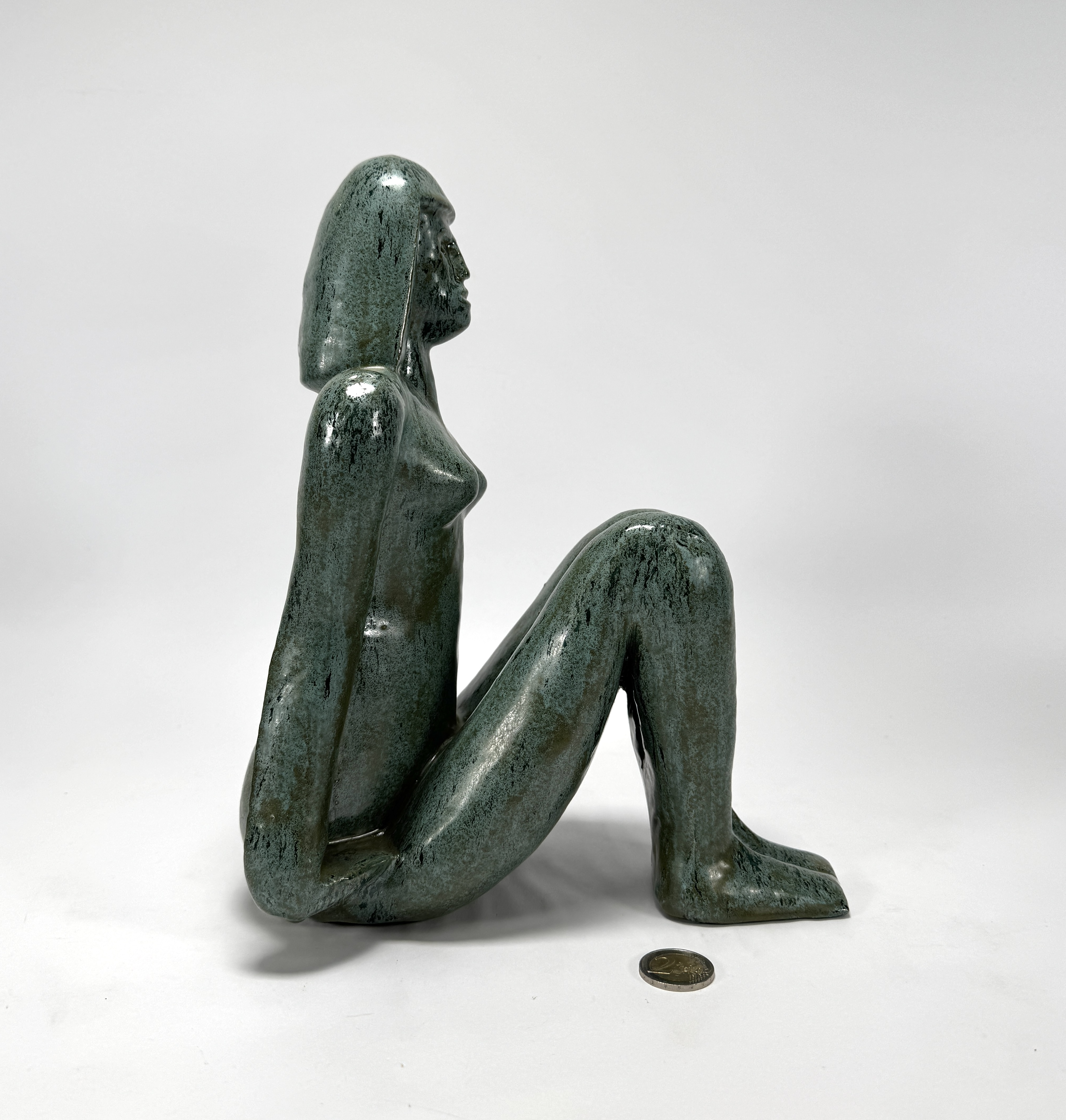 Keramiek beeld in de figuratief modernistische stijl, gedateerd ca. 1950–1990, gevormd door gieten in mal, met een gestileerde weergave van een zittende vrouwelijke figuur met gesloten houding. De vormgeving kenmerkt zich door strakke contouren en geometrische afvlakking van de ledematen. Het beeld is afgewerkt met een groenblauw glansglazuur. Klaar om te bieden? Registreer je nu en doe mee aan de veiling! |