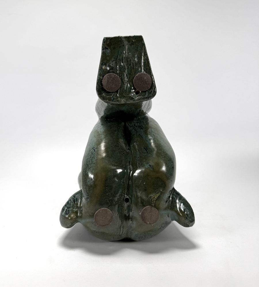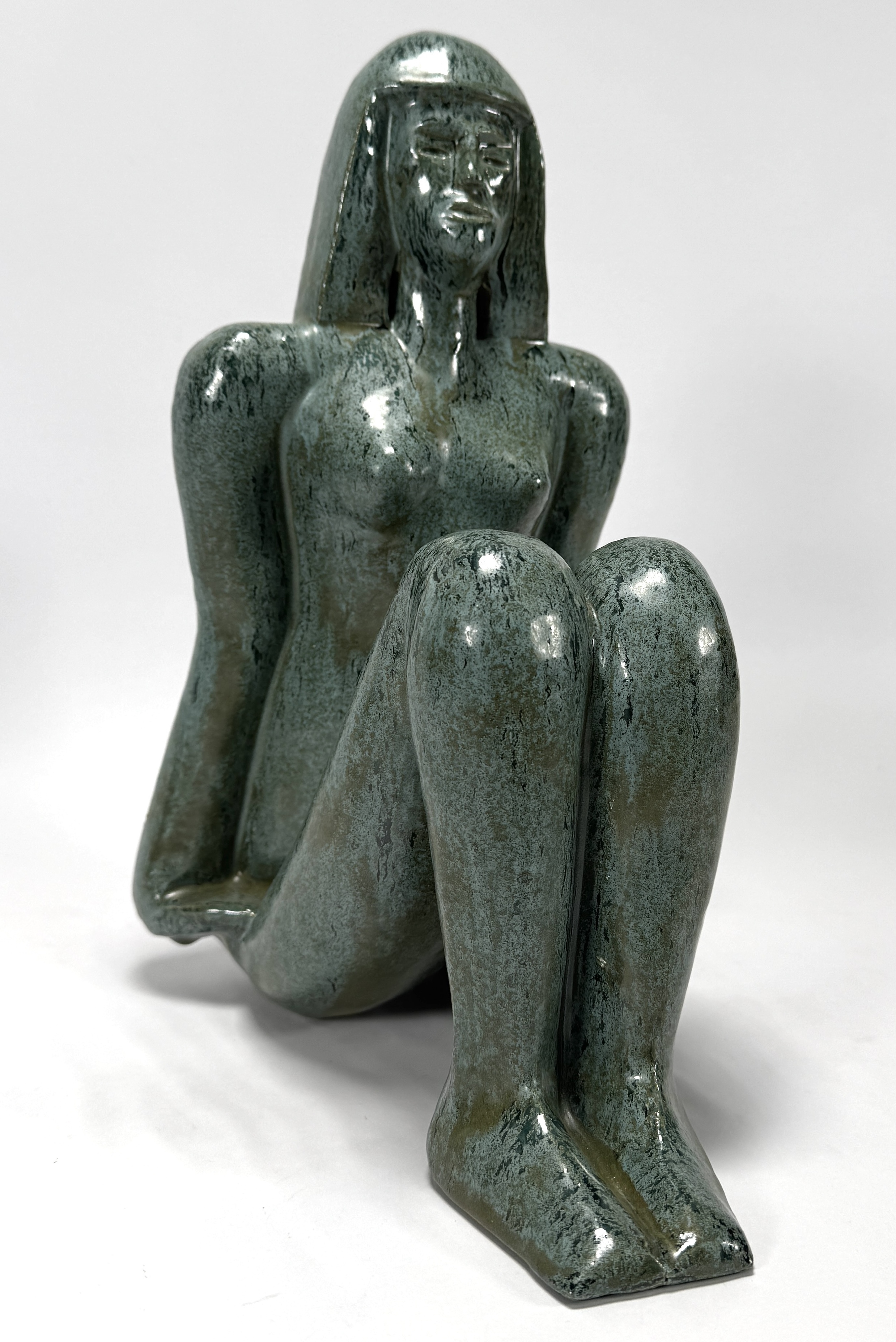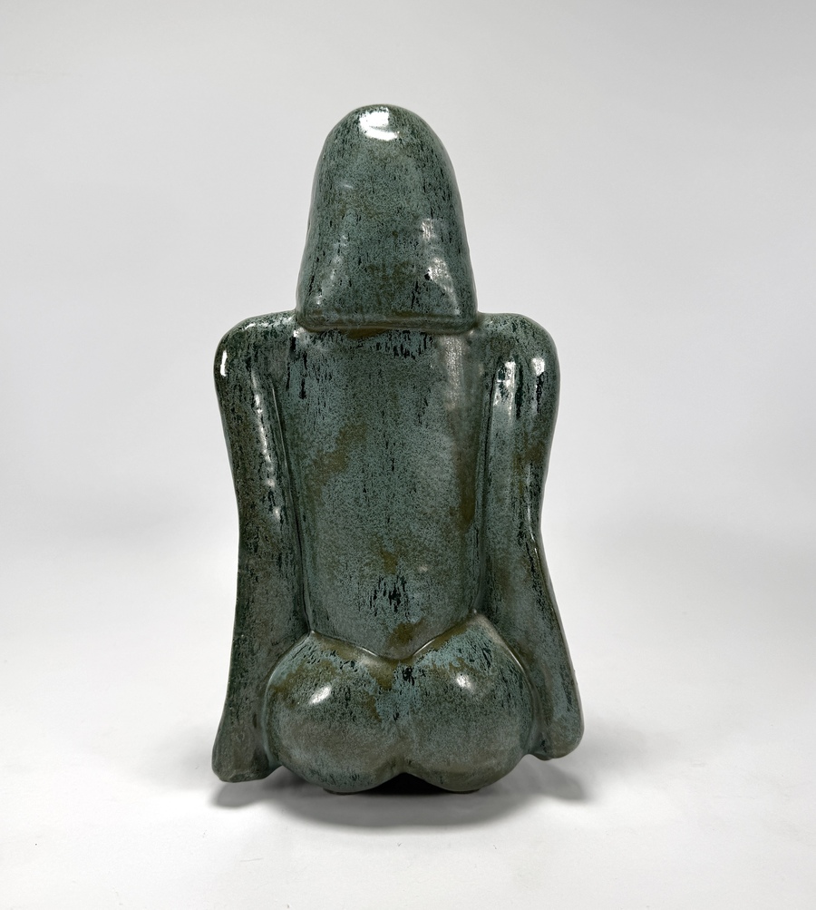 Keramiek beeld in de figuratief modernistische stijl, gedateerd ca. 1950–1990, gevormd door gieten in mal, met een gestileerde weergave van een zittende vrouwelijke figuur met gesloten houding. De vormgeving kenmerkt zich door strakke contouren en geometrische afvlakking van de ledematen. Het beeld is afgewerkt met een groenblauw glansglazuur. Klaar om te bieden? Registreer je nu en doe mee aan de veiling! |