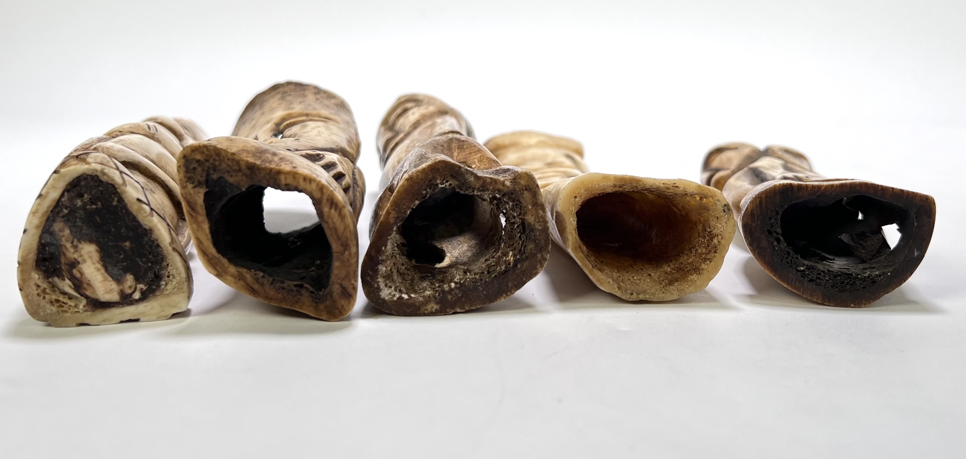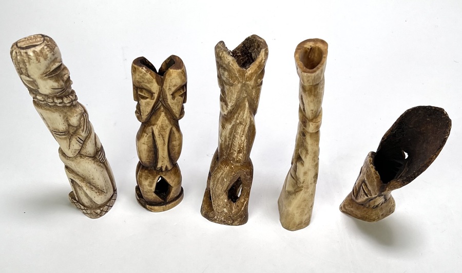Vijf tribale beelden vervaardigd uit been, Centraal-Afrika. De figuren zijn langwerpig en gestileerd met typische kenmerken van de Kongo Vili of Yombe culturele traditie, waaronder een dubbelhoofdige voorstelling. Datering is circa midden 20e eeuw. Kom langs tijdens de kijkdagen (28 t/m 30 november) en ontdek deze stoelklok zelf! |