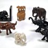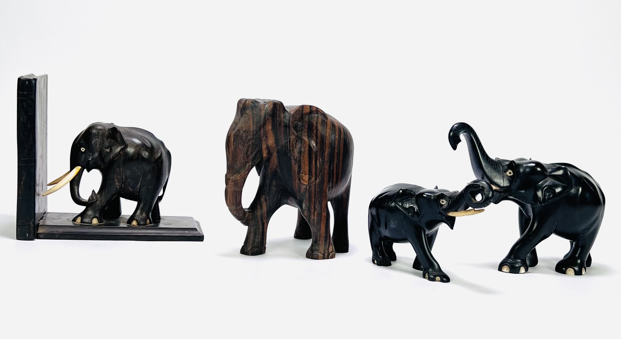 Aziatisch figuratief snijwerk bestaande uit zes beelden en een boekensteun, daterend circa 1950–1980. De beelden zijn vervaardigd uit hardhout en steen door middel van handsnijwerk. Het kavel omvat meerdere olifanten, een buffel en een olifant met howdah. Een olifant is gesneden uit witte steen.