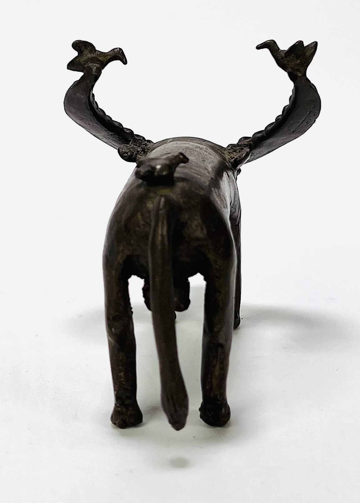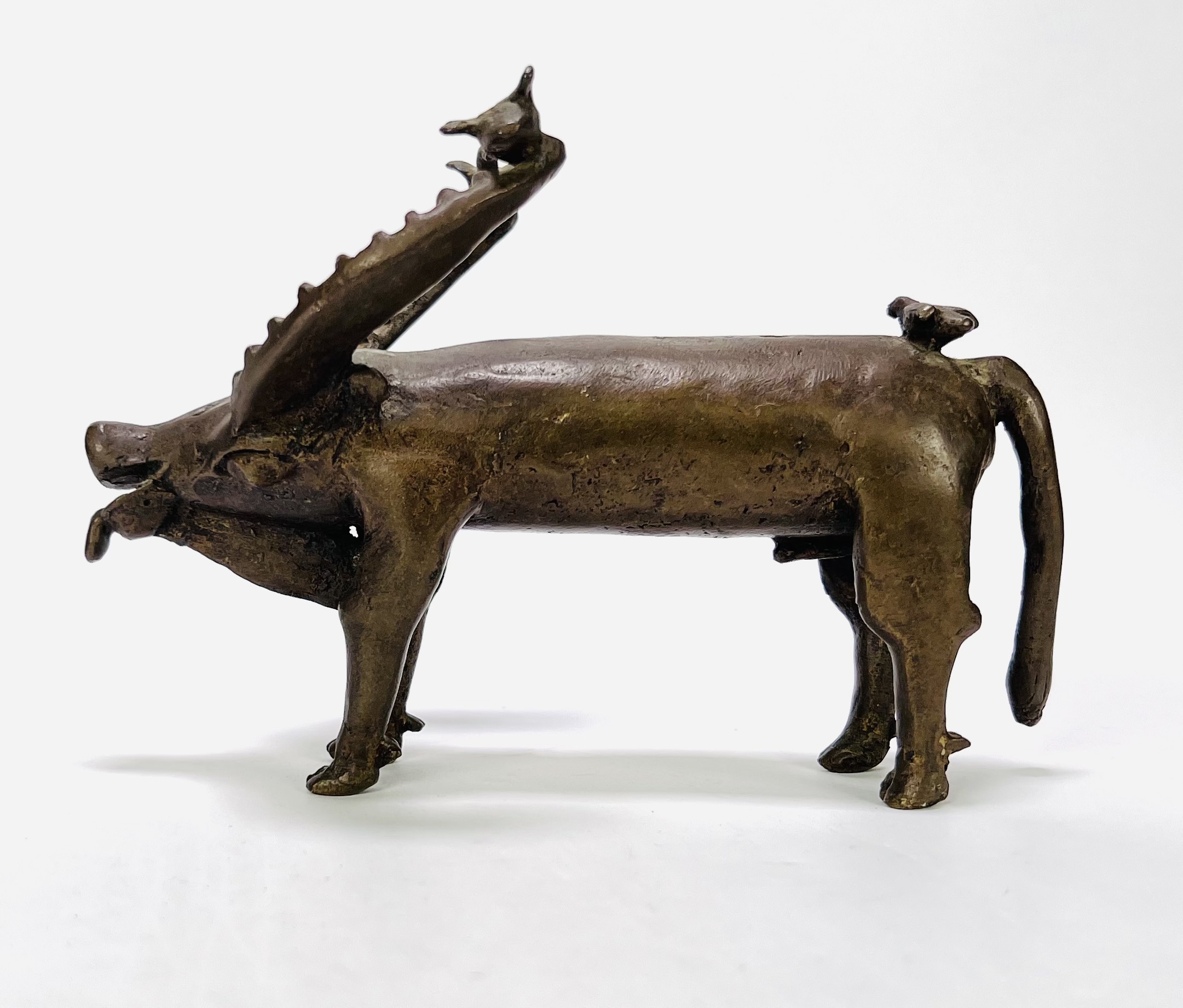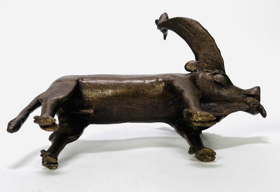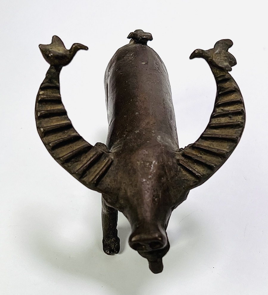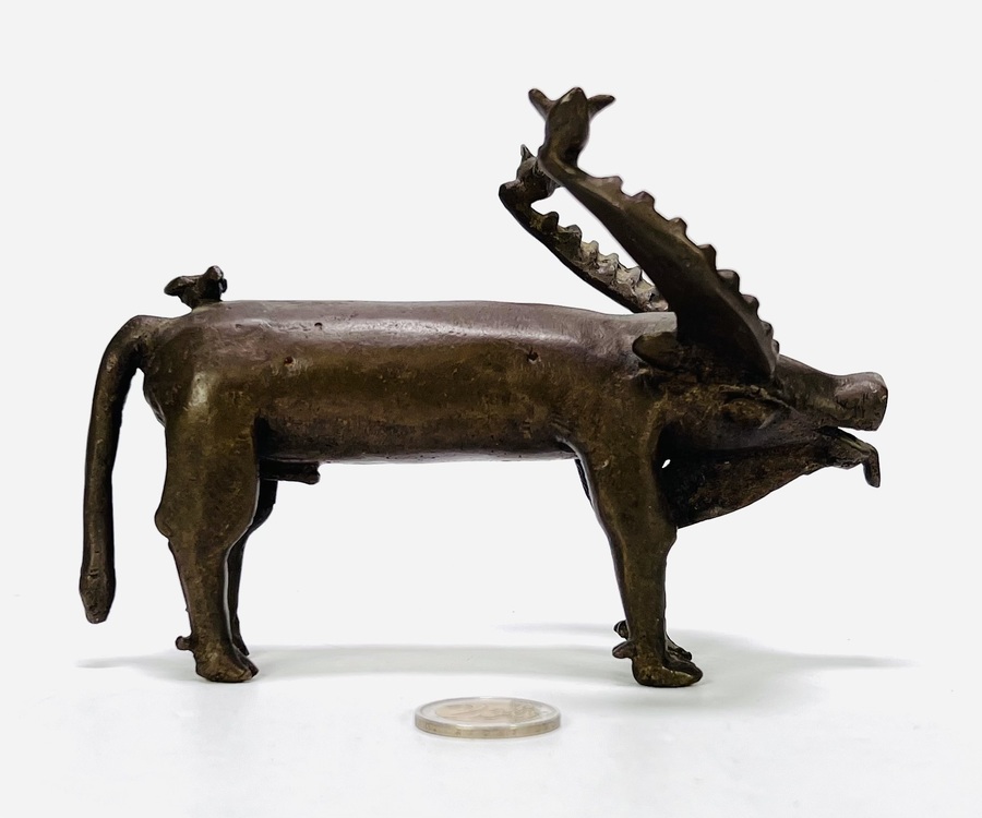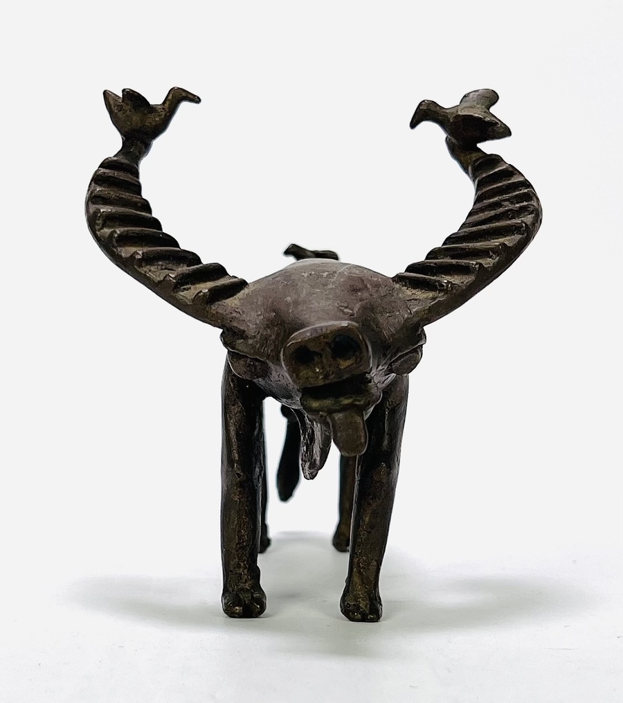 Donker gepatineerd bronzen beeld van een waterbuffel met vogels uit West-Afrika, vervaardigd met de traditionele cire perdue giettechniek. Het beeld heeft grote, geribbelde hoorns met gestileerde vogelfiguren aan de uiteinden, in een stijl verwant aan de Benin traditie en dateert uit de midden 20e eeuw. Kom langs tijdens de kijkdagen (28 t/m 30 november) en ontdek dit beeld zelf! |