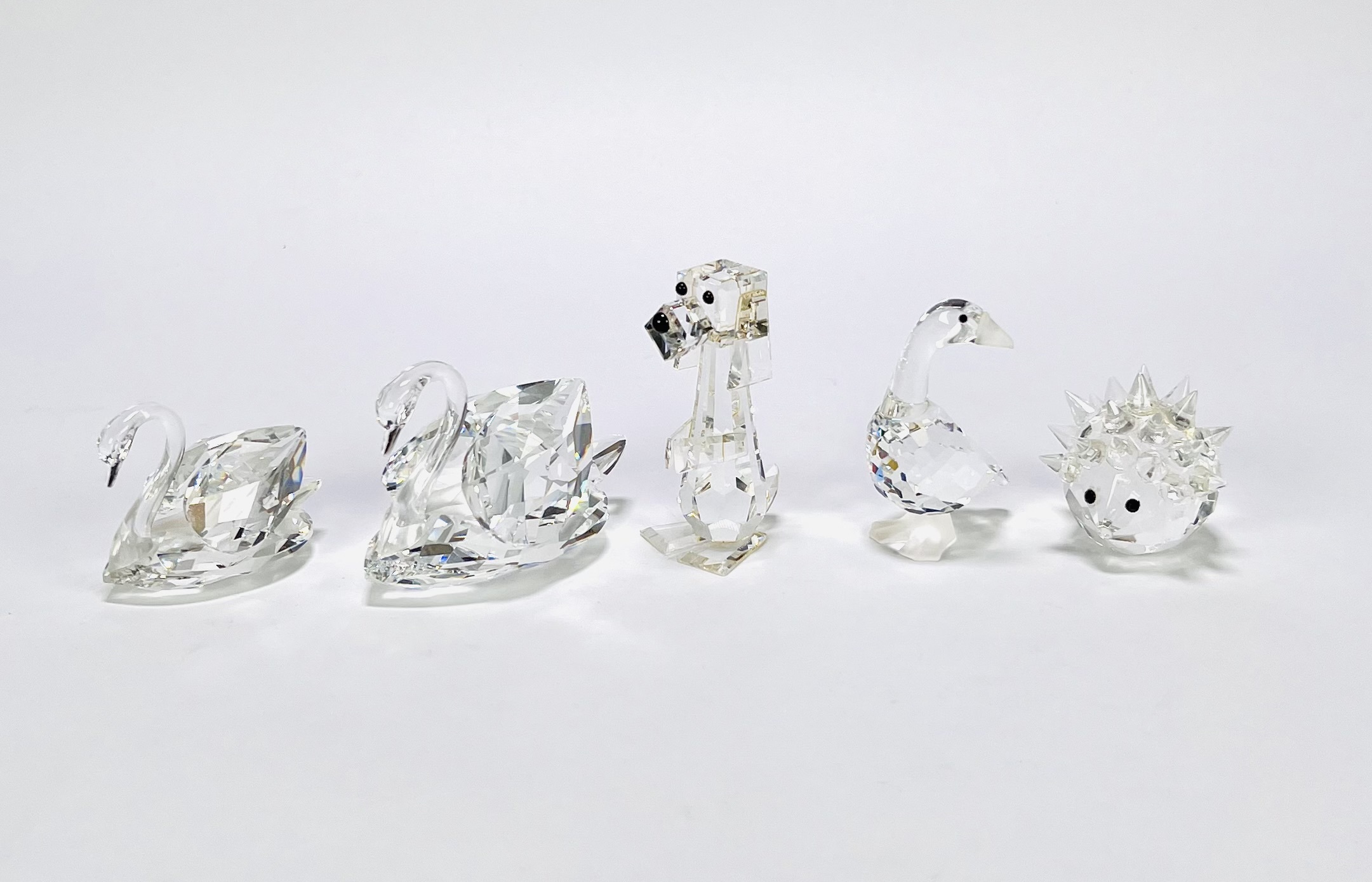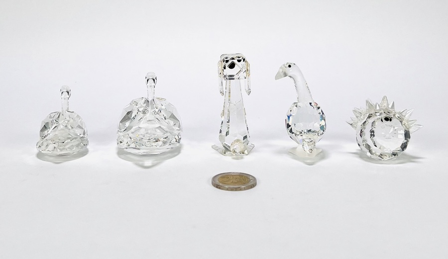 Vijf gefacetteerde beeldjes vervaardigd uit kristalglas door de Oostenrijkse fabrikant Swarovski. De collectie is uit circa 1980–2000 en omvat figuren van twee zwanen, een hond, een gans en een egel. De beeldjes zijn uitgevoerd in een geometrische stijl en vier beeldjes zijn aan de onderkant gegraveerd Swarovski. Registreer nu en bied eenvoudig online mee op deze Swarovksi beeldjes. |