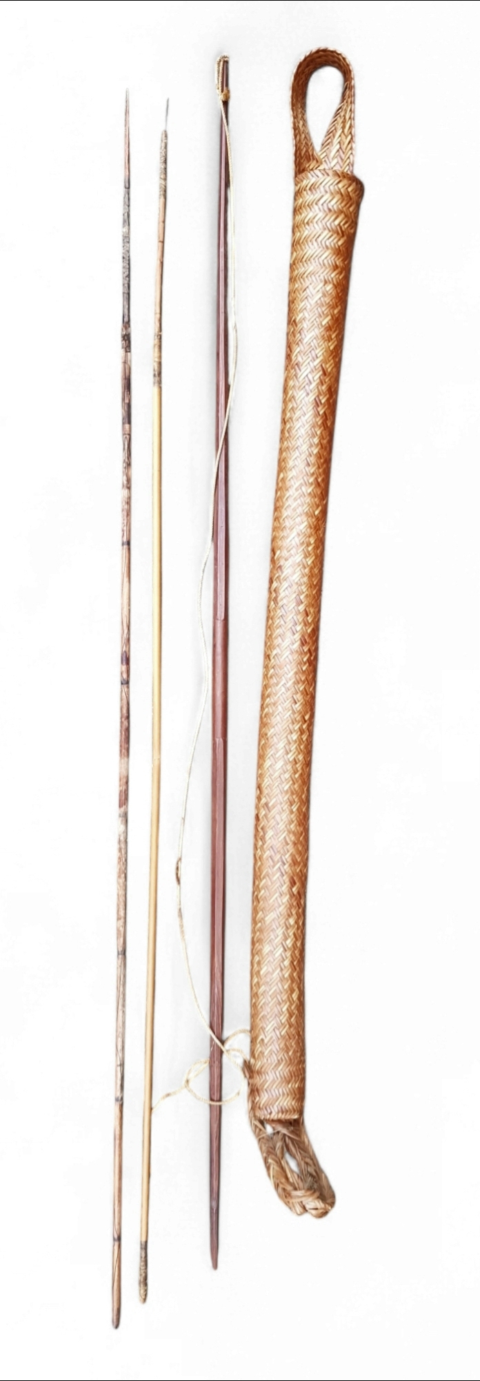 Lot etnografica uit Zuid-Amerika, bestaande uit een boog, twee niet-gevleugelde pijlen van hardhout en een Matapi. De Matapi is vervaardigd met traditioneel diagonaal vlechtwerk van natuurlijke vezels, essentieel voor de maniokcultuur in het Amazonegebied. 20e eeuw. Klaar om te bieden? Registreer je nu en doe mee aan de veiling! |
