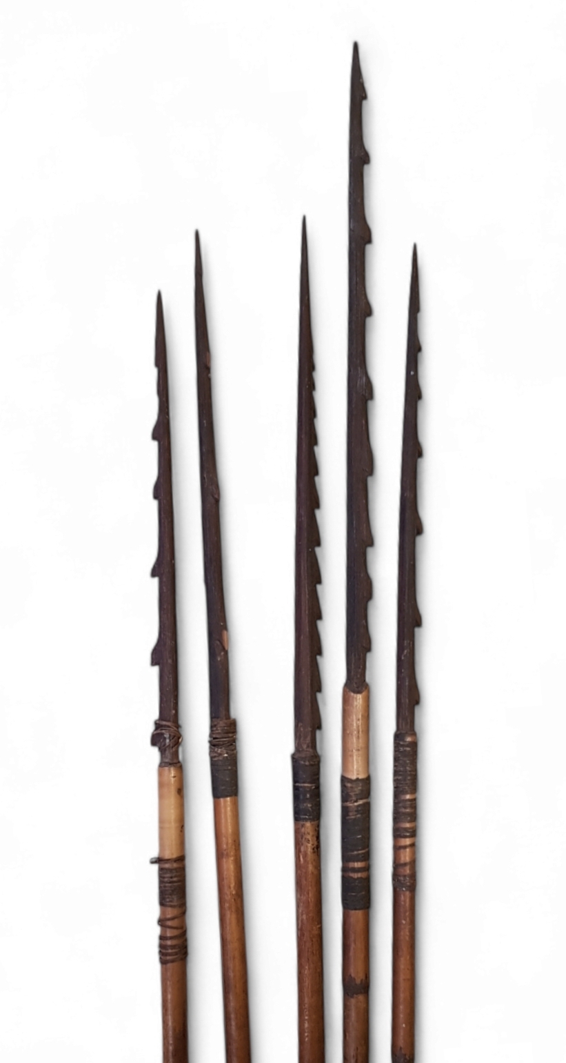 Oceanische jacht- en verzamelwapens bestaande uit een houten boog en diverse pijlen met smalle en gesneden houten punten. Vervaardigd in de tweede helft van de 20e eeuw uit hout door de inheemse bevolking in Oceanië, waarschijnlijk Melanesië. Klaar om te bieden? Registreer je nu en doe mee aan de veiling! |