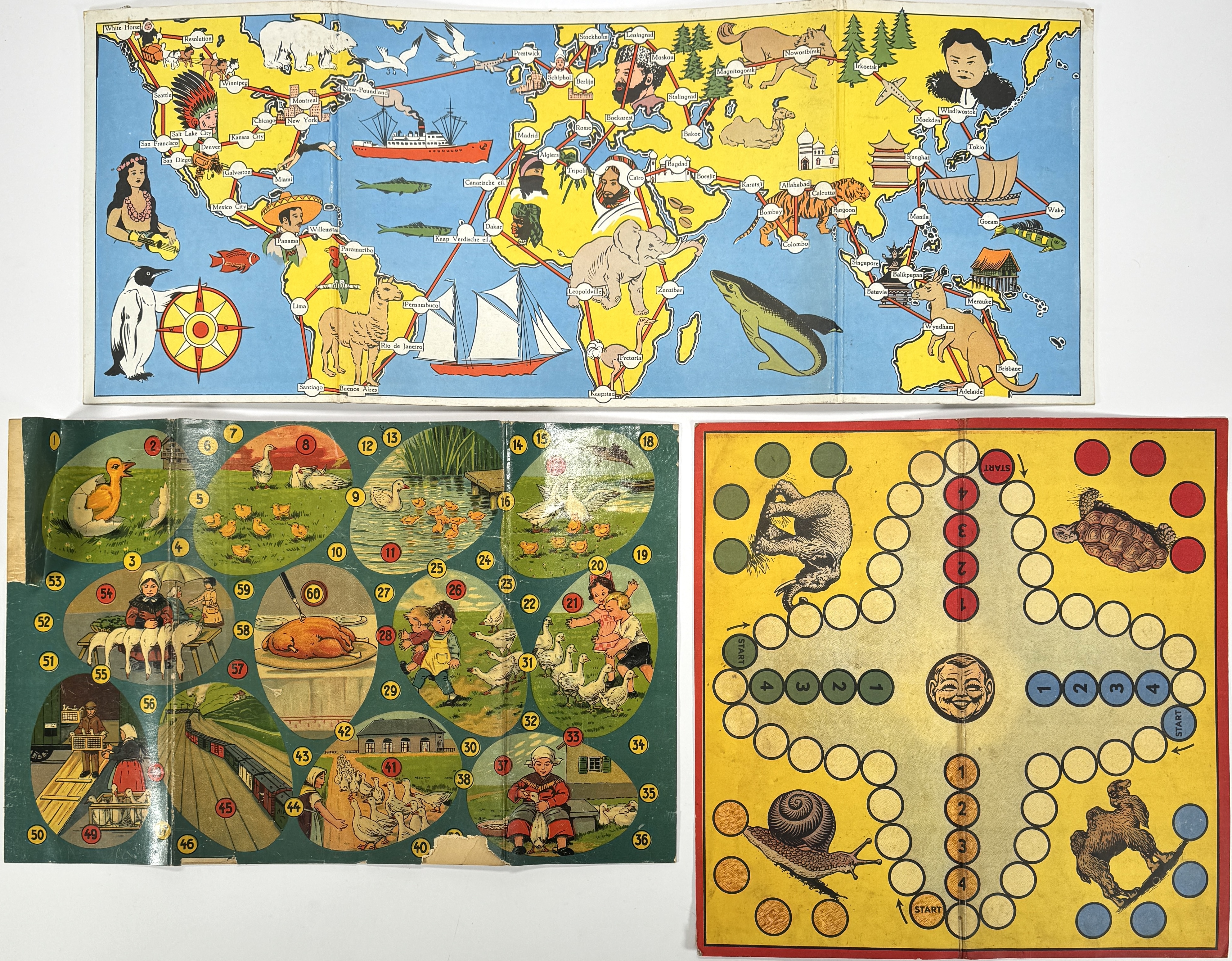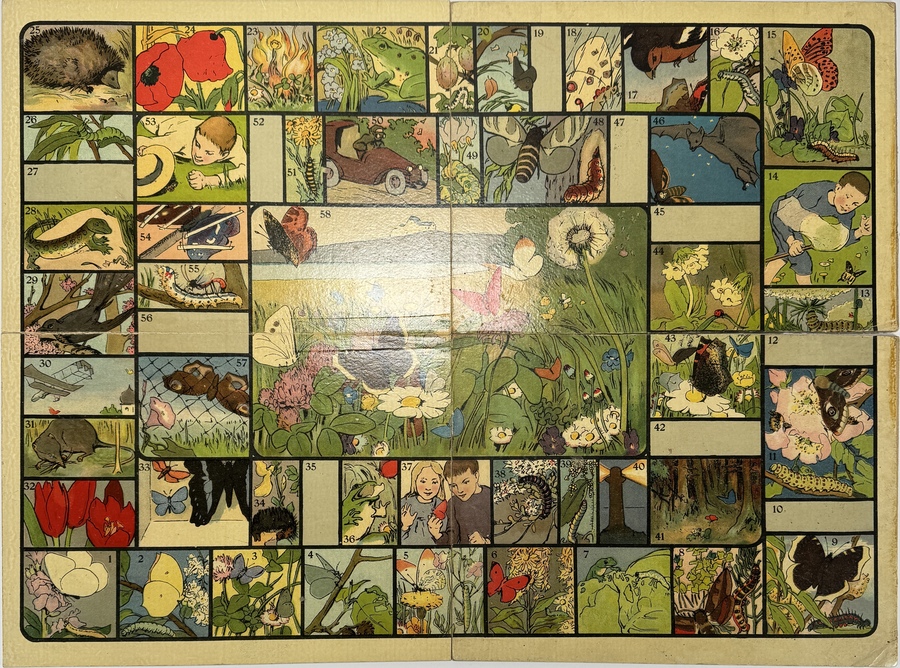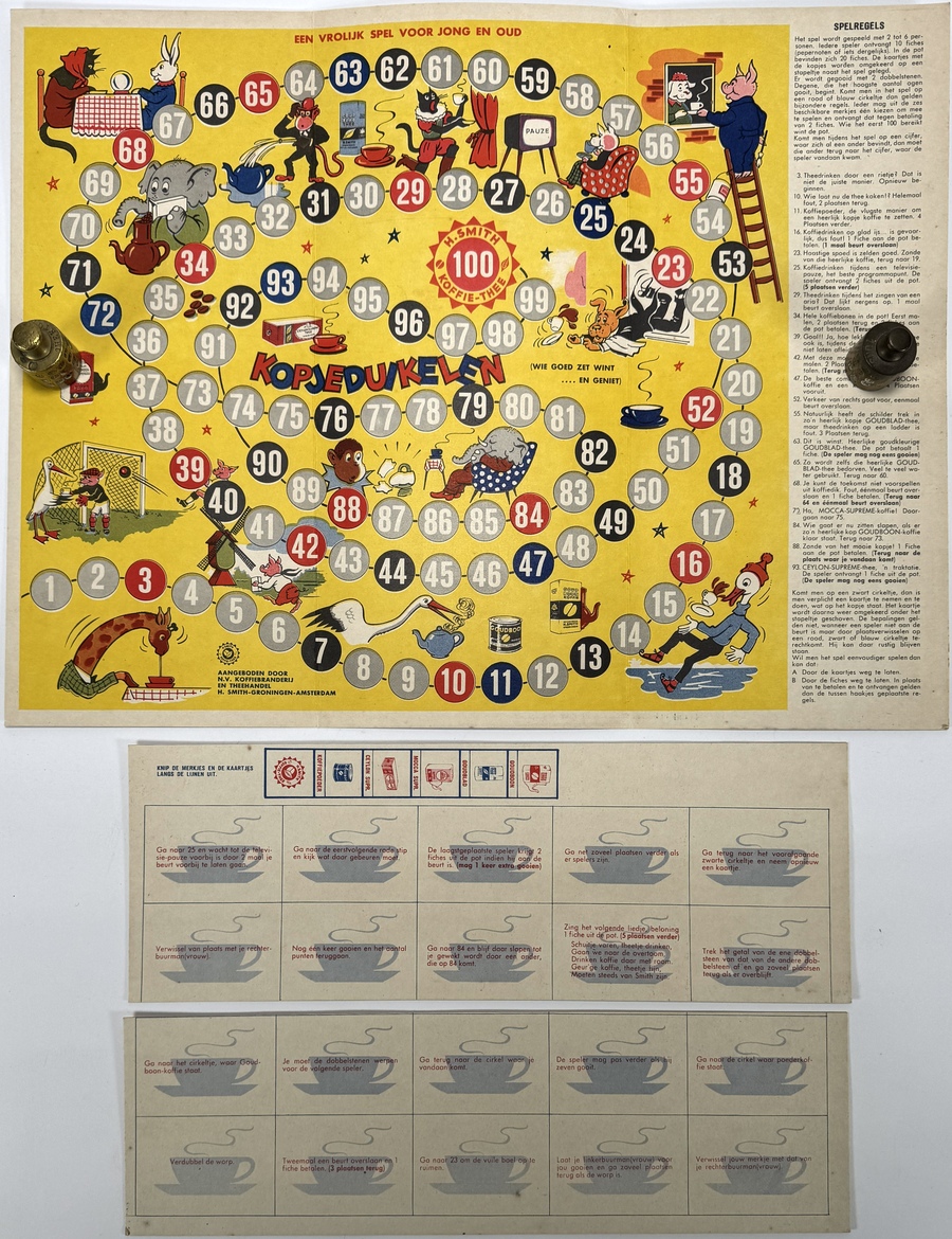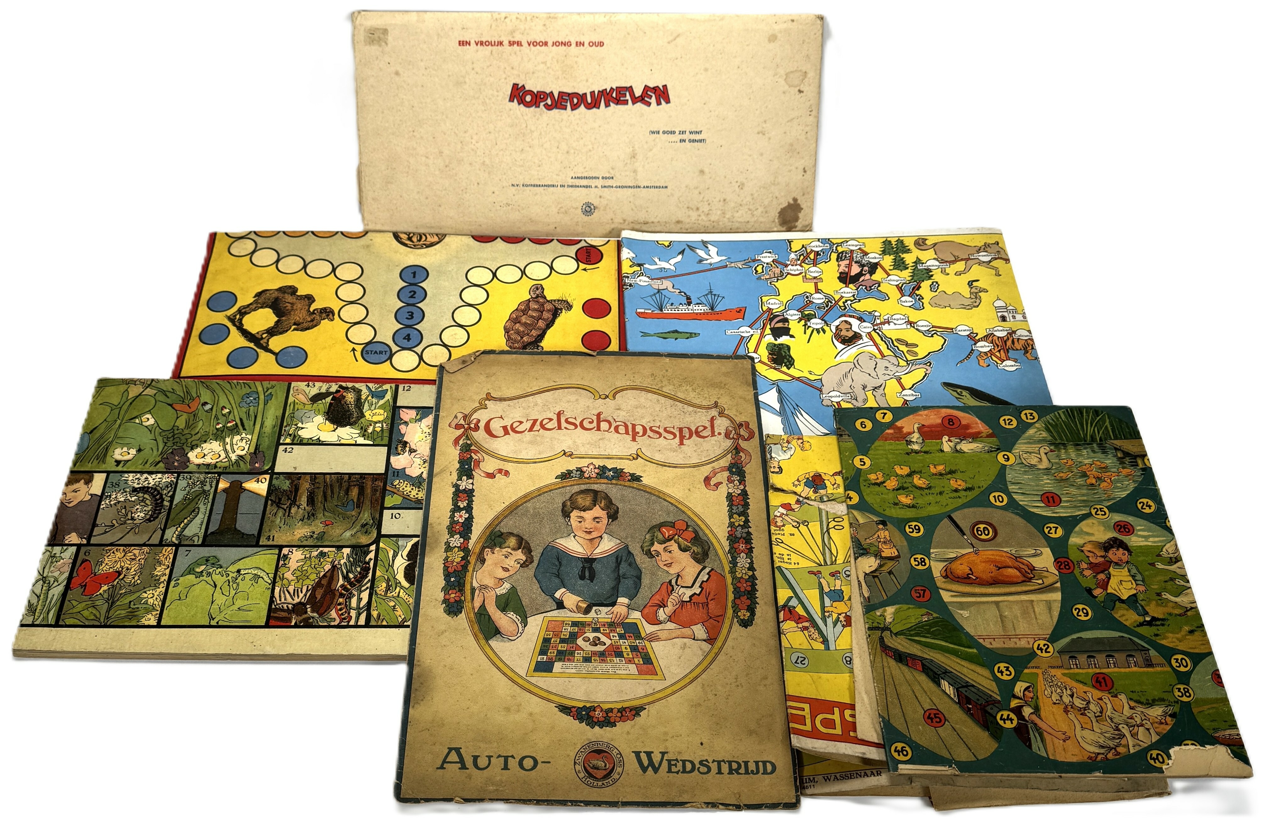 Collectie Nederlandse gezelschapsspellen en speelborden uit de periode circa 1920–1940, vervaardigd uit lithografisch bedrukt karton en papier. De spellen omvatten titels als "Auto-Wedstrijd" en "Kop-je-duikelen", met omslagen van Amsterdamse uitgevers als Gebr. Koster. De illustraties tonen een traditionele figuratieve stijl, typerend voor educatief speelgoed uit het interbellum, met thema's als reizen en natuur in een nostalgische vormgeving. Wil je direct deelnemen? Plaats vanaf 21 november alvast een schriftelijk bod via onze website! |