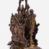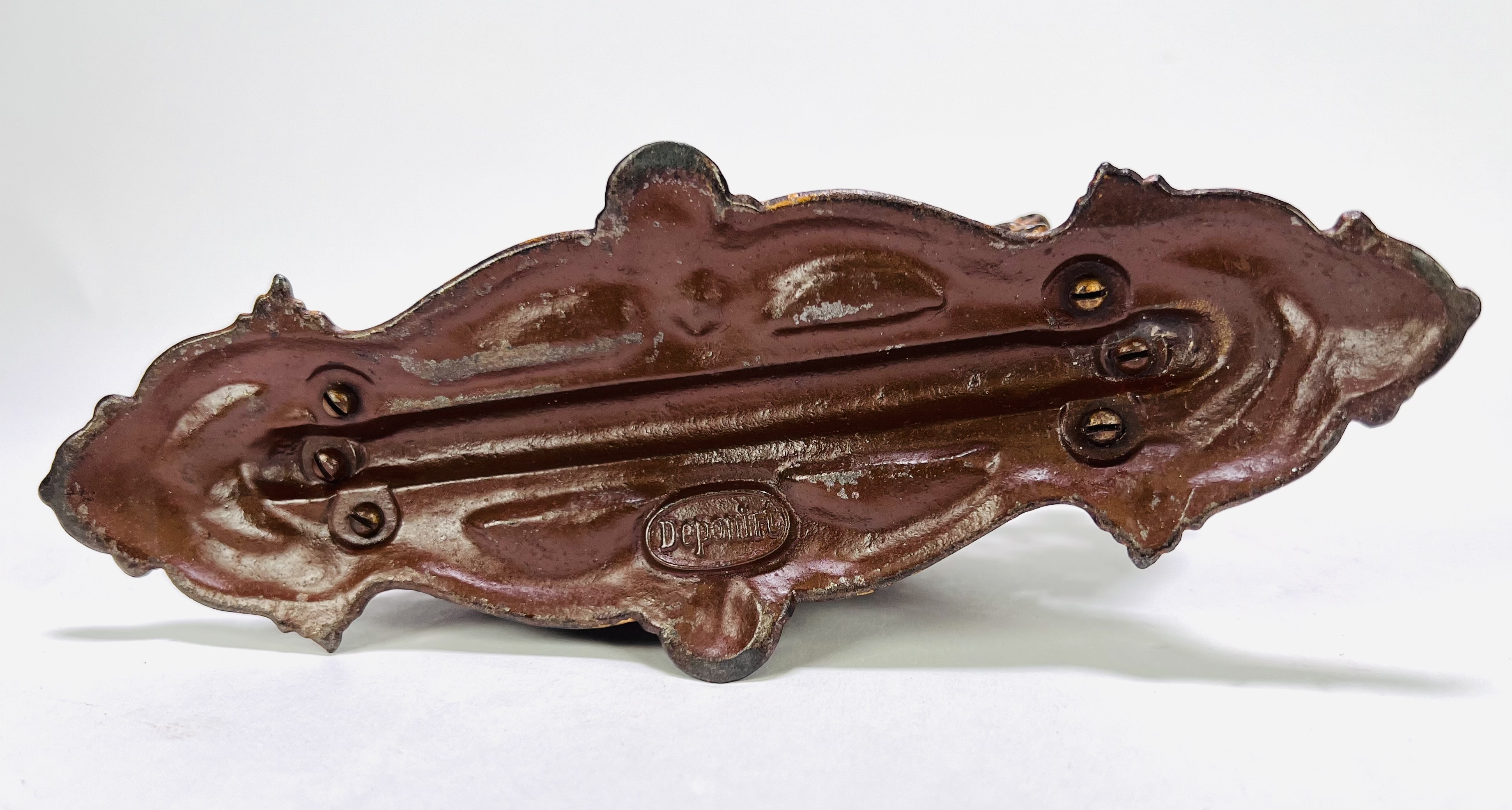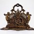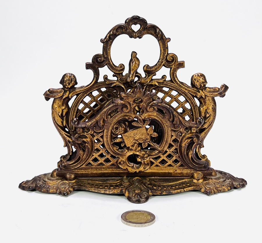 Brievenstandaard uit de tweede helft 19e eeuw vervaardigd uit gegoten gietijzer. De stijl is neobarok, typisch voor kantoorartikelen van Bradley & Hubbard. De decoratie bestaat uit overvloedige voluten, een traliewerk en twee mythologische putti. Het object heeft een donkere patina met restanten van goudkleurige afwerking. Op de onderzijde staat de patentmarkering 'Deponirt'. Geïnteresseerd? Bezoek onze kijkdagen op 28, 29 of 30 november van 11:00 tot 17:00 uur! |