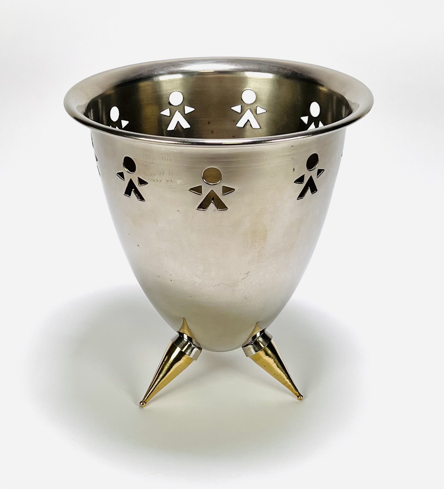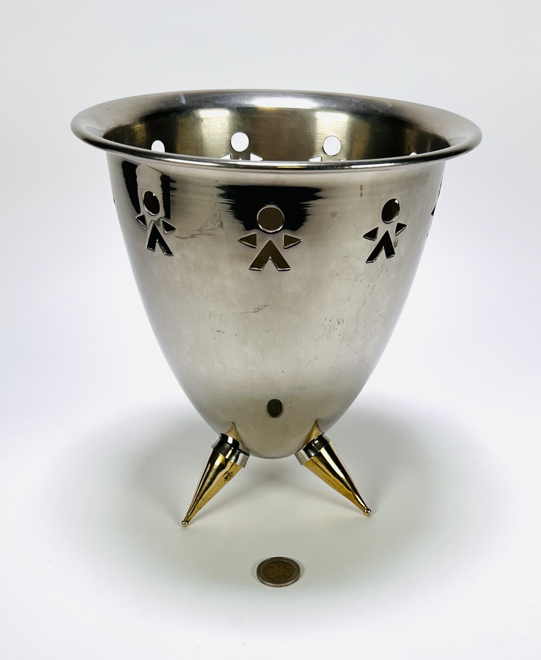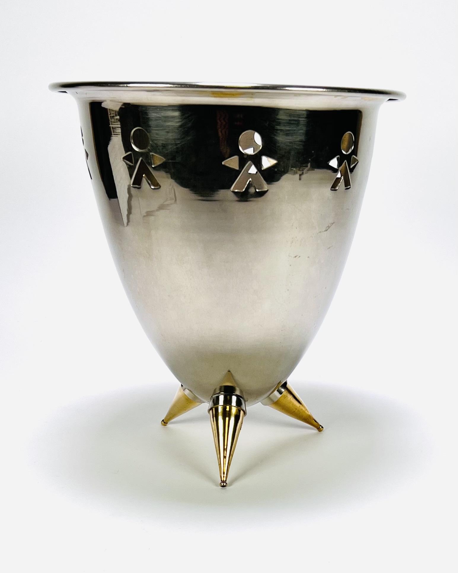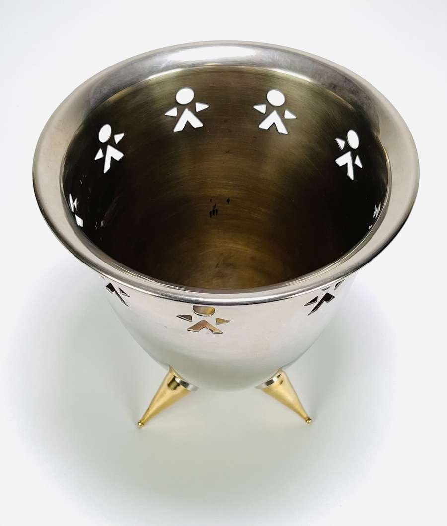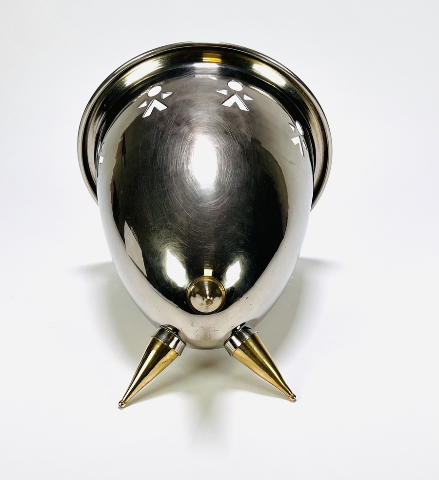 Champagnekoeler van roestvrij staal uit eind 20e eeuw. De koeler heeft een omgekeerde kegelvorm op drie poten met messing punten, voorzien van gestanste figuren als decoratie. Eerst deze champagnekoeler zien voordat je biedt? Bezoek onze kijkdagen op 28, 29 en 30 november van 11:00 tot 17:00 uur! |