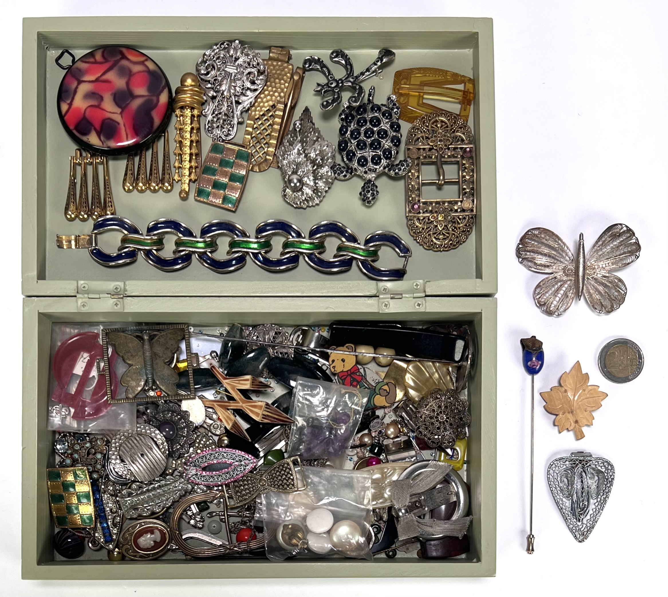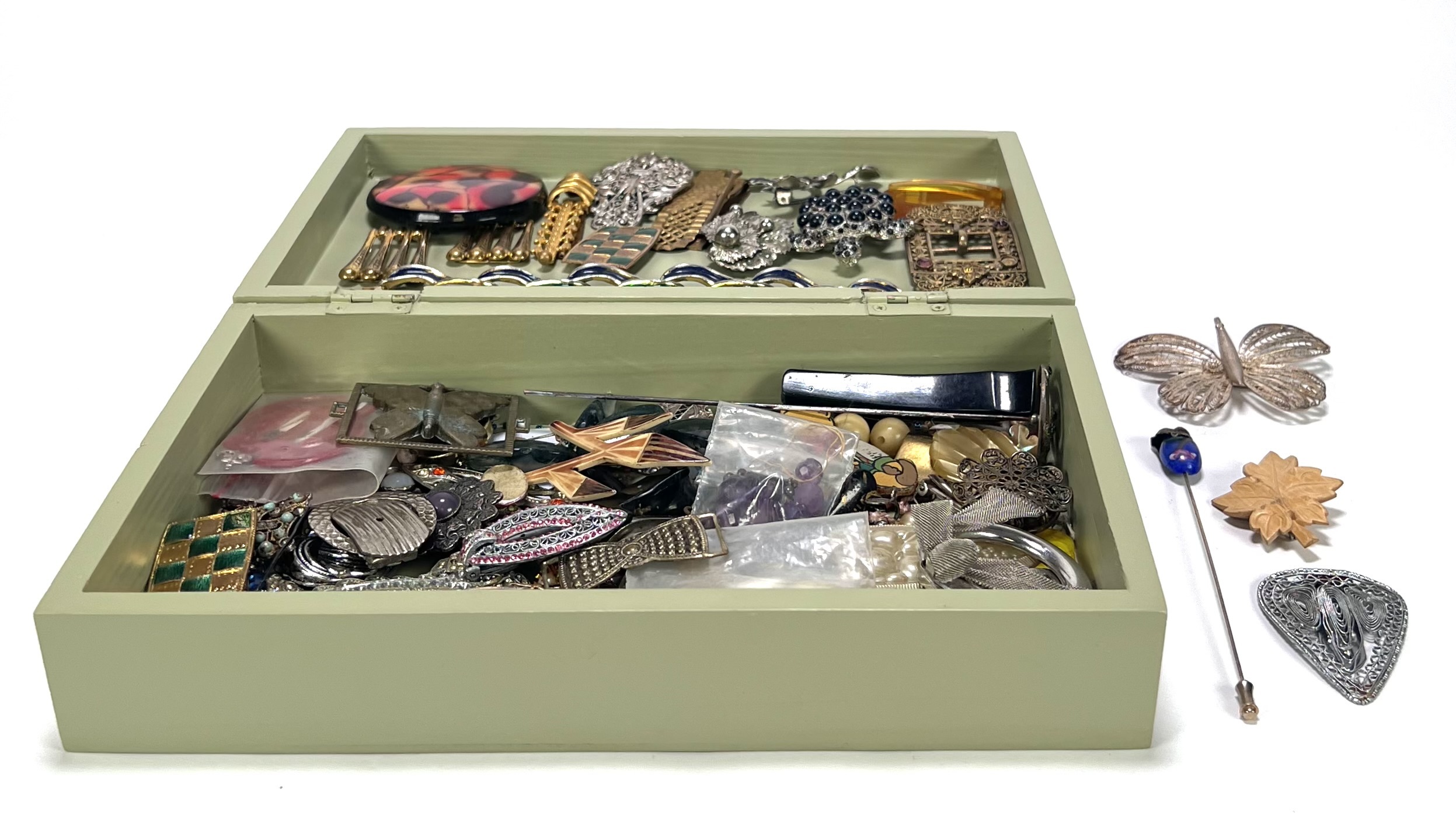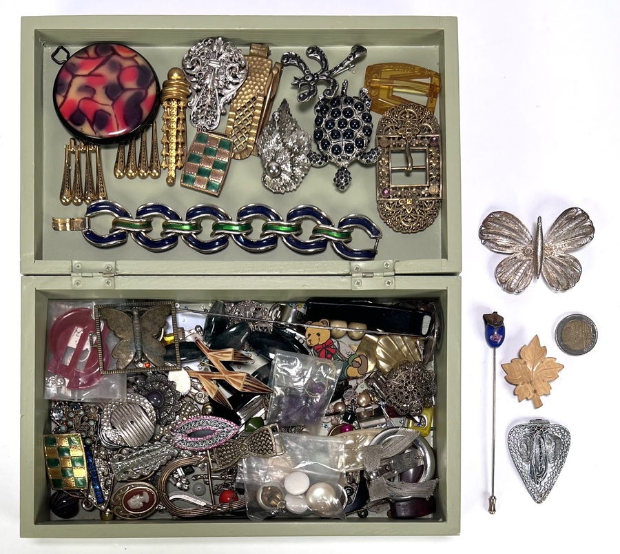 Collectie vintage sieraden en broches van verzilverd metaal, kunststof en glas. De accessoires uit de tweede helft 20e zijn onder meer uitgevoerd in Art Deco en Mid-century modern stijl. De kist bevat onder meer geëmailleerde schakelarmbanden, strass broches, een vlinderbroche en een grote kunststof broche. Klaar om te bieden? Registreer je nu en doe mee aan de veiling! |