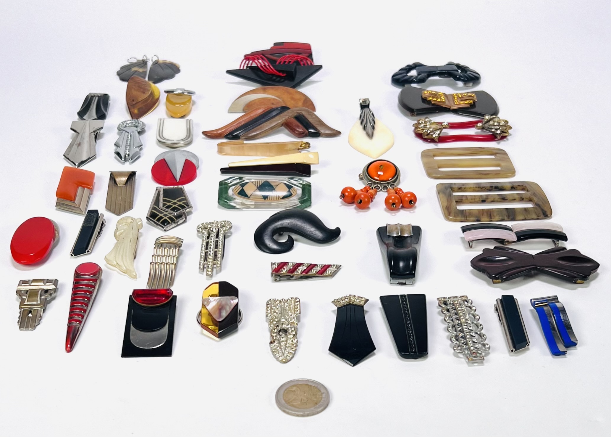 Vintage modeaccessoires waaronder spelden, gespen en broches. De collectie is uitgevoerd in kunststof en metaallegeringen, daterend midden 20e eeuw. De stijl is Art Deco tot retro modernisme, gekenmerkt door geometrische vormen en sterke kleurcontrasten. Klaar om te bieden? Registreer je nu en doe mee aan de veiling! |
