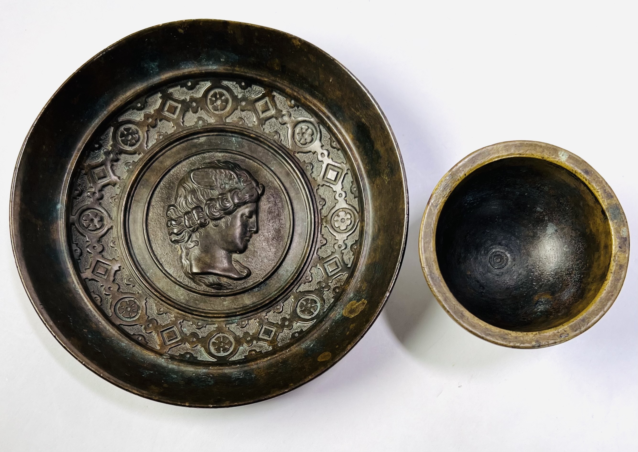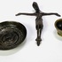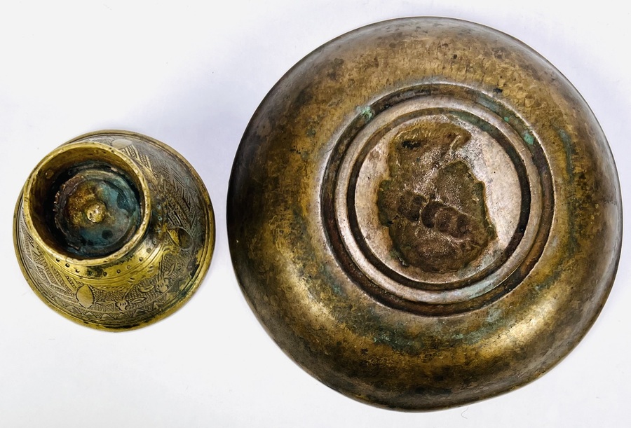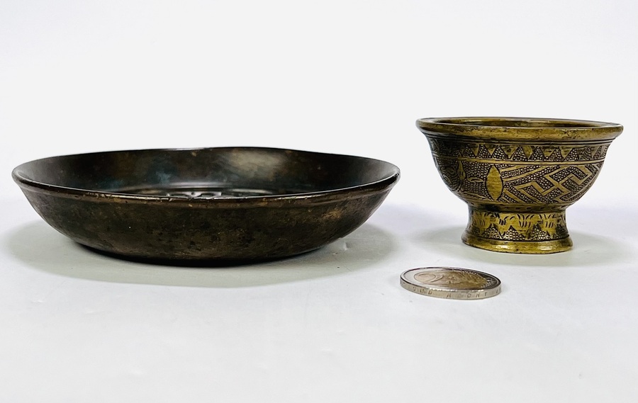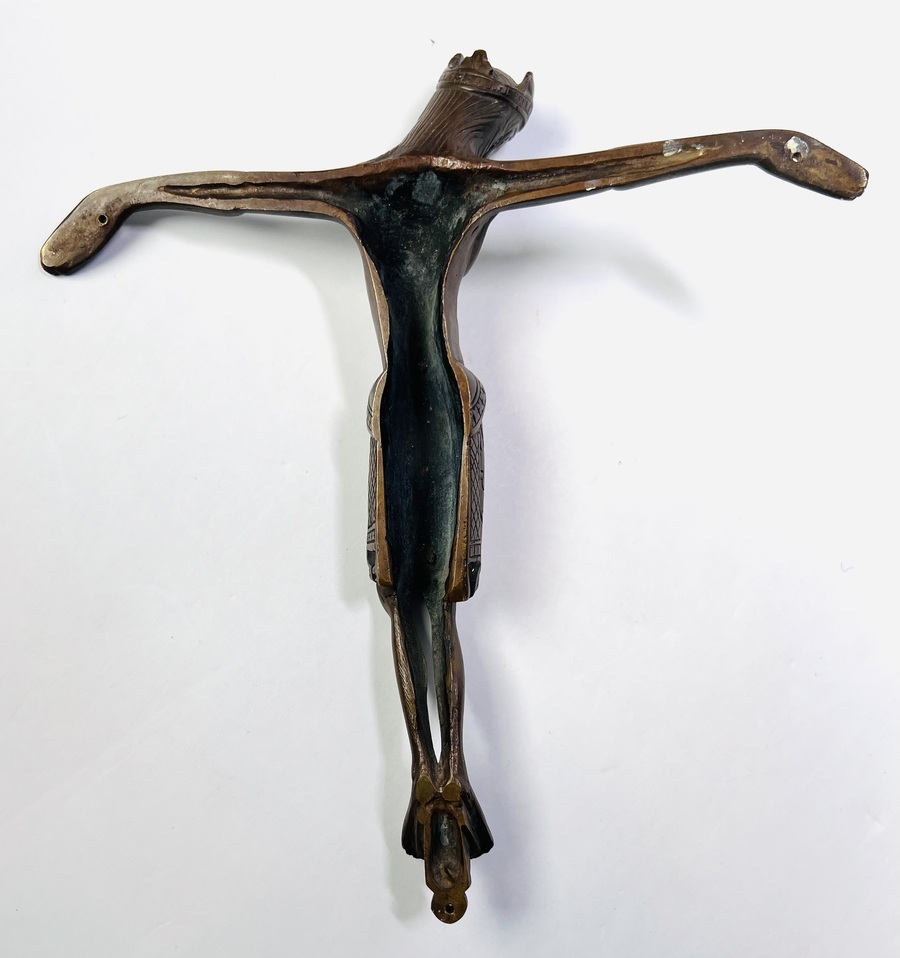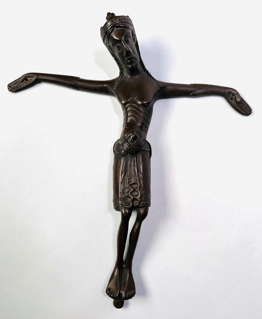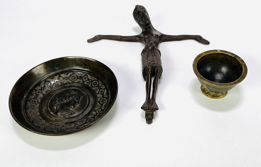 Antieke metalen curiosa, vervaardigd uit messing, circa 1850–1900. Het kavel omvat een hol gegoten Corpus Christ in neogotische stijl, een decoratieve schaal met een klassiek profielreliëf, en een kleine gegraveerde beker. De objecten zijn voorzien van een diepe donkere patina en zijn typerend voor Europese revivalstijlen uit de 19e eeuw. Geïnteresseerd? Bezoek onze kijkdagen op 28, 29 of 30 november van 11:00 tot 17:00 uur! |