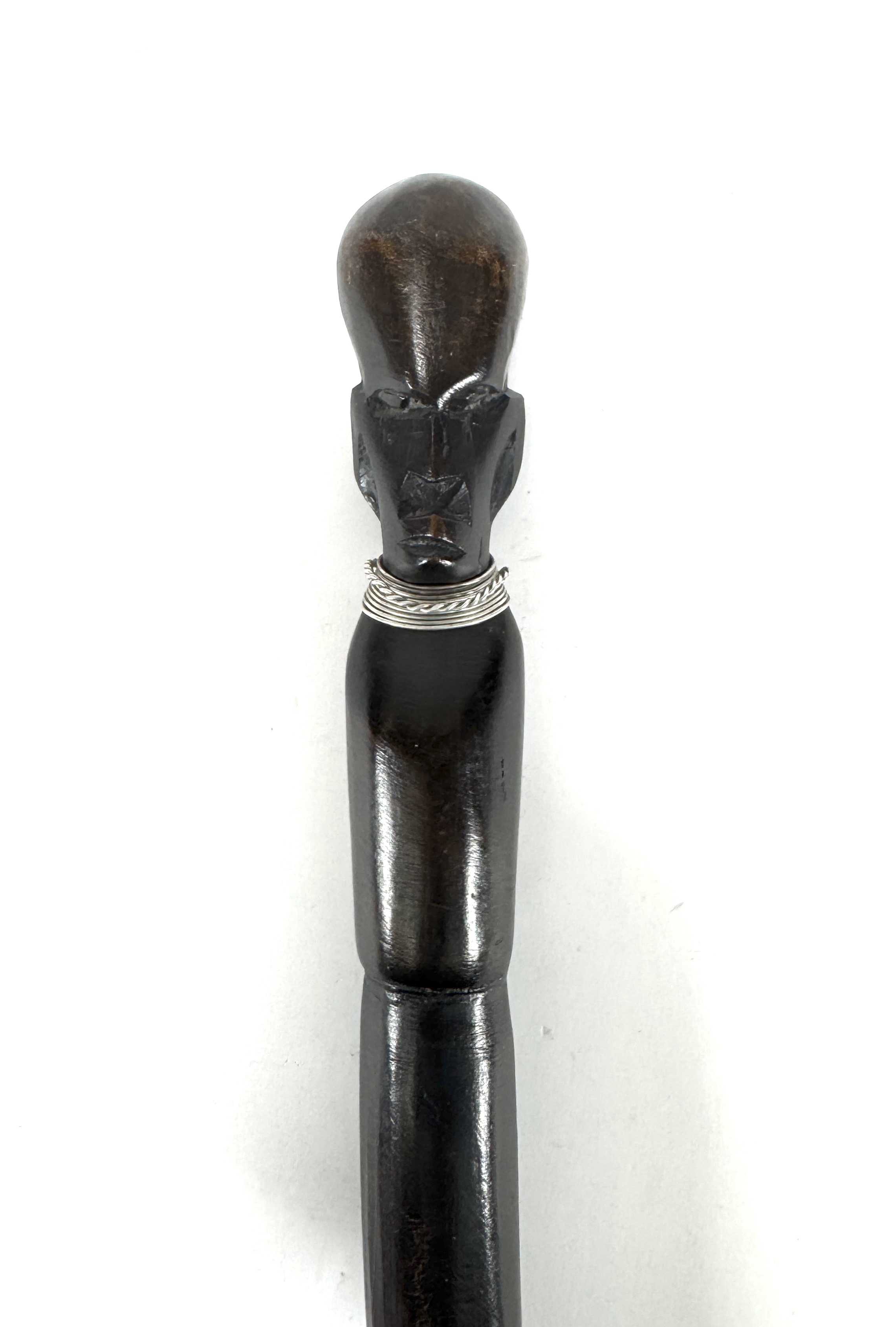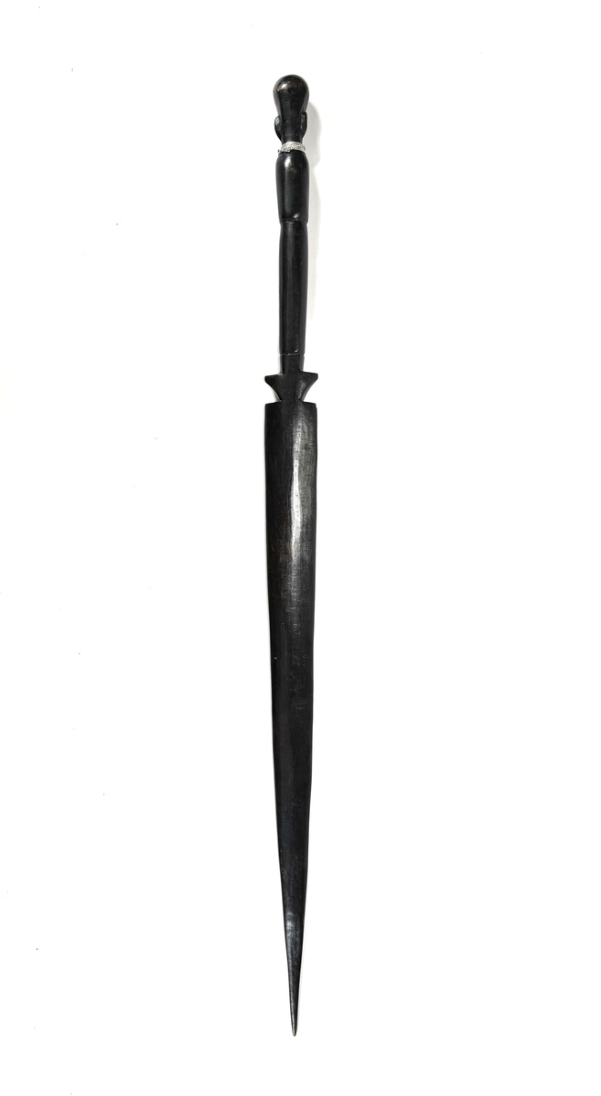 Houten zwaard uit Centraal-Afrika, midden 20e eeuw, vervaardigd uit donker hardhout met gesneden antropomorf handvat en een smal, spits toelopend blad. Het handvat toont een gestileerde menselijke figuur met langgerekt hoofd, geometrische gelaatskenmerken en een metalen halsring. Uitgevoerd in houtsnijwerk en gepolijst, met een ceremoniële en symbolische functie. Wil je direct deelnemen? Plaats vanaf 21 november alvast een schriftelijk bod via onze website! |