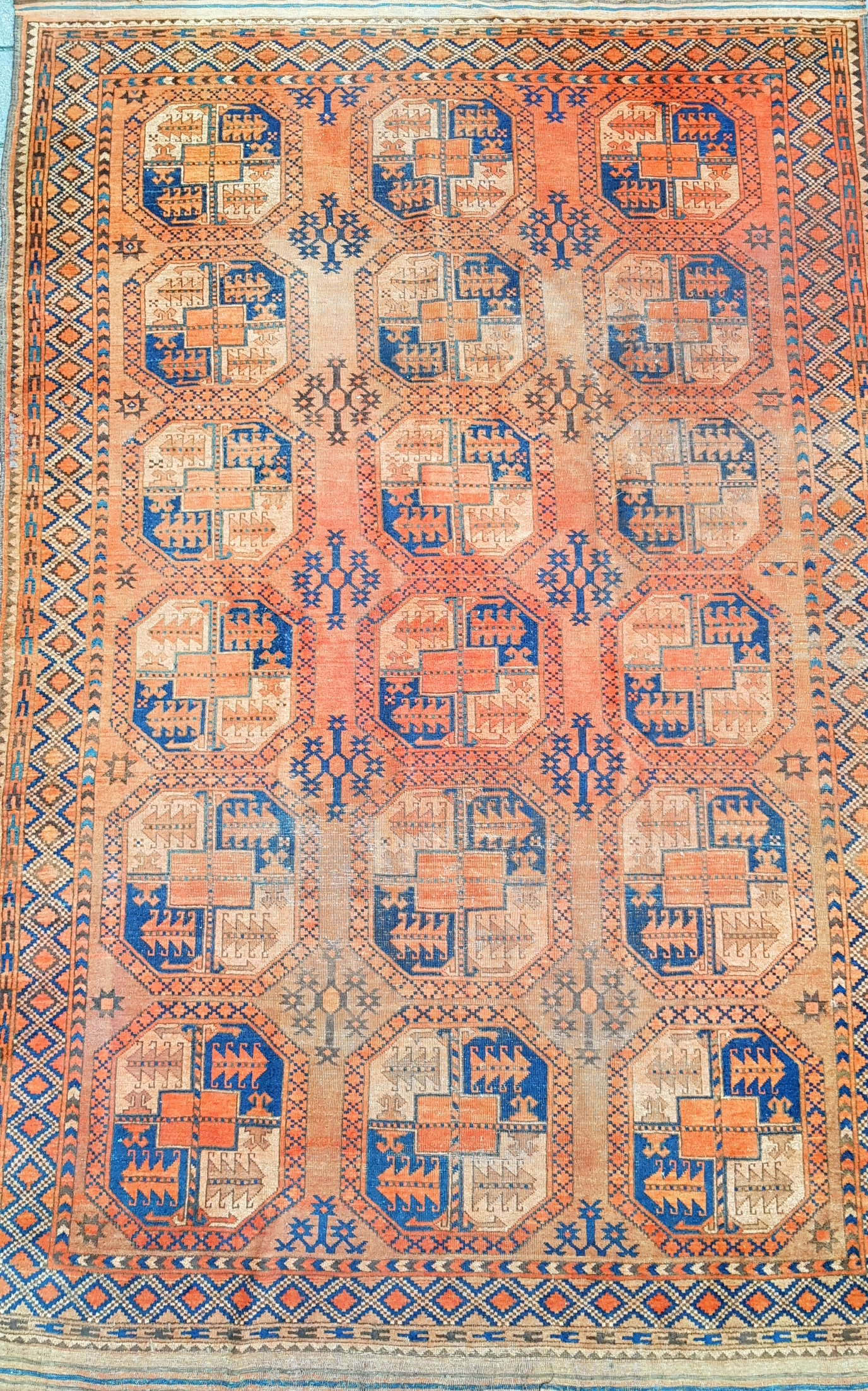 Handgeknoopt wollen tapijt, bekend als Deventer tapijt, geproduceerd door de Koninklijke Vereenigde Tapijtfabrieken (KVT) in Nederland. Het tapijt uit de eerste helft 20e eeuw is uitgevoerd in de tribale stijl met een patroon van octogonale medaillons in oranje en blauw. Klaar om te bieden? Registreer je nu en doe mee aan de veiling! |