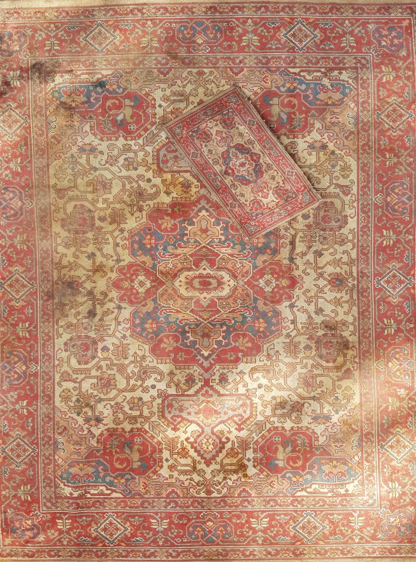 Handgeknoopt wollen tapijt, bekend als Deventer tapijt, geproduceerd door de Koninklijke Vereenigde Tapijtfabrieken (KVT) in Nederland. Het tapijt uit de eerste helft 20e eeuw is uitgevoerd in Perzische stijl met een centraal medaillon op een veld van gestileerde florale motieven. Het gebruik van rood, beige en blauw is kenmerkend voor dit type. Wil je direct deelnemen? Plaats vanaf 21 november alvast een schriftelijk bod via onze website! |
