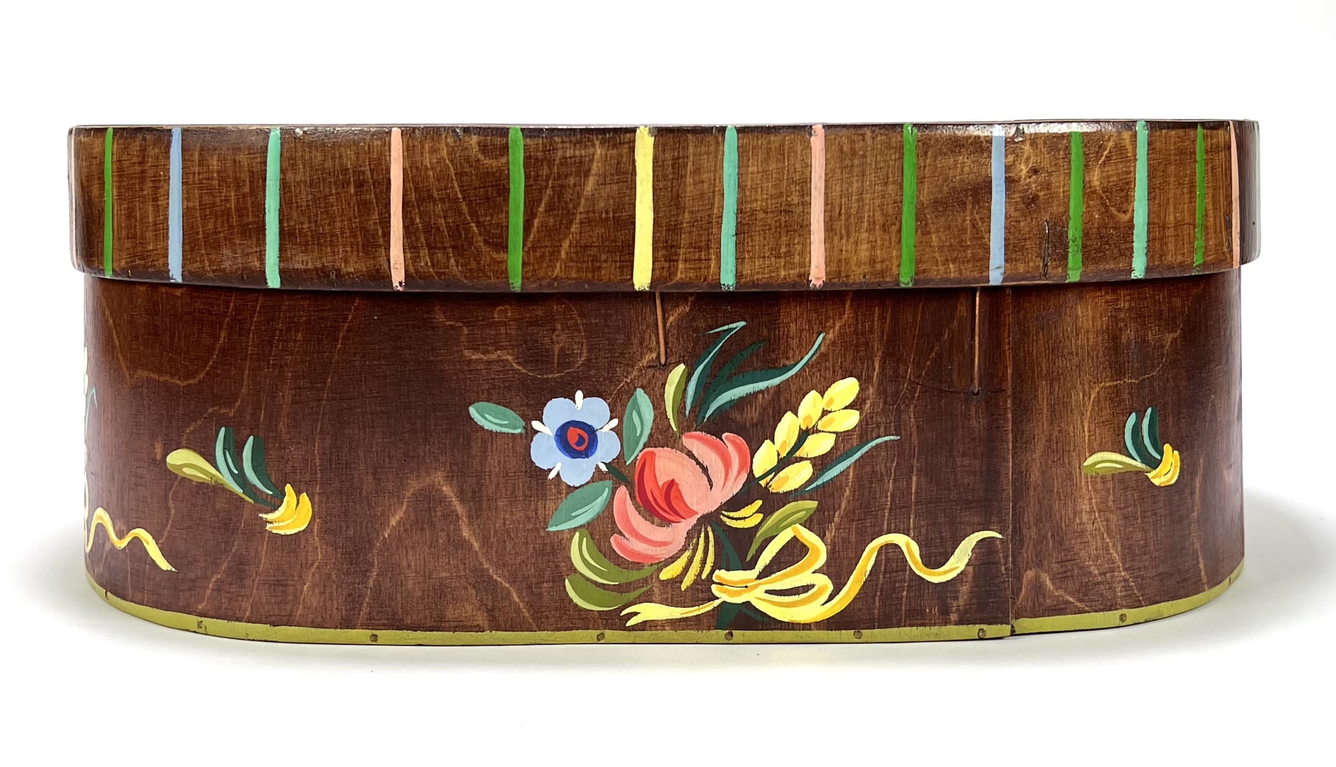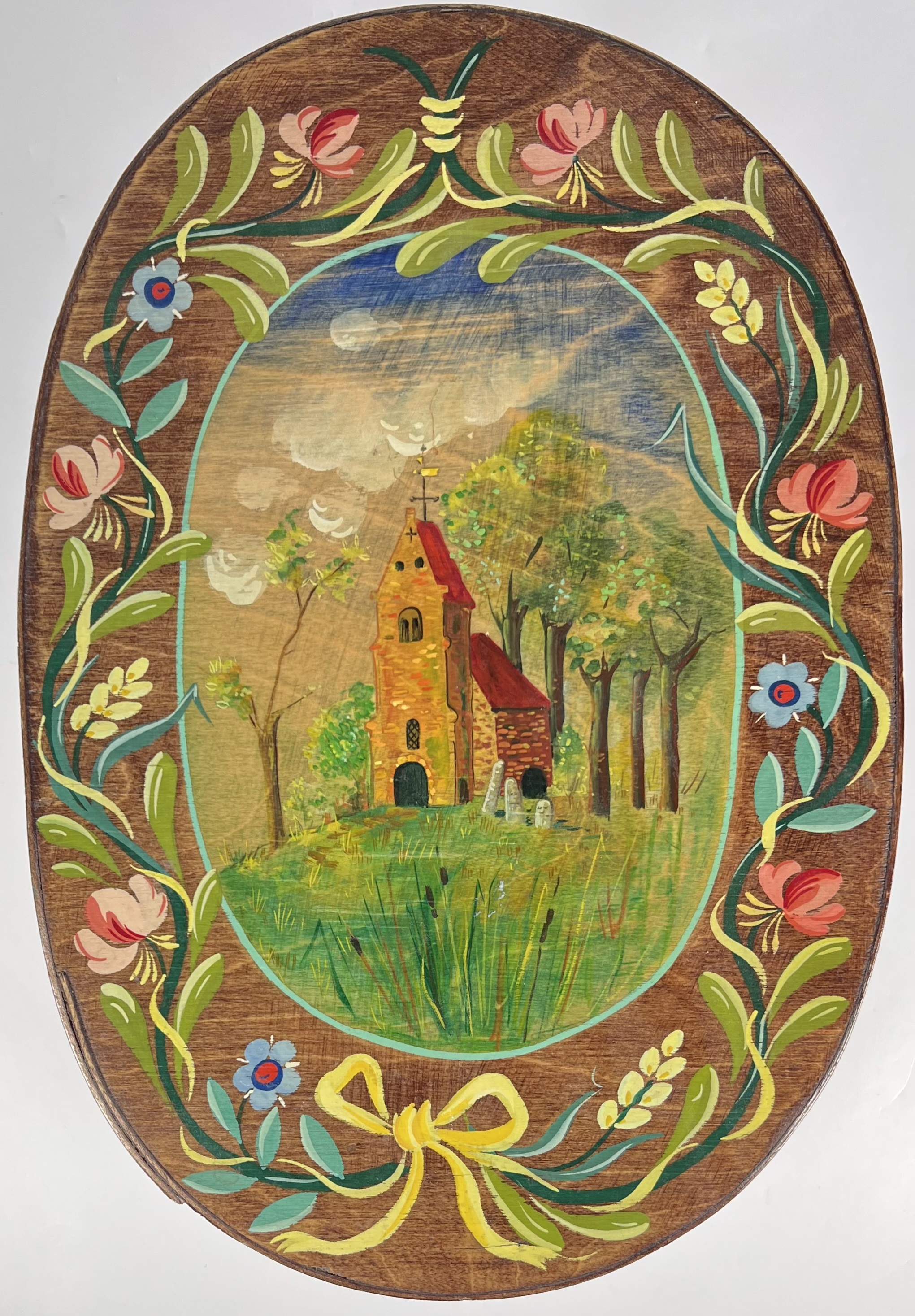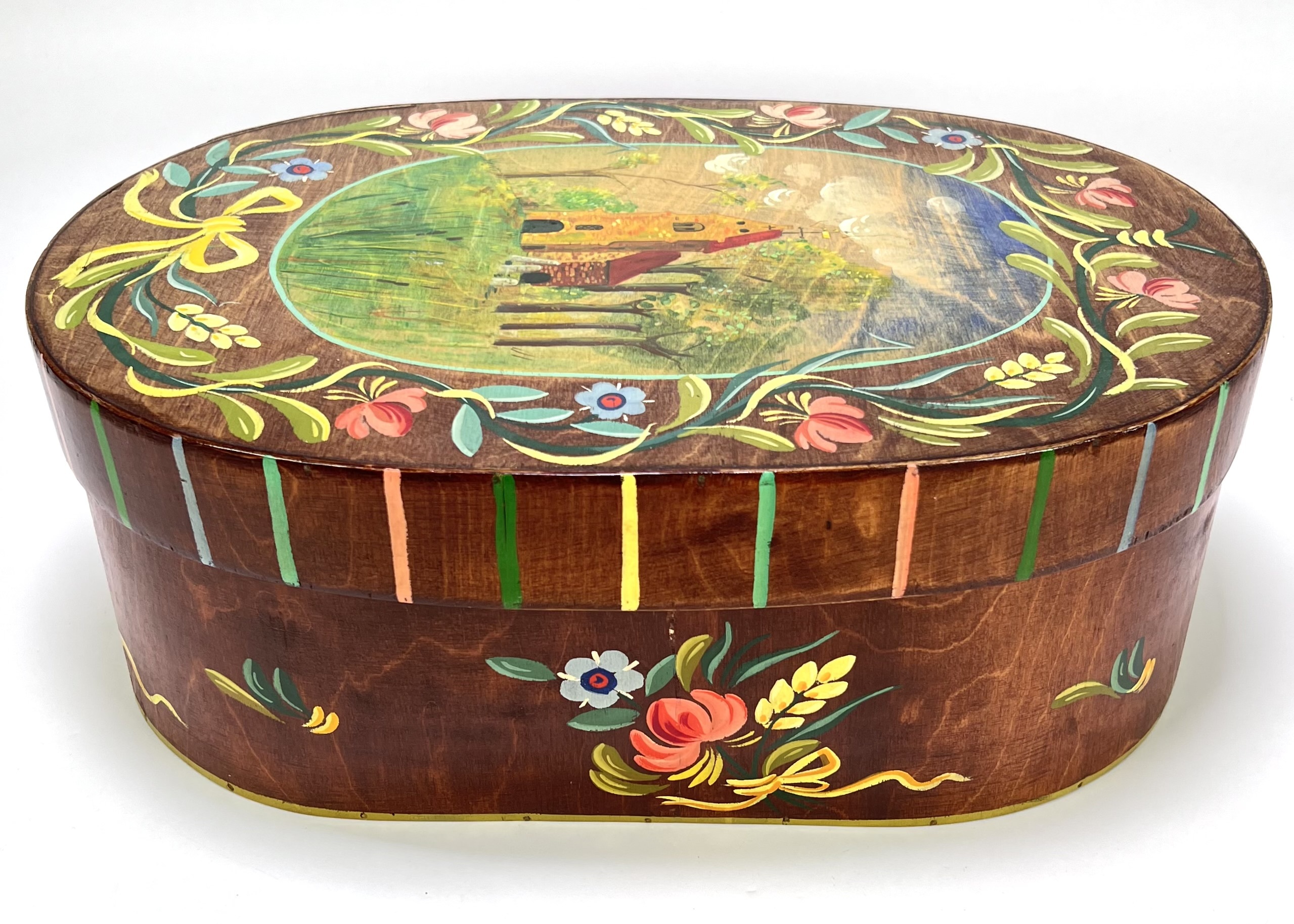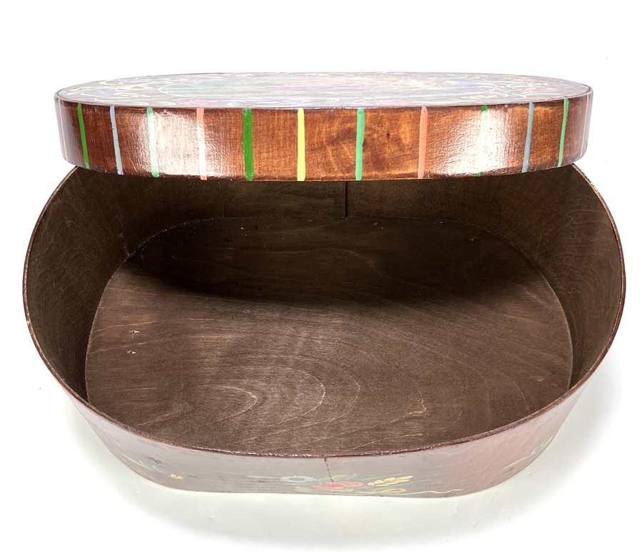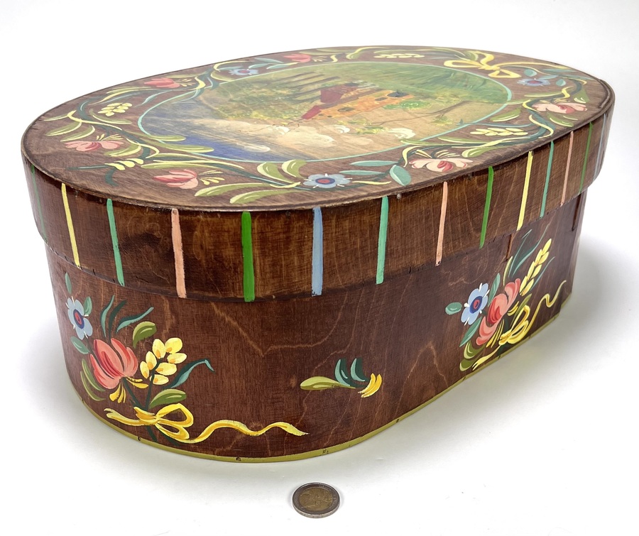 Ovale spaanplaat doos met deksel beschilderd in een Europese volkskunst stijl en stamt uit de midden 20e eeuw. De doos is voorzien van een gedetailleerd landschap met een gele kerk op de deksel en een brede rand van florale motieven in heldere kleuren. Eerst deze doos zien voordat je biedt? Bezoek onze kijkdagen op 28, 29 en 30 november van 11:00 tot 17:00 uur! |