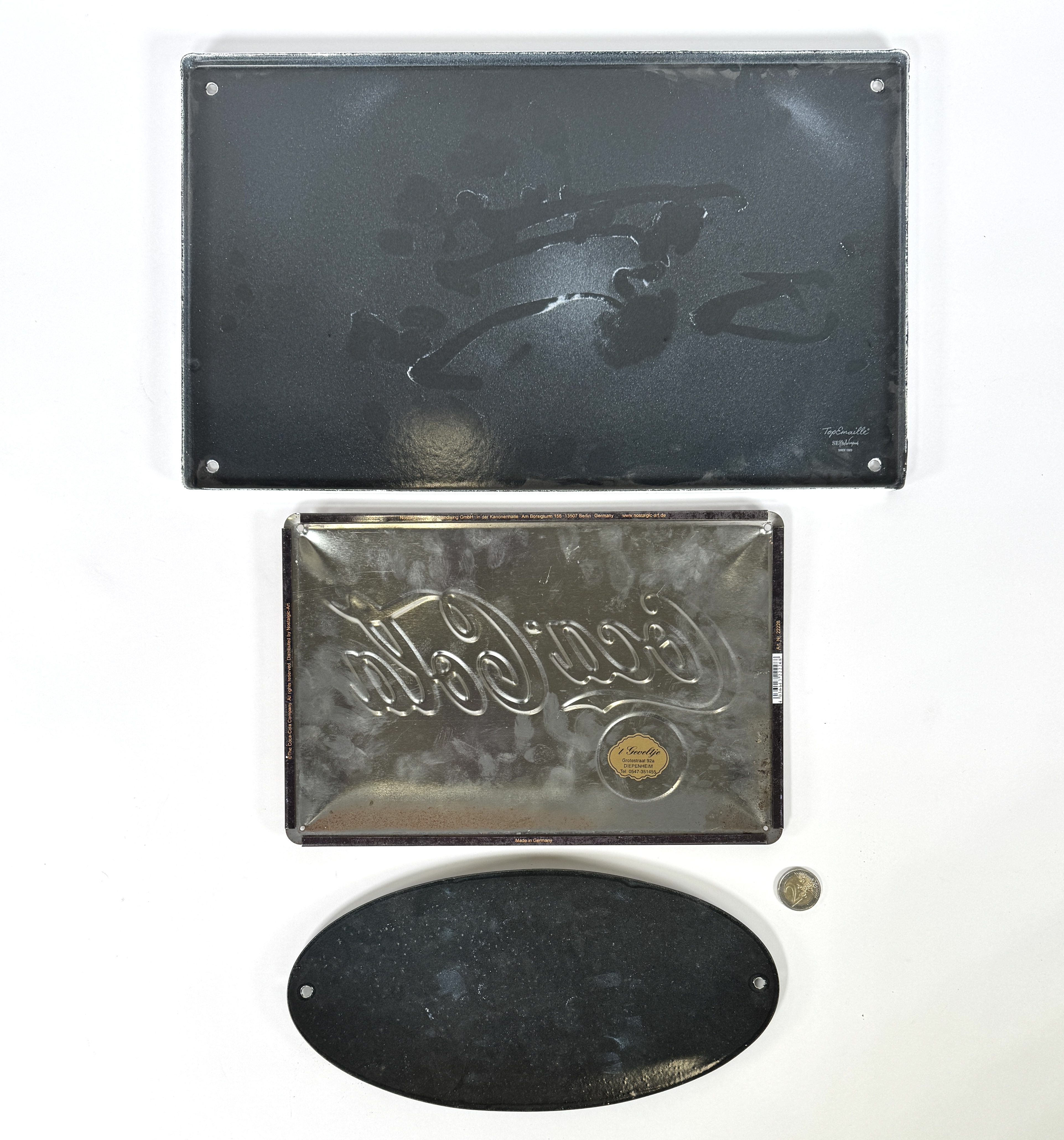 Een wit geëmailleerd gevelbord van Gilde Restaurants, groen emaille ovaal spreukbord en een geel blik reliëfbord van Coca-Cola, geproduceerd door Nostalgic-Art. Eind 20e eeuw. Ontdek deze emaille borden en voeg ze toe aan jouw collectie! Registreer nu voor de veiling. |