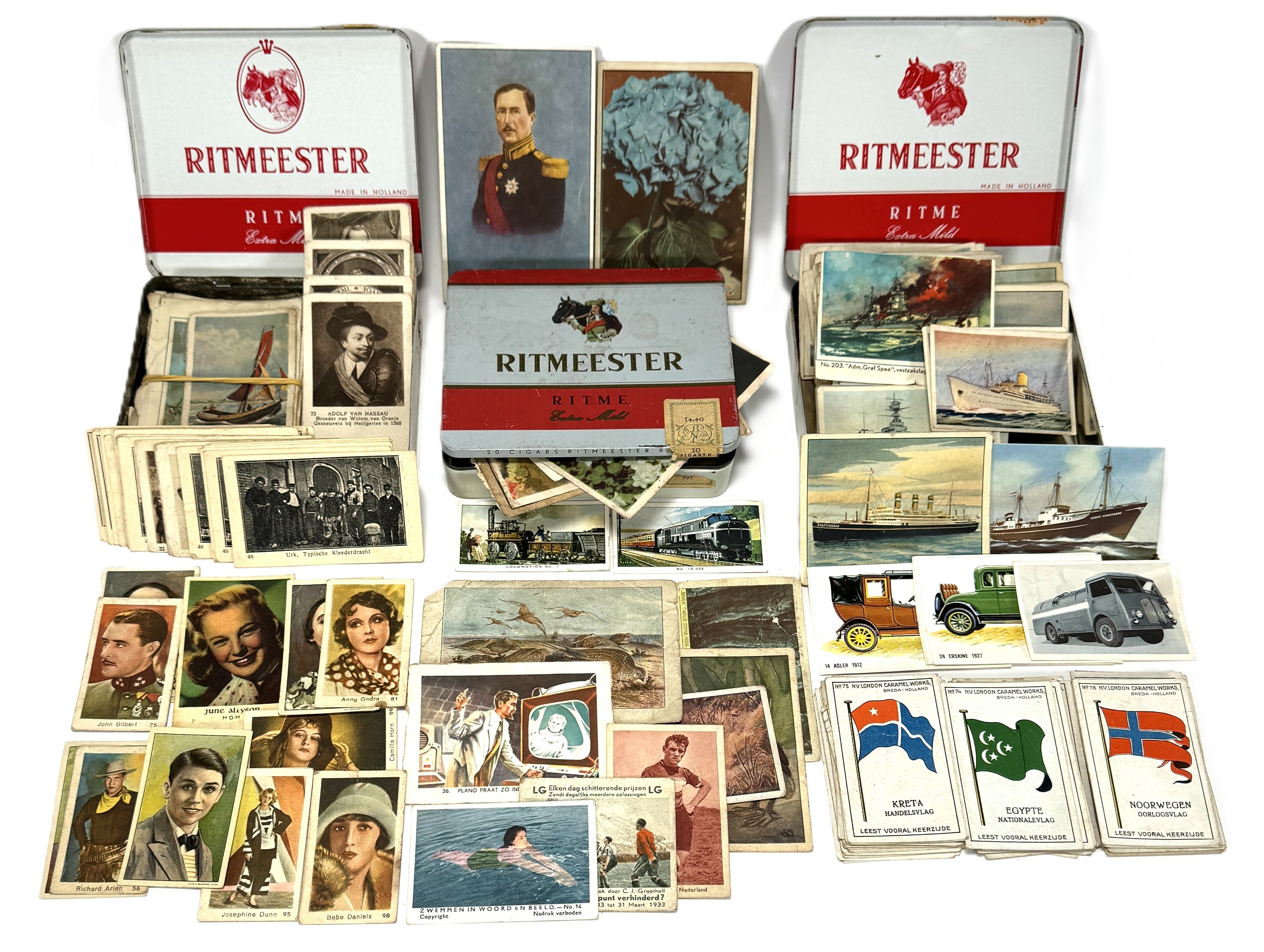 Uitgebreide verzameling vintage plaatjes uit Nederland, daterend uit de periode ca. 1930–1960. De diverse collectie omvat series zoals filmsterren, nautische afbeeldingen, vlaggen van N.V. London Caramel Works, transportmiddelen en koninklijke portretten. Deze papieren verzamelplaatjes zijn opgeborgen in rood-witte metalen sigarendozen met lithografische bedrukking. Klaar om te bieden? Registreer je nu en doe mee aan de veiling! |
