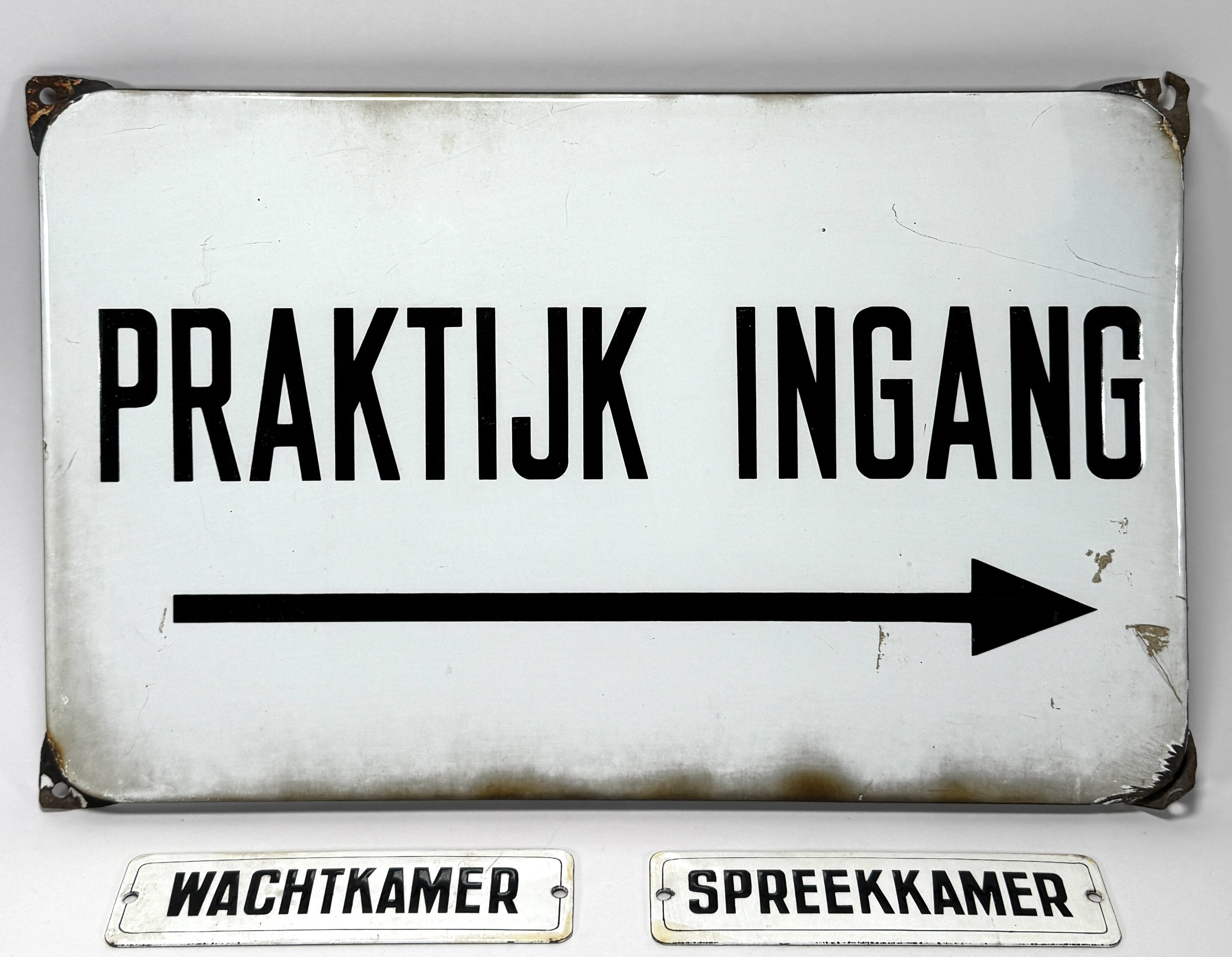 Drie emaille borden uit een Nederlandse medische praktijk, daterend uit het midden van de 20e eeuw; een gevelbord met de tekst 'PRAKTIJK INGANG' en een richtingspijl, plus twee bijpassende deurbordjes met 'WACHTKAMER' en 'SPREEKKAMER'. Zeker zijn van deelname? Plaats vanaf 21 november een schriftelijk bod online! |