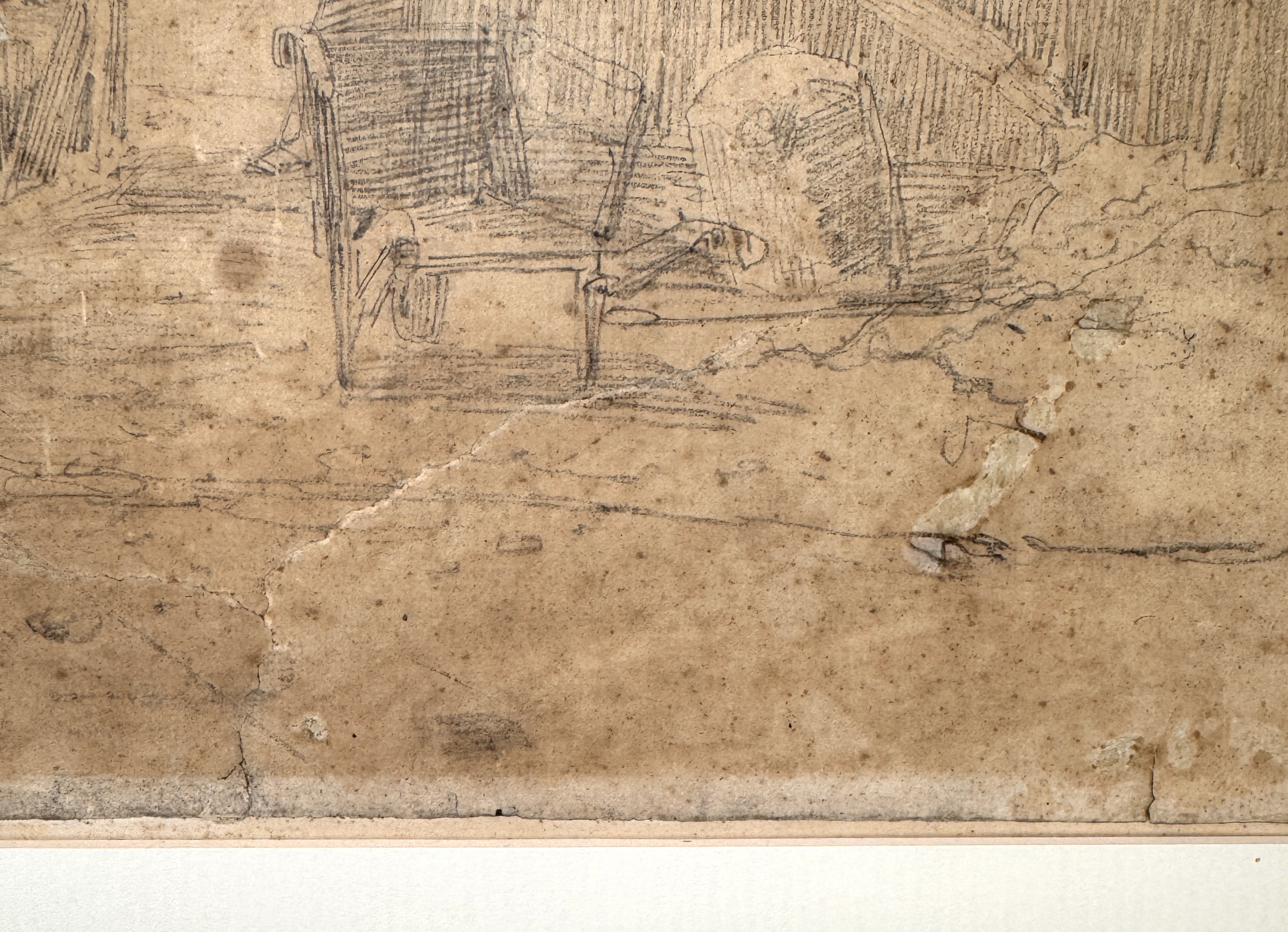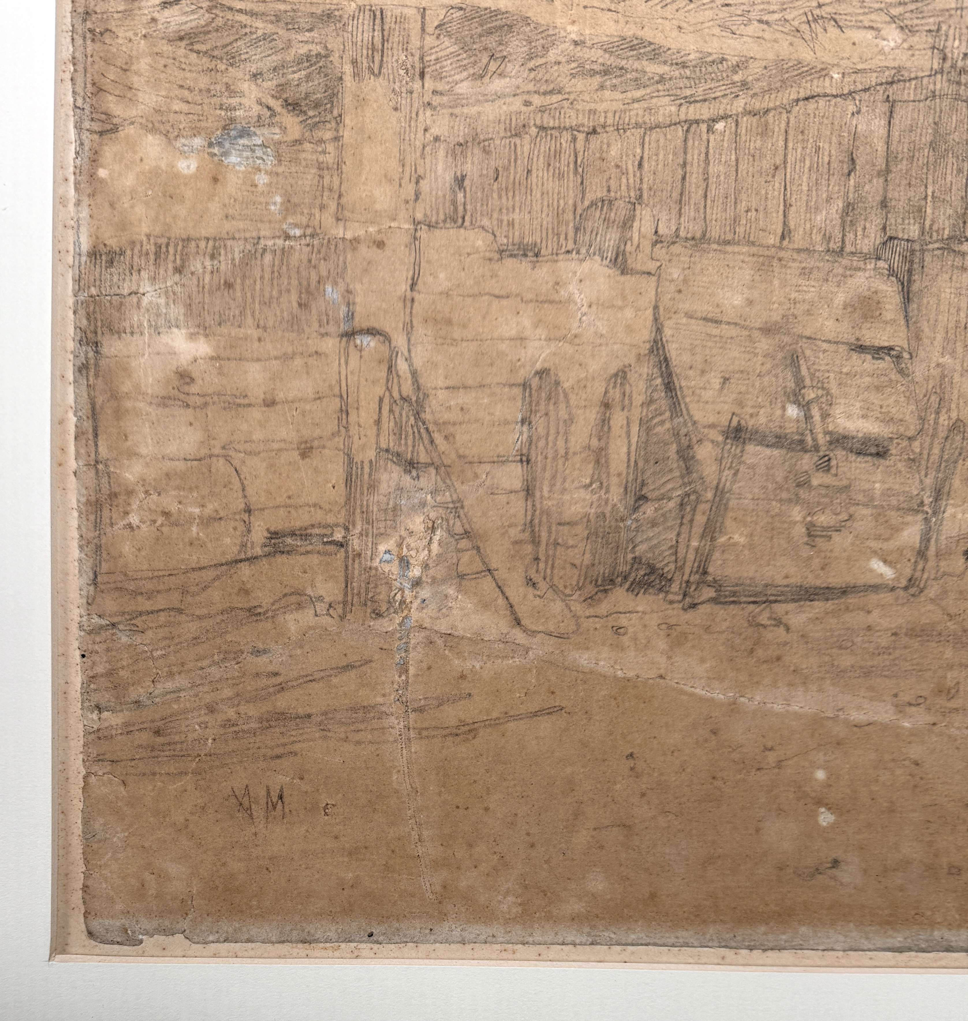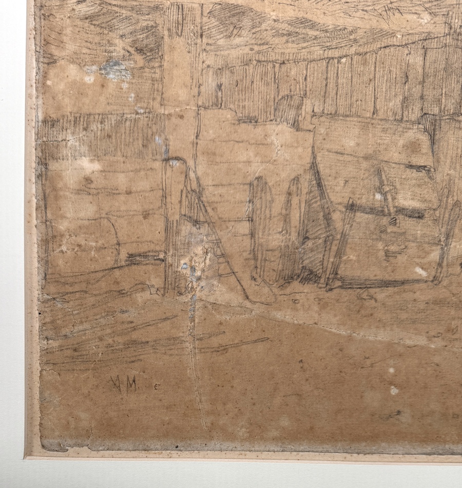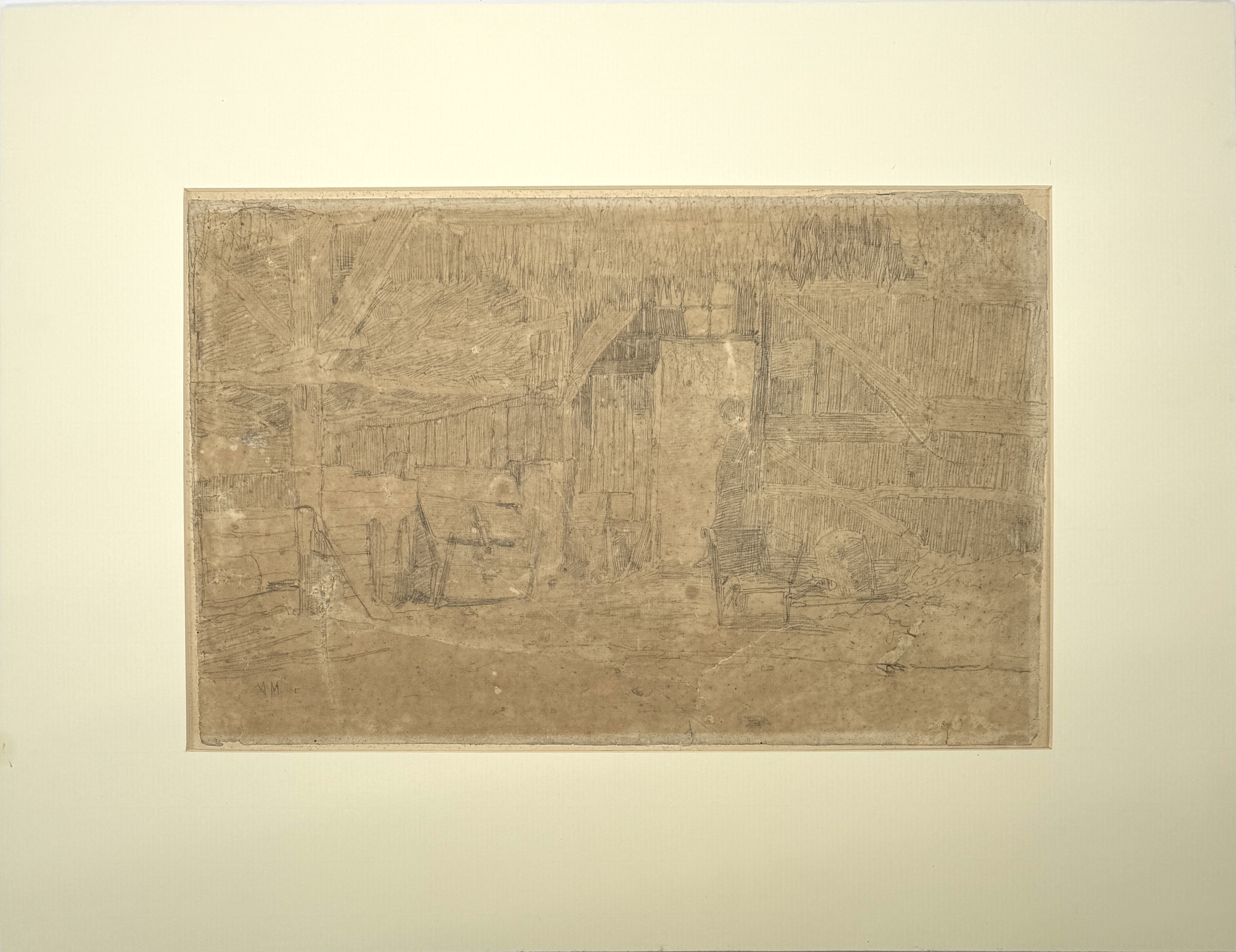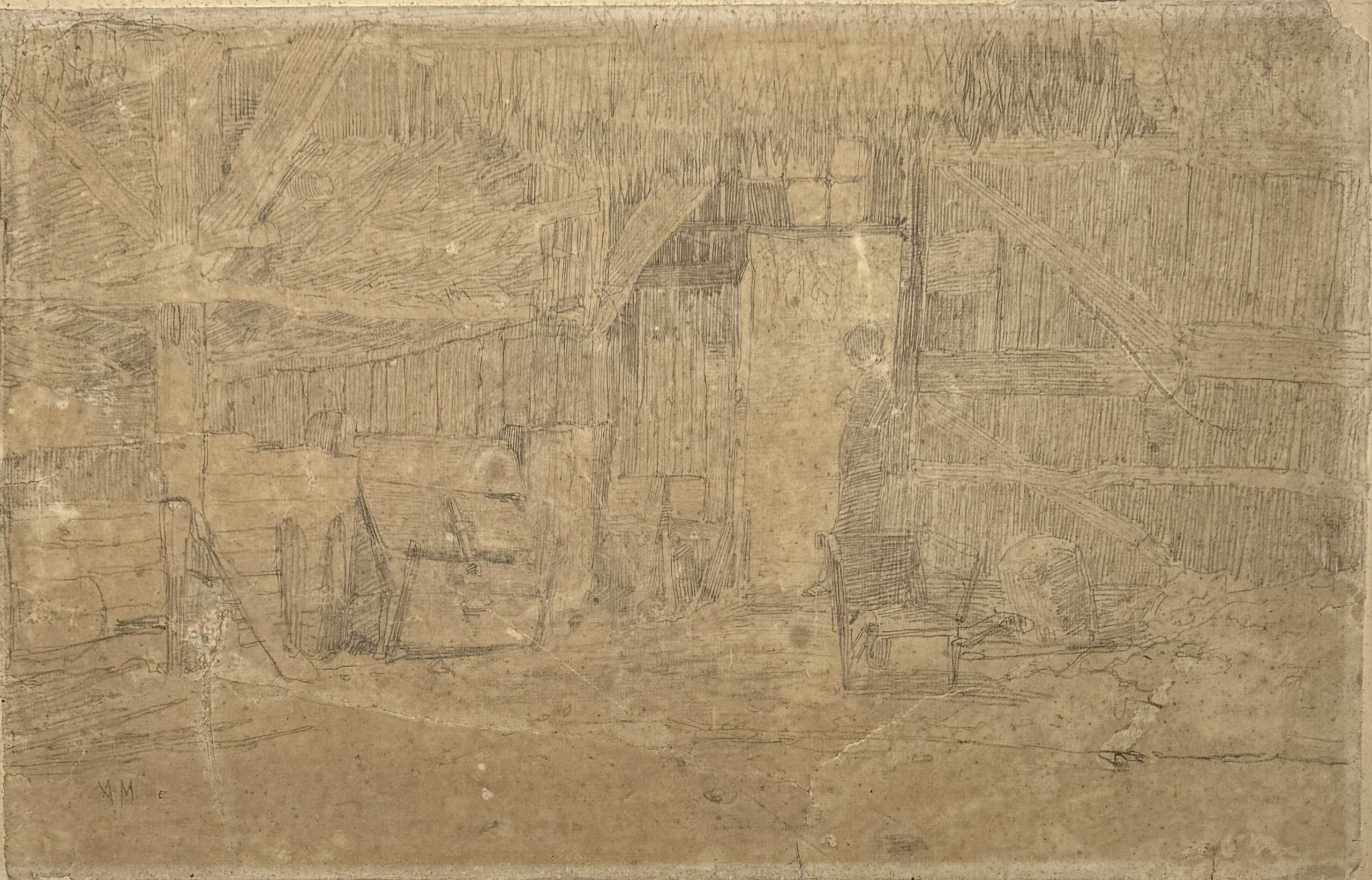 Schetsmatige ets op papier door Anton Mauve (1838–1888), Haagse School. Het werk uit de tweede helft 19e eeuw toont het interieur van een boerenstal in een naturalistisch realistische stijl. De voorstelling is opgebouwd uit fijne arcering en bevat de initialen 'A M' op de voorzijde linksonder. Klaar om te bieden? Registreer je nu en doe mee aan de veiling! |