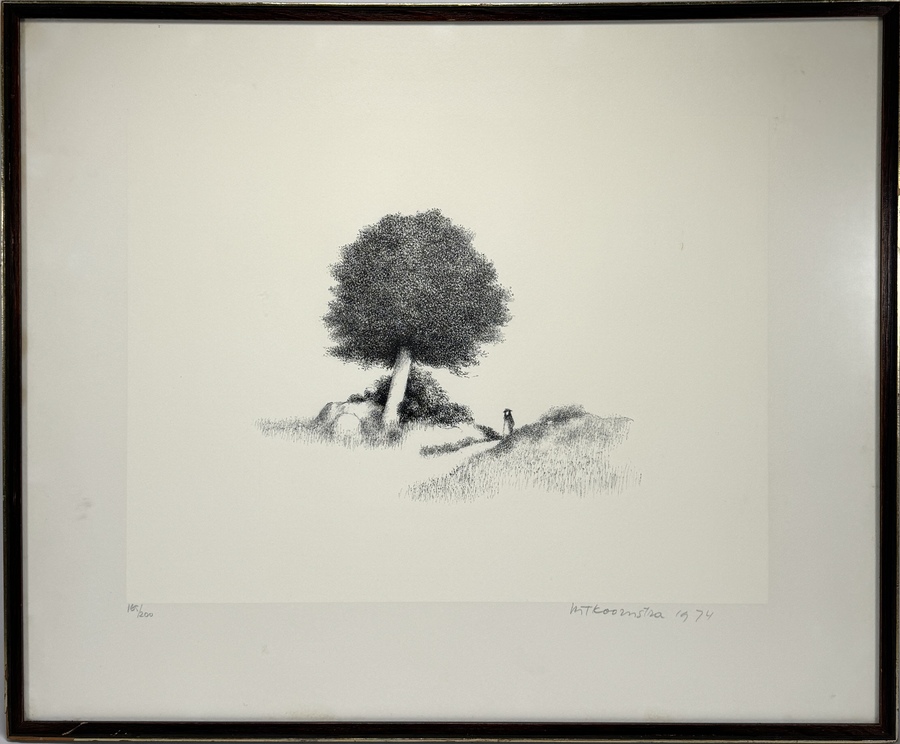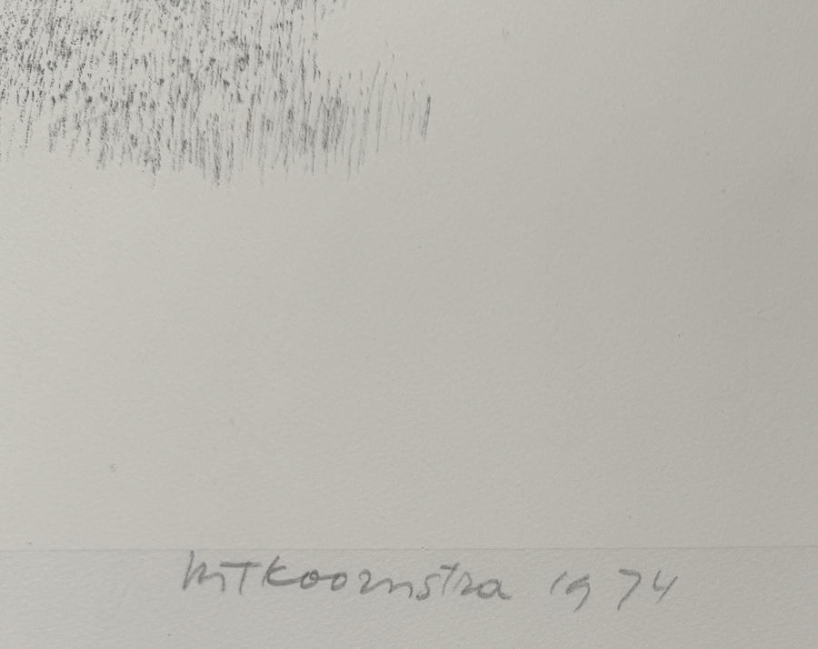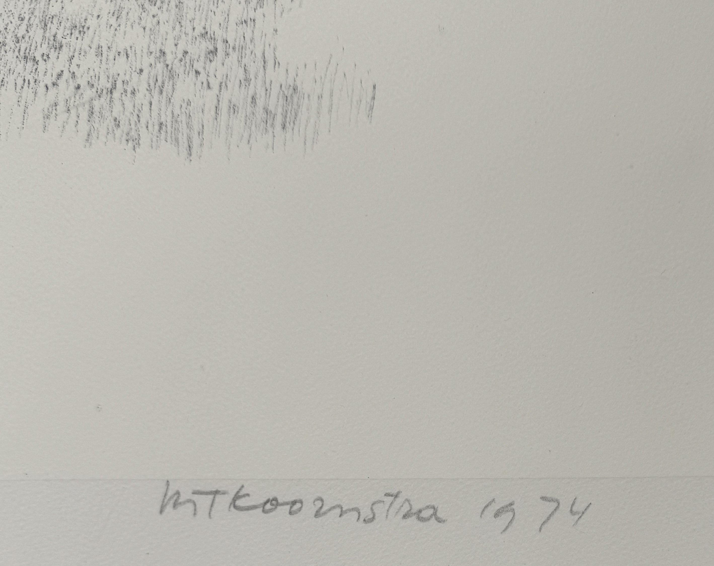 Ets op papier door Metten Koornstra (1912–1978), rechtsonder gesigneerd en gedateerd MT Koornstra 1974, met potlood linksonder het oplagenummer 165/200. De ets toont een minimalistisch landschap met een solitaire boom en een kleine wandelende figuur in een magisch-realistische sfeer. Klaar om te bieden? Registreer je nu en doe mee aan de veiling! |
