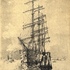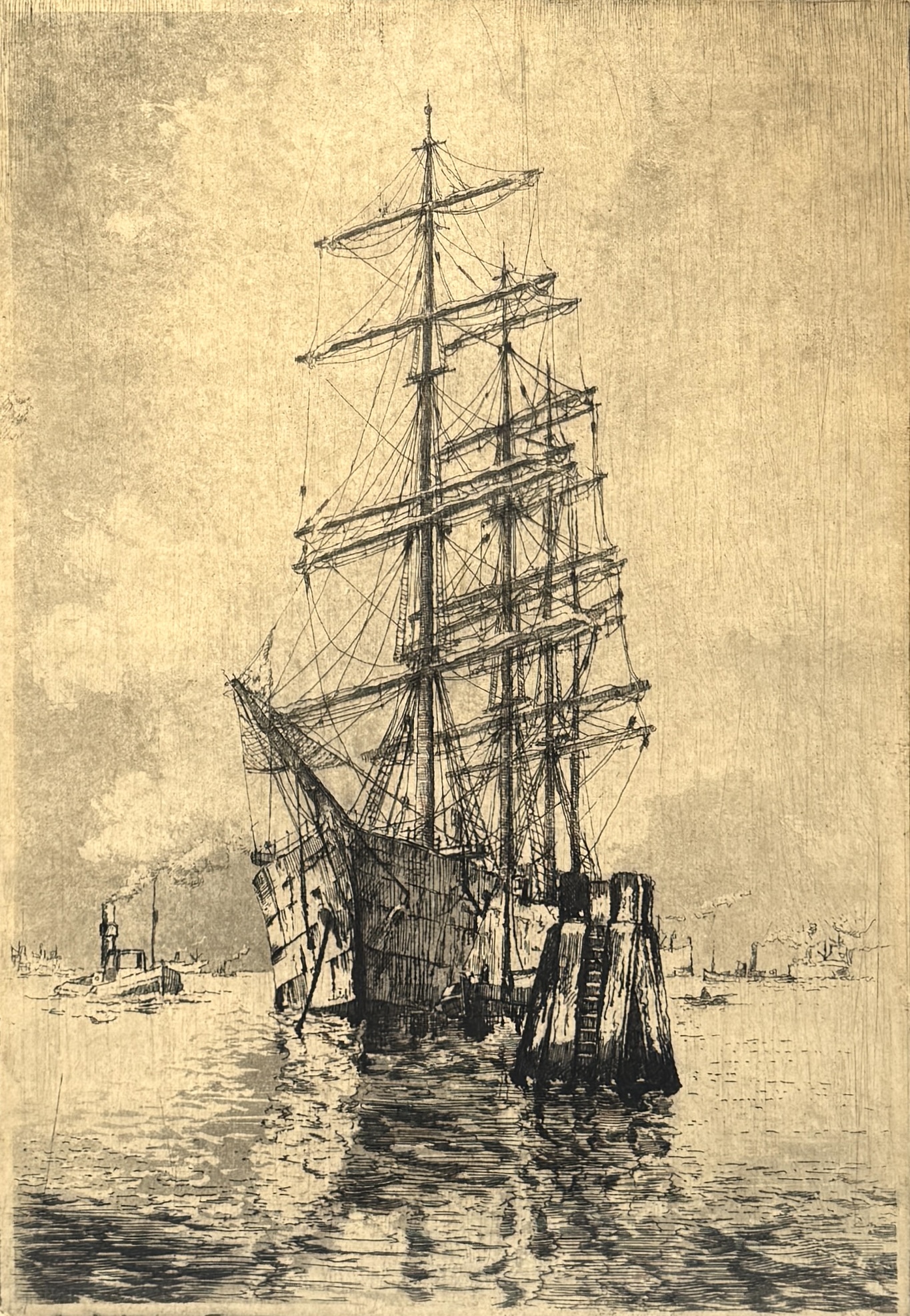Ets, Marius de Jongere, “Rotterdam, Bark Ponapé a/d Maashaven”, midden 20e eeuw