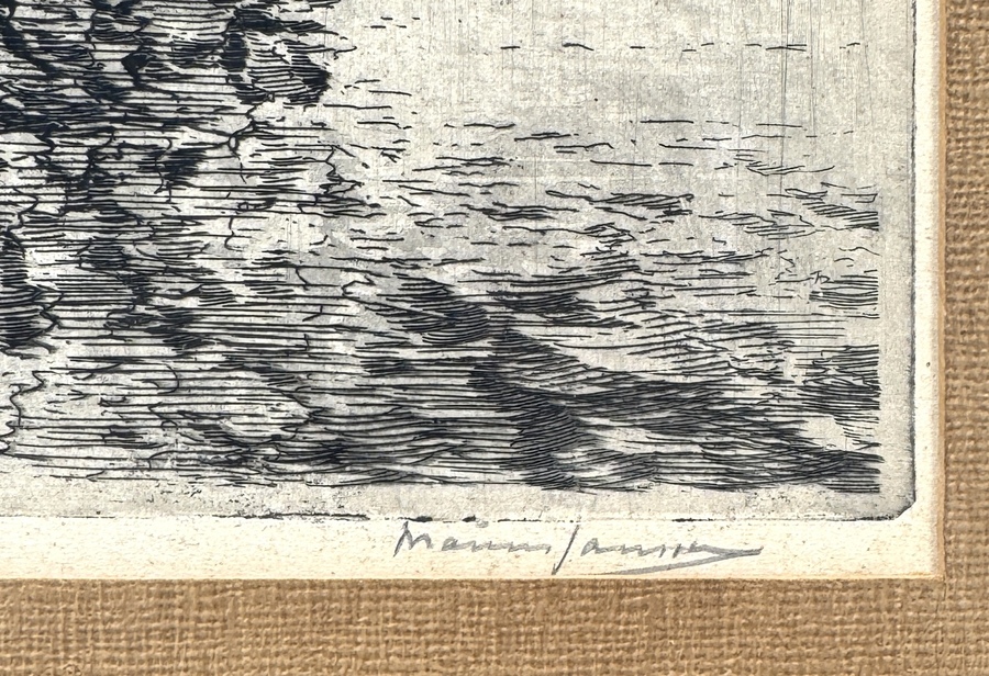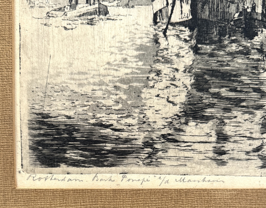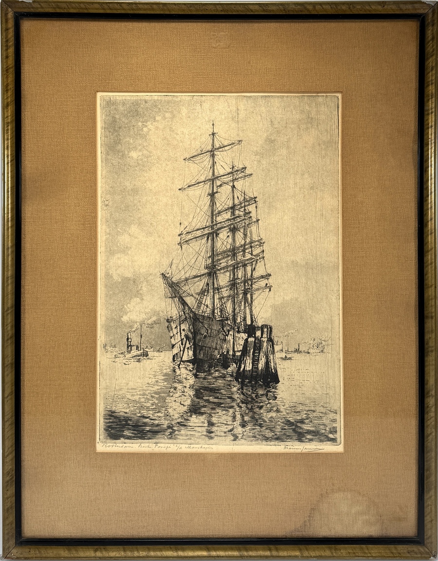 Ets door de Rotterdamse kunstenaar Marius de Jongere (1912-1977), gesigneerd rechtsonder met pseudoniem Marinus Jansen. De voorstelling toont de stalen bark Ponapé aangemeerd in de Maashaven te Rotterdam. Het werk is uitgevoerd in zwarte inkt op papier en dateert uit het midden van de 20e eeuw. Linksonder is de titel met potlood geschreven. De compositie bevat gedetailleerde tuigage en havenactiviteit. Ontdek deze ets en voeg het toe aan jouw collectie! Registreer nu voor de veiling. |