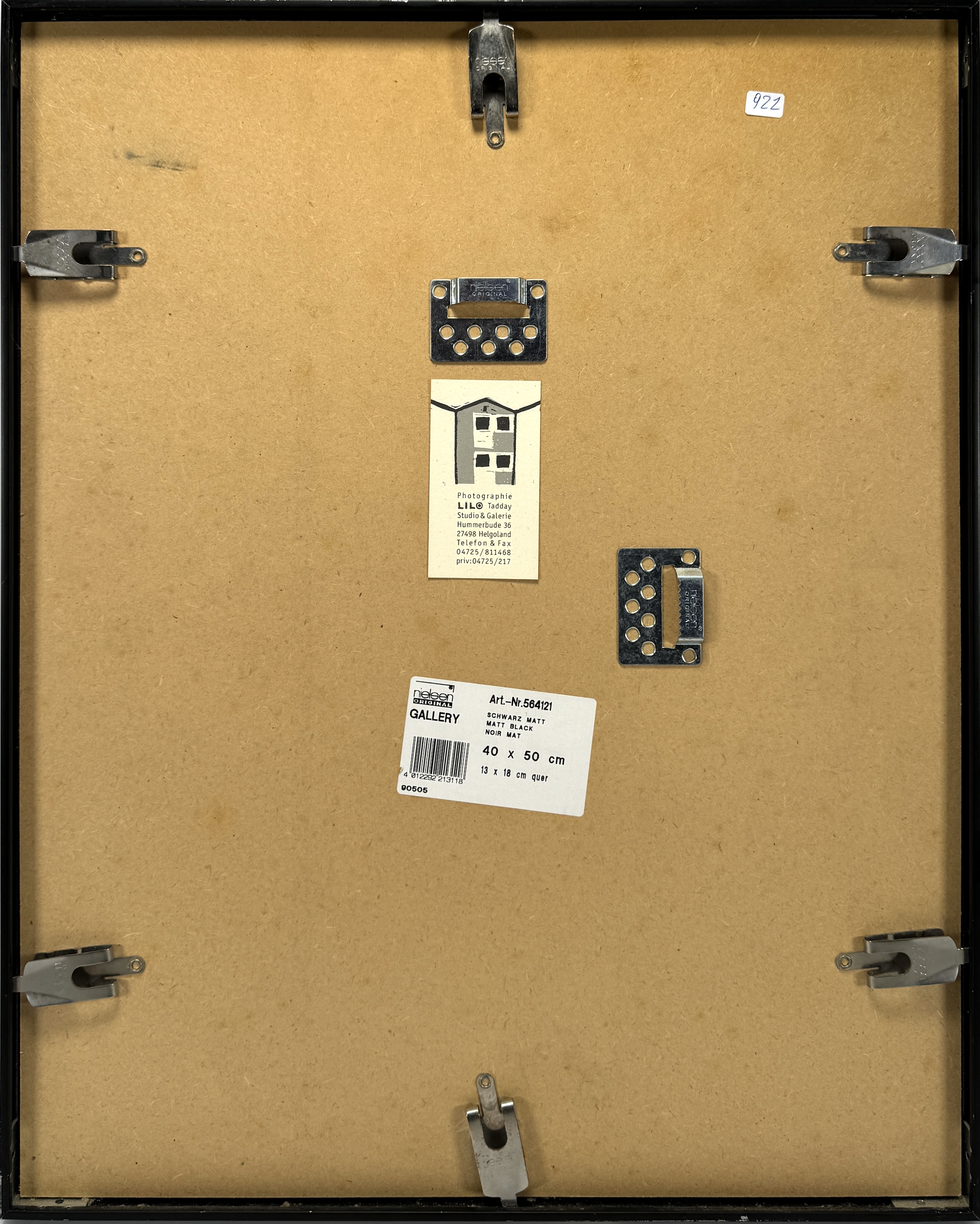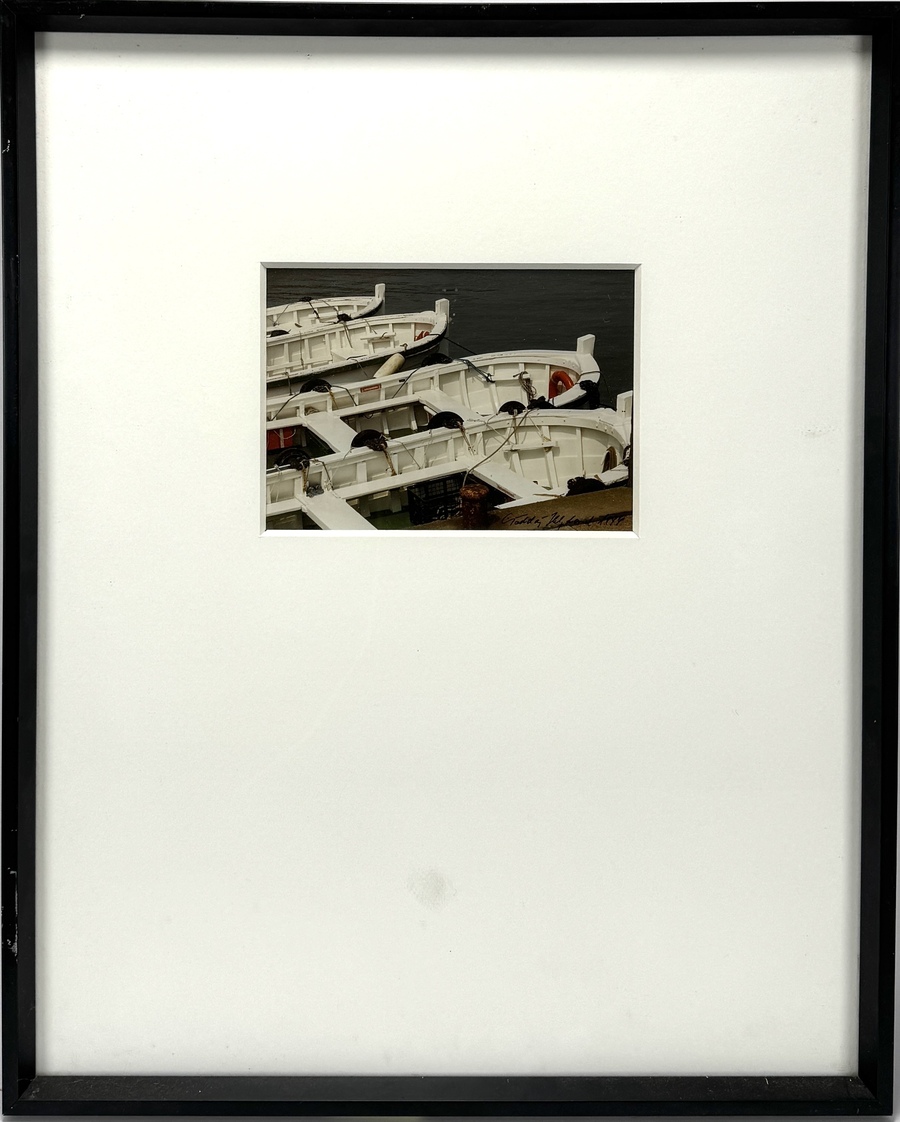 Ingelijste chromogene kleurenfoto (C-print) uit 1994 van een onbekende fotograaf, toont vier witte Börteboten op Helgoland, waarbij de focus ligt op vorm en contrast met het donkere water. Het werk is gesigneerd met de locatie en het jaartal "Goddag Helgoland 1994". Wil je direct deelnemen? Plaats vanaf 21 november alvast een schriftelijk bod via onze website! |