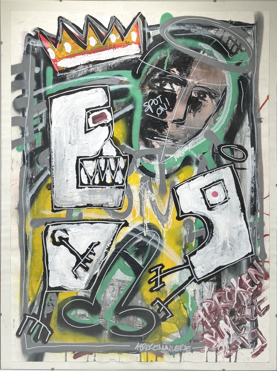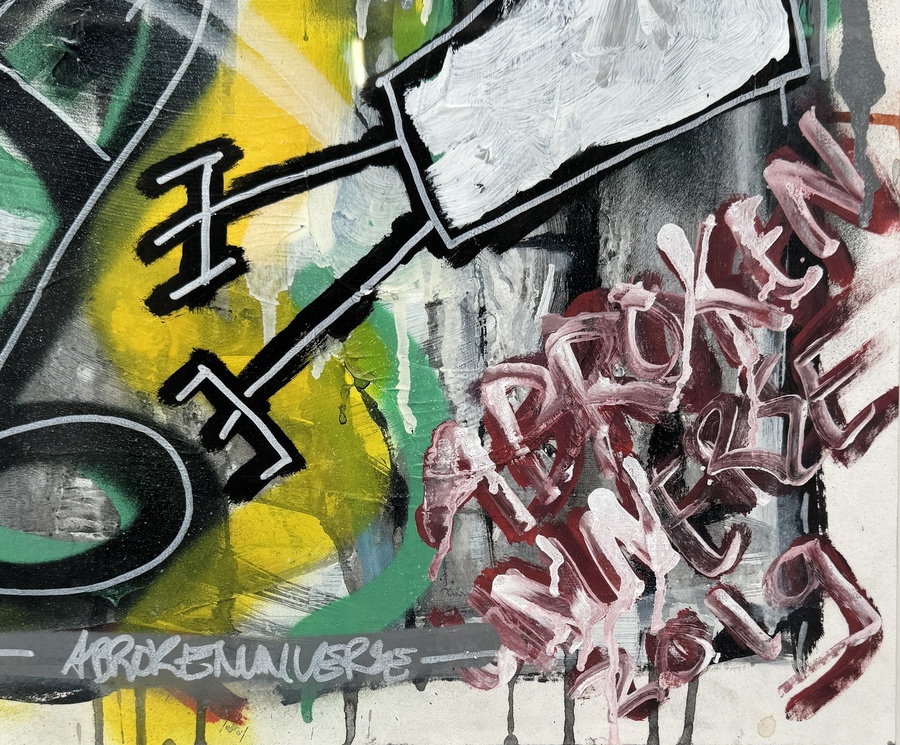 Mixed media werk is een schildering door A BROKEN UNIVERSE (een Ecuadoraanse kunstenaar, gevestigd in Nederland), rechtsonder gesigneerd en gedateerd 2019. Het doek combineert acrylverf, spuitverf en stift in een Urban Art/neo-expressionistische stijl. De compositie toont gestileerde figuren en een kroon, met graffiti-elementen. Eerst dit schilderij zien voordat je biedt? Bezoek onze kijkdagen op 28, 29 en 30 november van 11:00 tot 17:00 uur! |