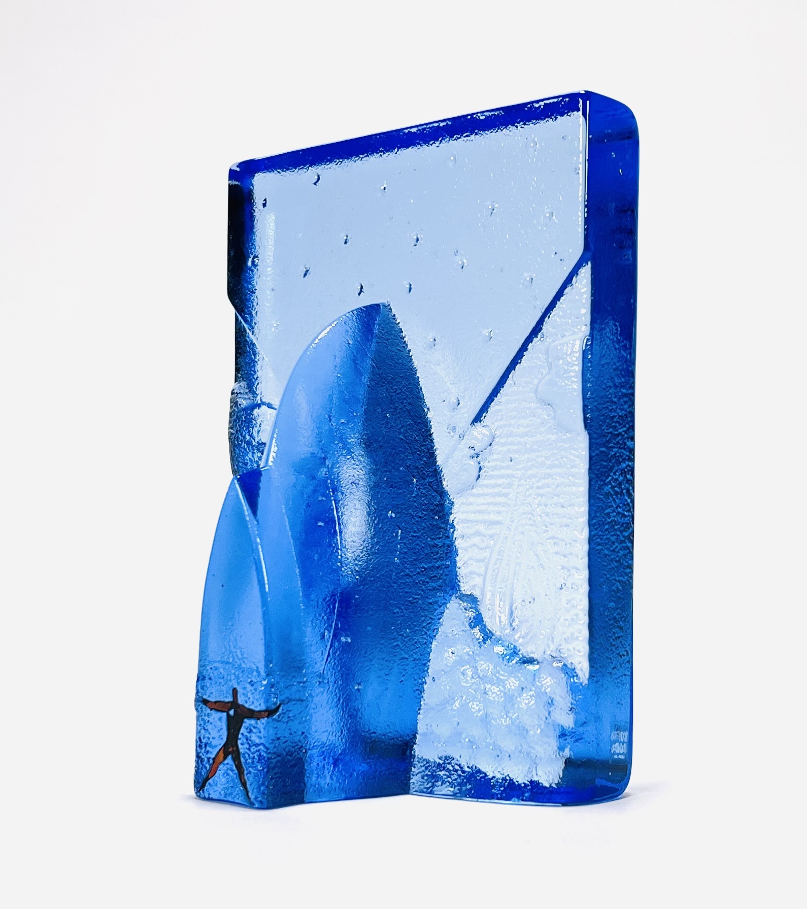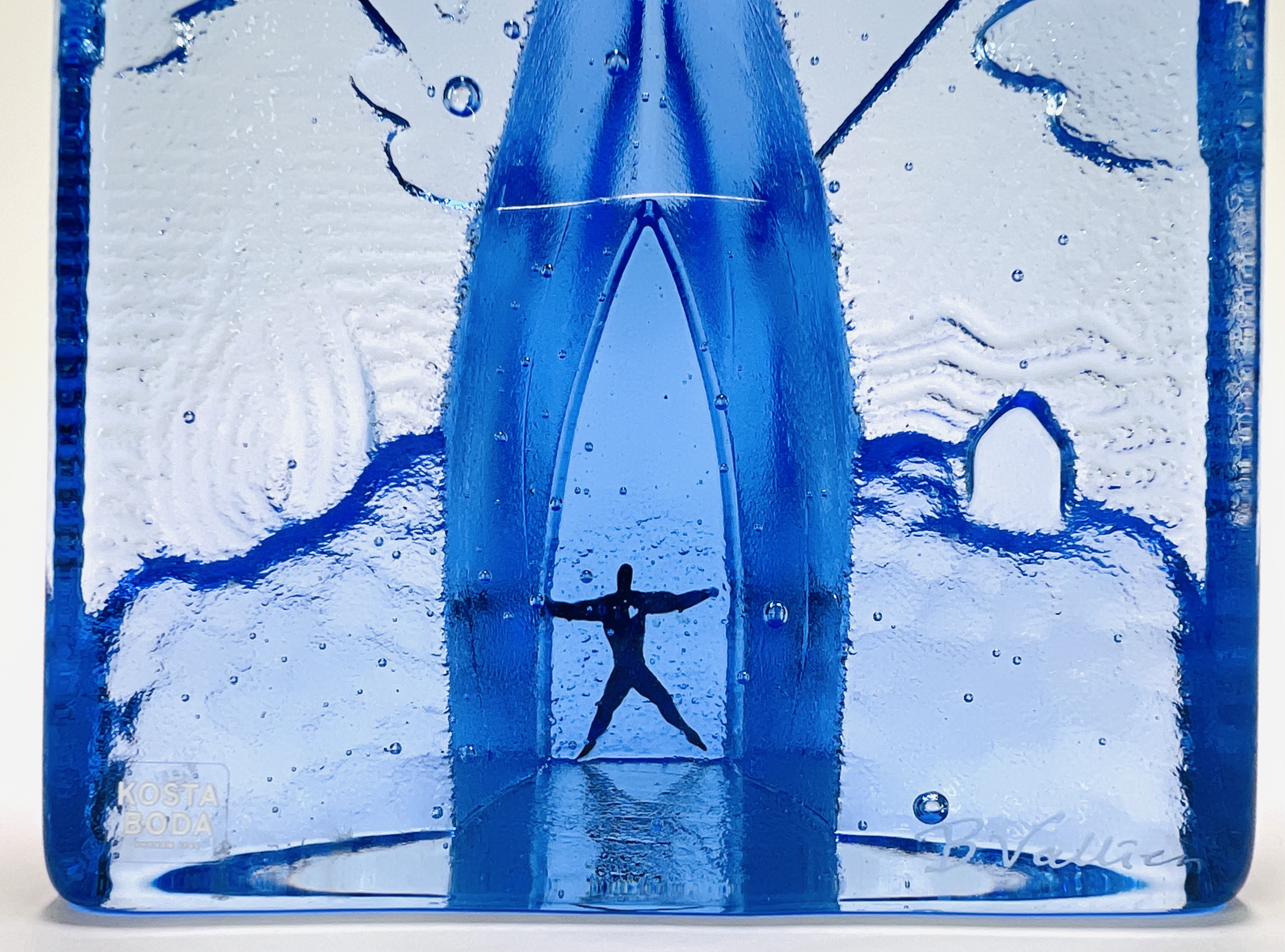 Glasobject "Blues" door Bertil Vallien (1938) voor Kosta Boda Zweden, eind 20e eeuw. In blauw glas toont een centrale oprijzende poortvorm in reliëf en een menselijk silhouet met gespreide armen. Het is aan de achterzijde gesigneerd en voorzien van sticker Kosta Boda. Registreren nu en bied eenvoudig online mee op deze sculptuur! |