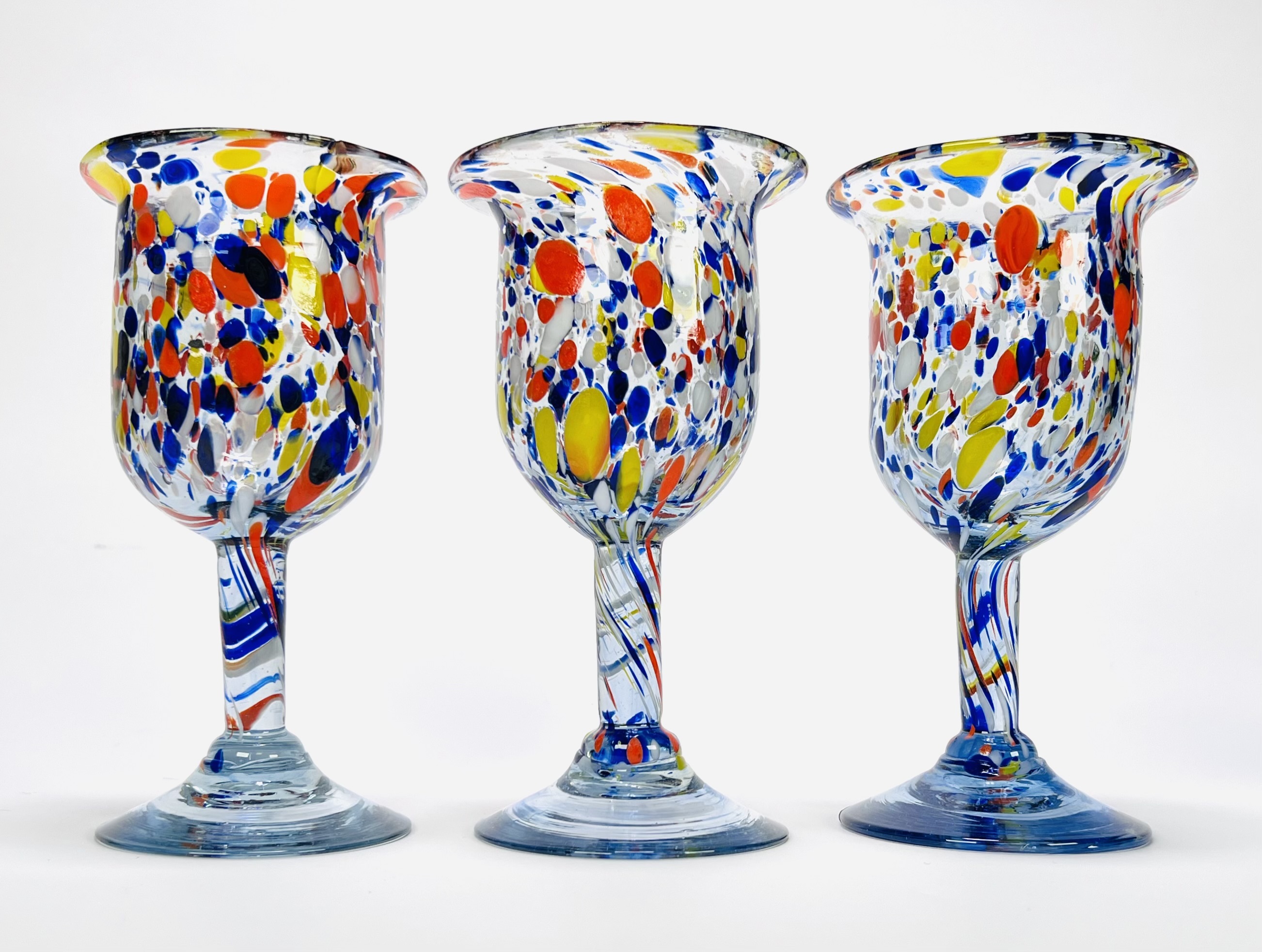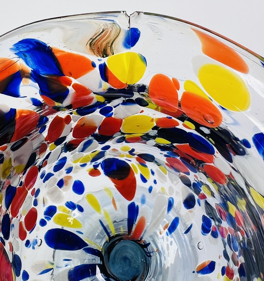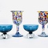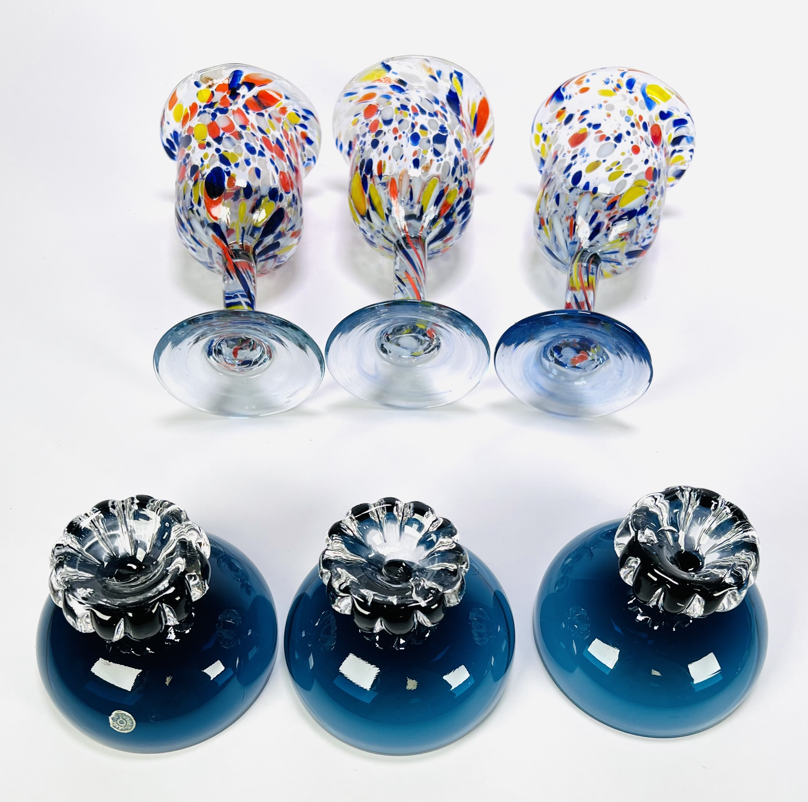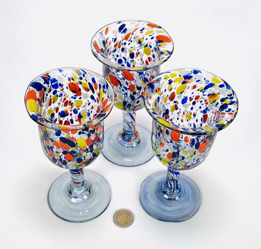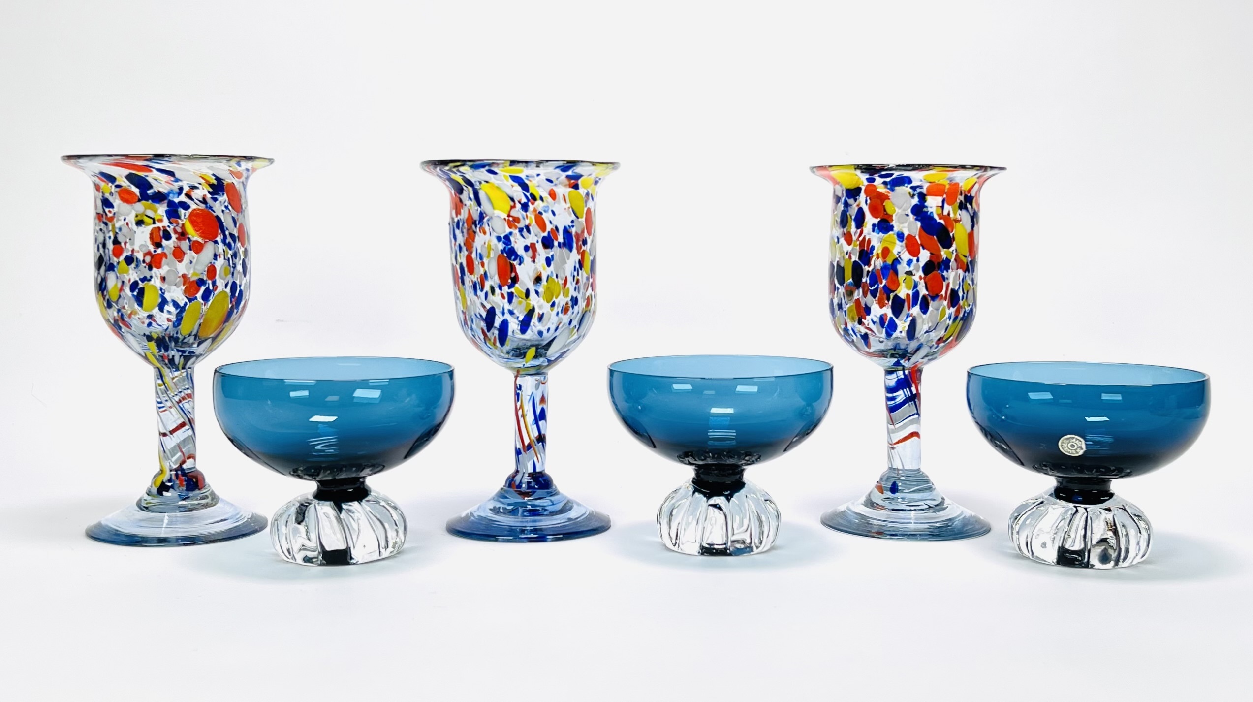Set van zes handgeblazen glazen in Mid-century modern stijl bestaande uit drie diepblauwe coupes, gemerkt met sticker Made in Sweden, met geribbelde heldere voet en drie kelkglazen met meerkleurige ingesmolten glaskleurfragmenten. De glazen zijn vervaardigd in de derde kwart 20e eeuw en tonen zowel strak Scandinavisch design als expressieve glasblazerstechnieken. Klaar om te bieden? Registreer je nu en doe mee aan de veiling! |