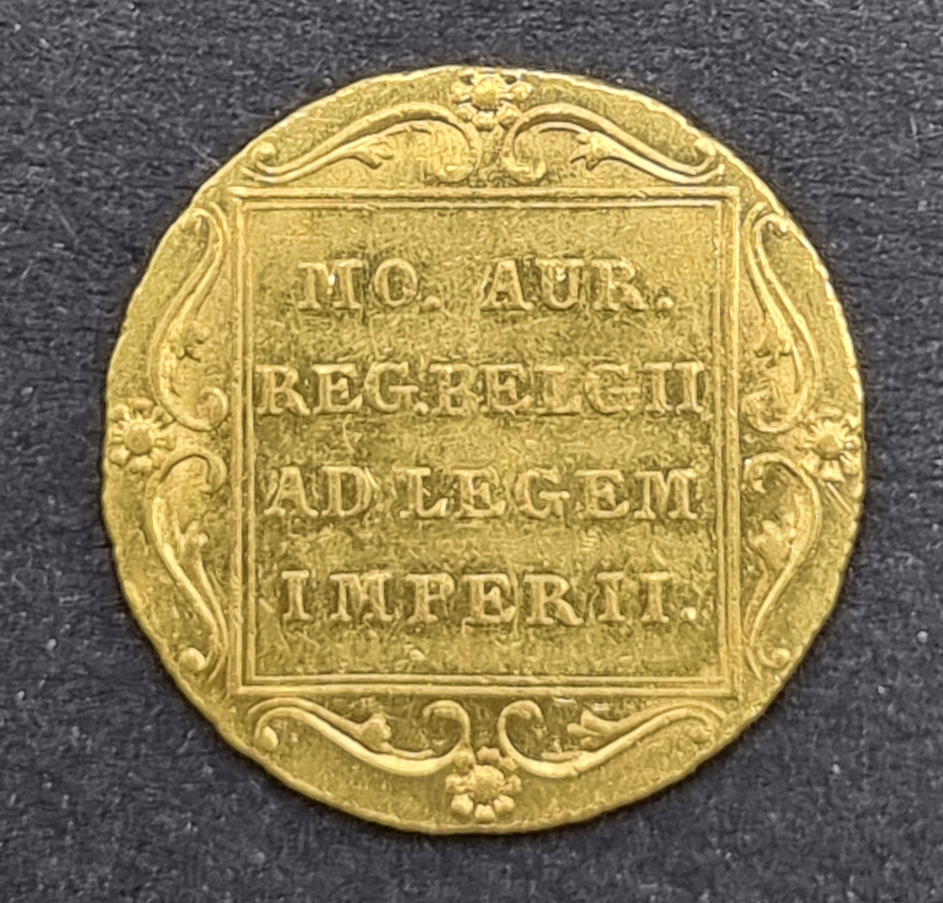 Gouden dukaat, Moneta Aurea Regni Belgii, geslagen in 1849 in Nederland tijdens de regeerperiode van Koning Willem III. De munt van 983/1000 goud toont de traditionele staande ridder en het devies "CONCORDIA RES PARVAE CRESCUNT". De keerzijde bevat de Latijnse legende met bloemornamenten in barokstijl. Geïnteresseerd? Bezoek onze kijkdagen op 28, 29 of 30 november van 11:00 tot 17:00 uur! |