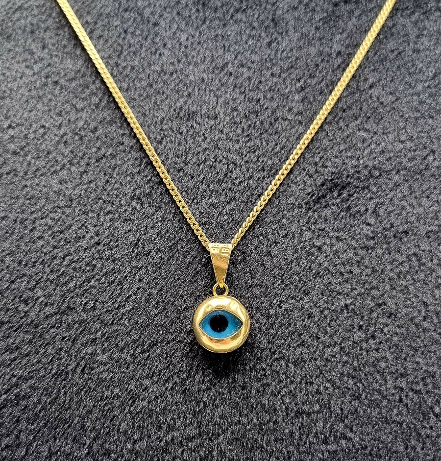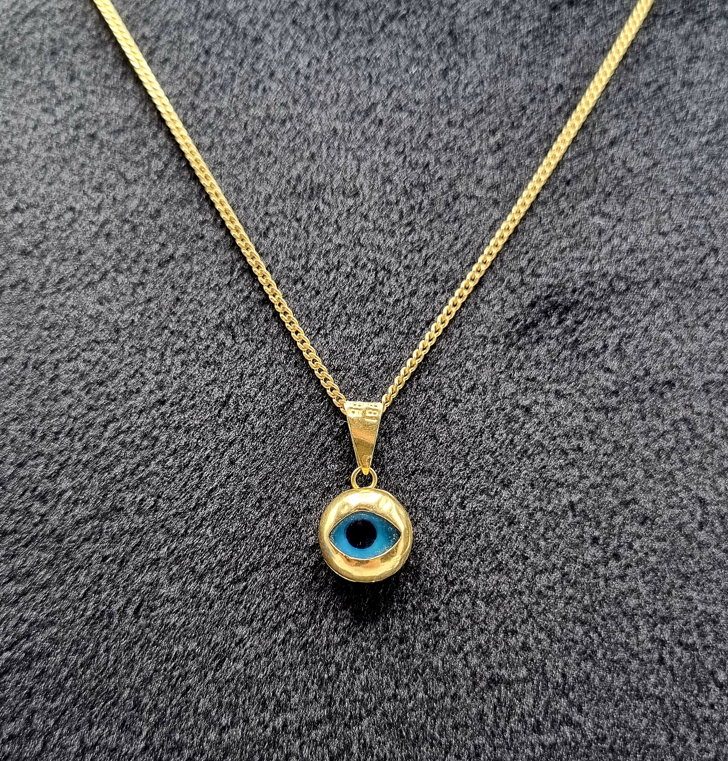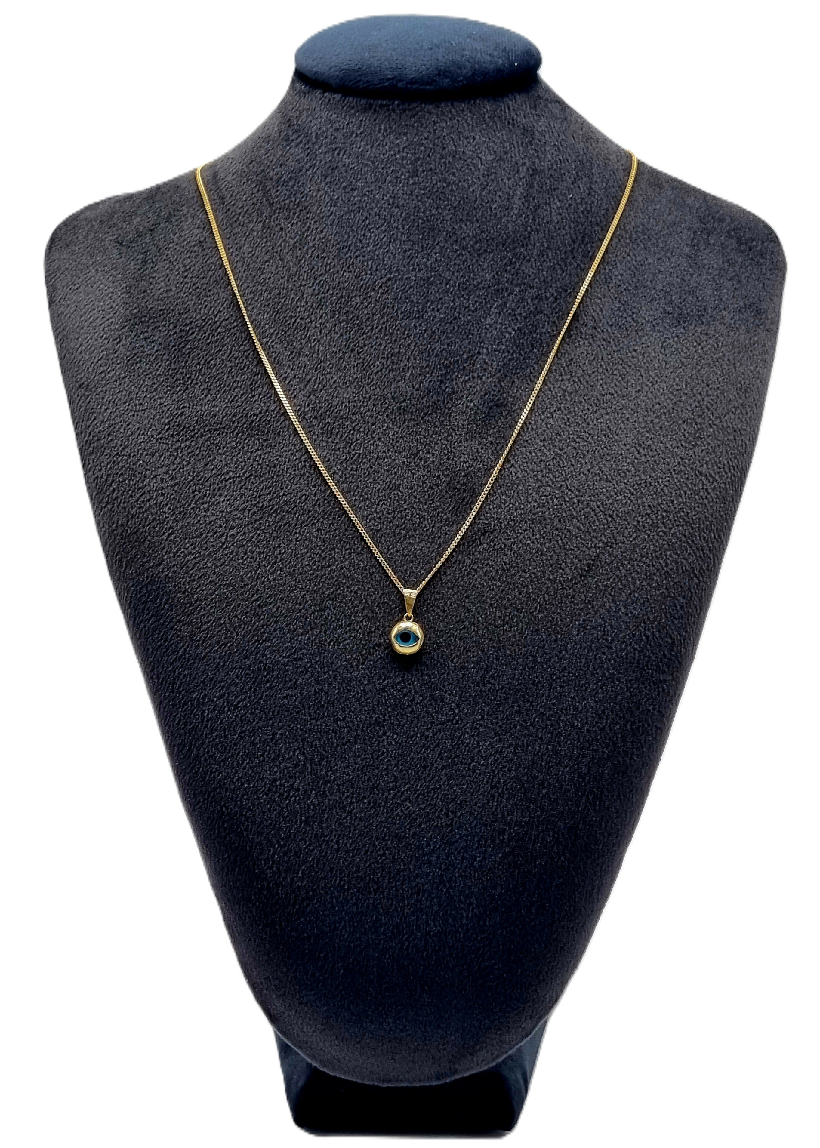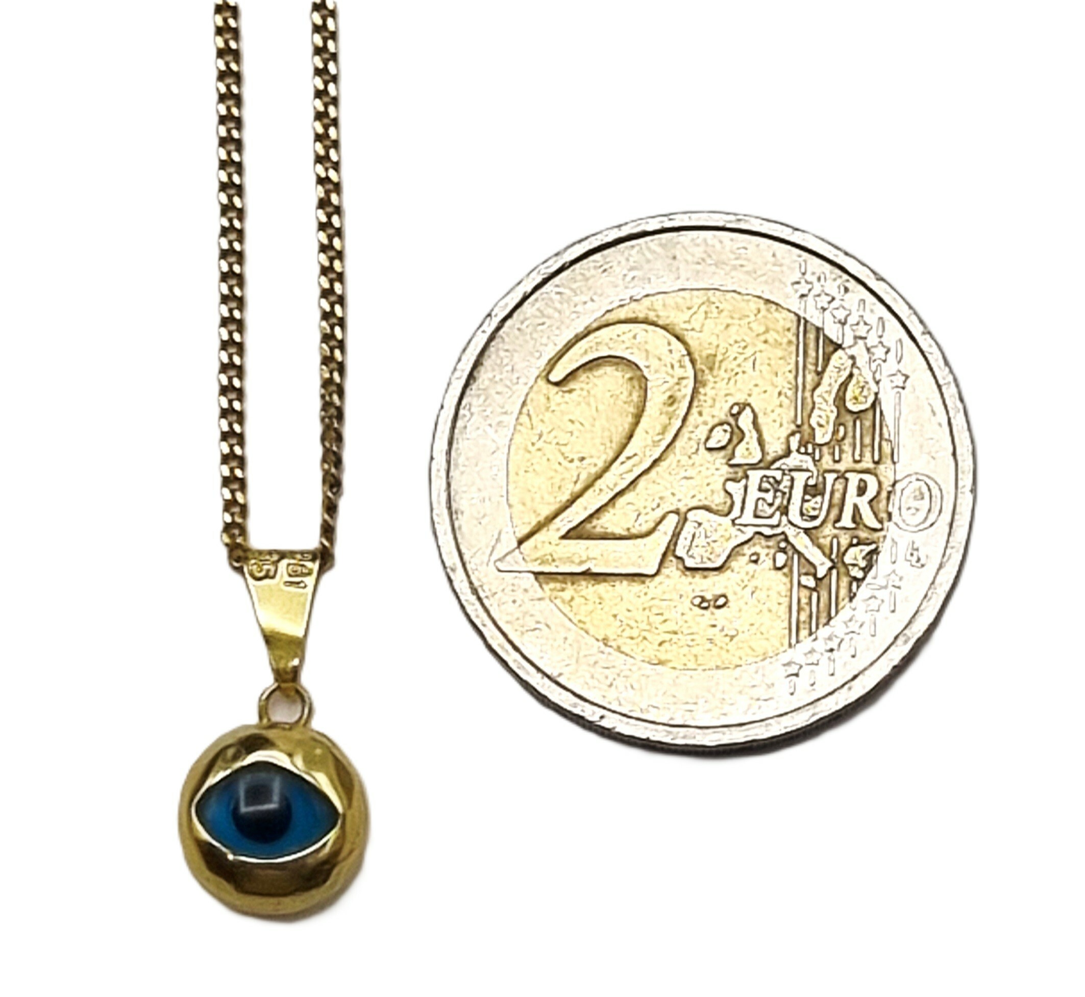 Gouden curb chain halsketting met hanger vervaardigd uit 14 karaat geelgoud (585 gemerkt) en stamt uit de tweede helft 20e eeuw. De hanger is in de vorm van het traditionele nazar oog motief, ingelegd met blauw en zwart glas. Kom langs tijdens de kijkdagen (28 t/m 30 november) en ontdek de halsketting zelf! |
