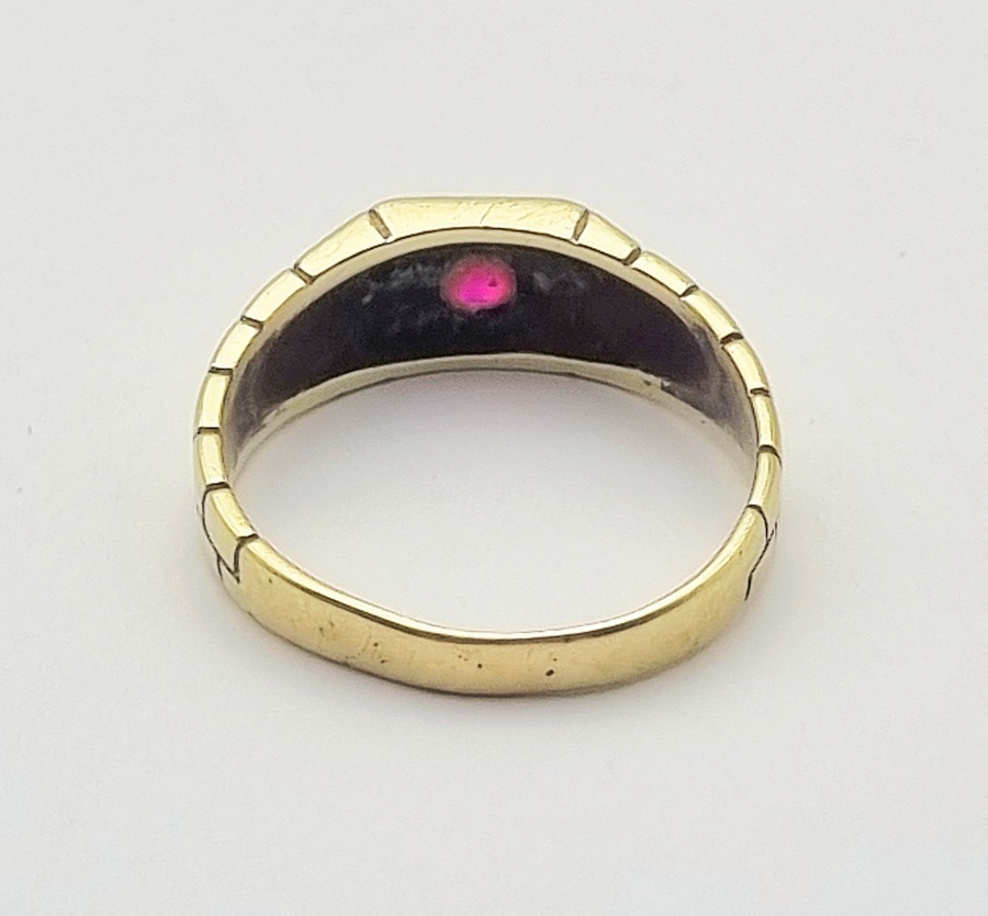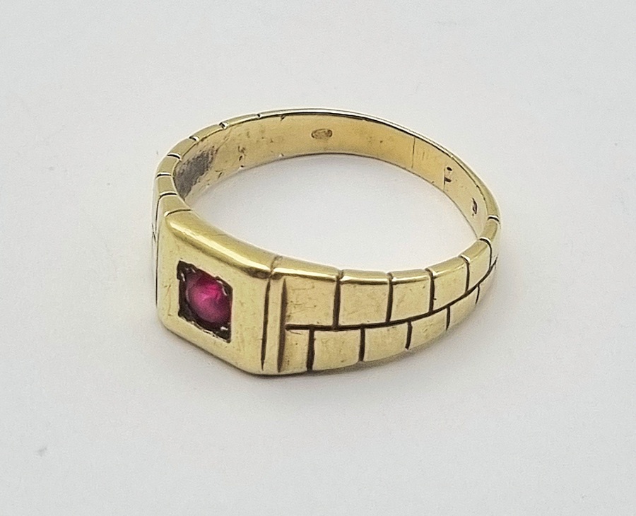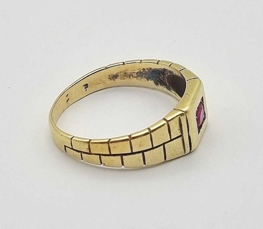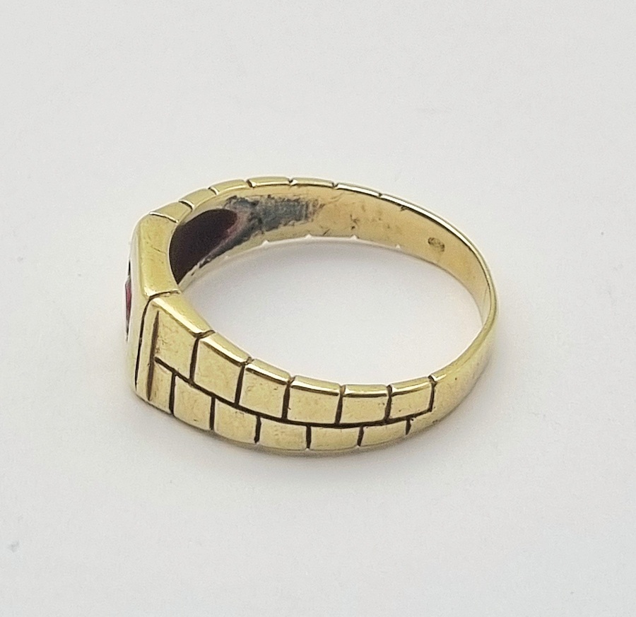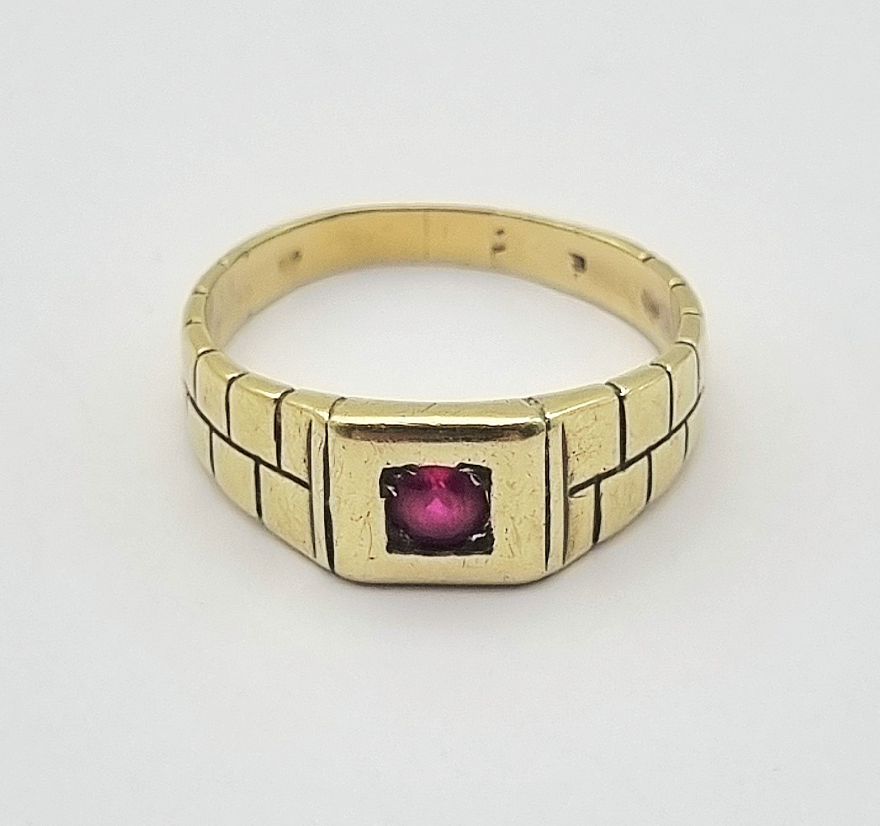Gouden 14 karaat ring in Mid-century modern stijl, Nederland, gedateerd circa 1950 tot 1970. De scheen is gedecoreerd met een geometrisch baksteenmotief door middel van graveren. Centraal in een vierkante kastzetting bevindt zich een facetgeslepen robijn. De ring is vervaardigd door gieten en graveren en gemerkt met het eikenblad. De ring zelf beoordelen? Je bent welkom op onze kijkdagen op 28, 29 en 30 november! |