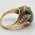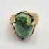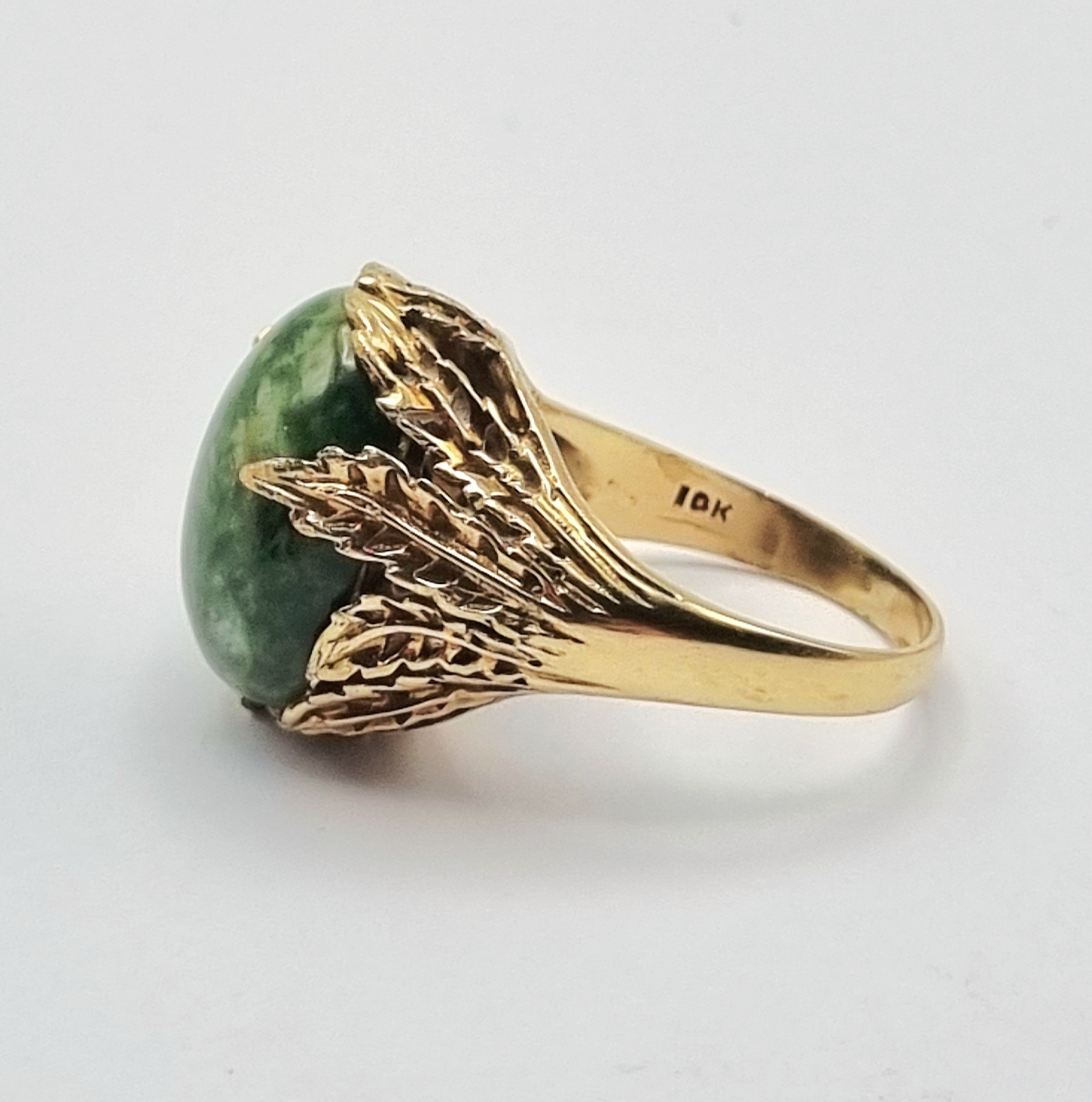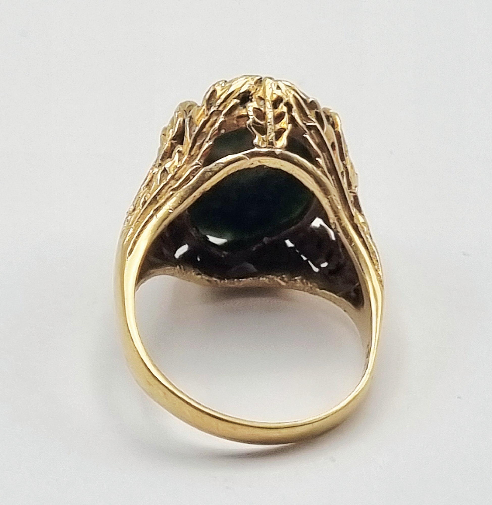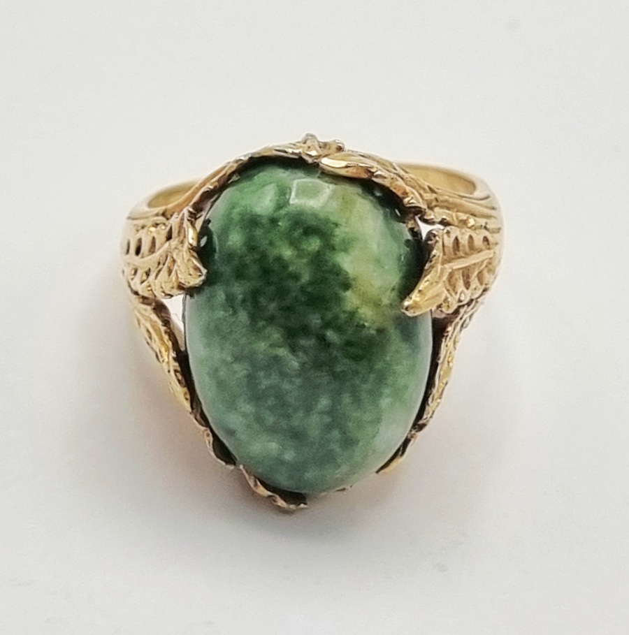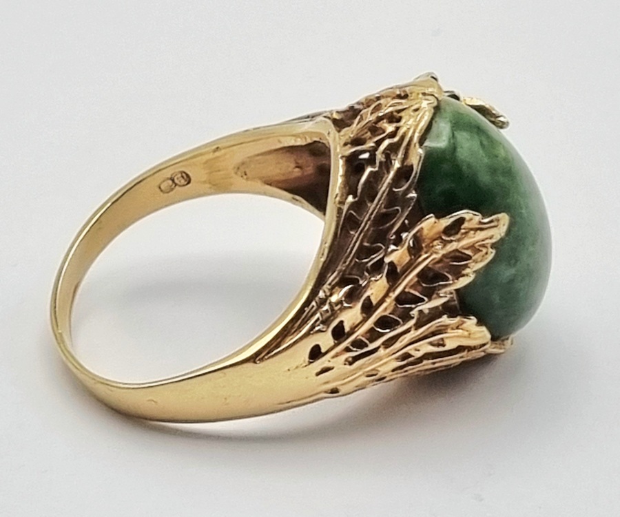 Gouden ring vervaardigd uit 10 karaat geelgoud (gemerkt 10K) uit de midden 20e eeuw. Het juweel in Mid-century modern stijl heeft een grote ovale aventurien cabochon. De steen is gezet in een opengewerkte gegoten zetting met een decoratief bladmotief dat contrasteert met de gladde ringscheen. Voeg de ring toe aan je verzameling en doe een bod! |