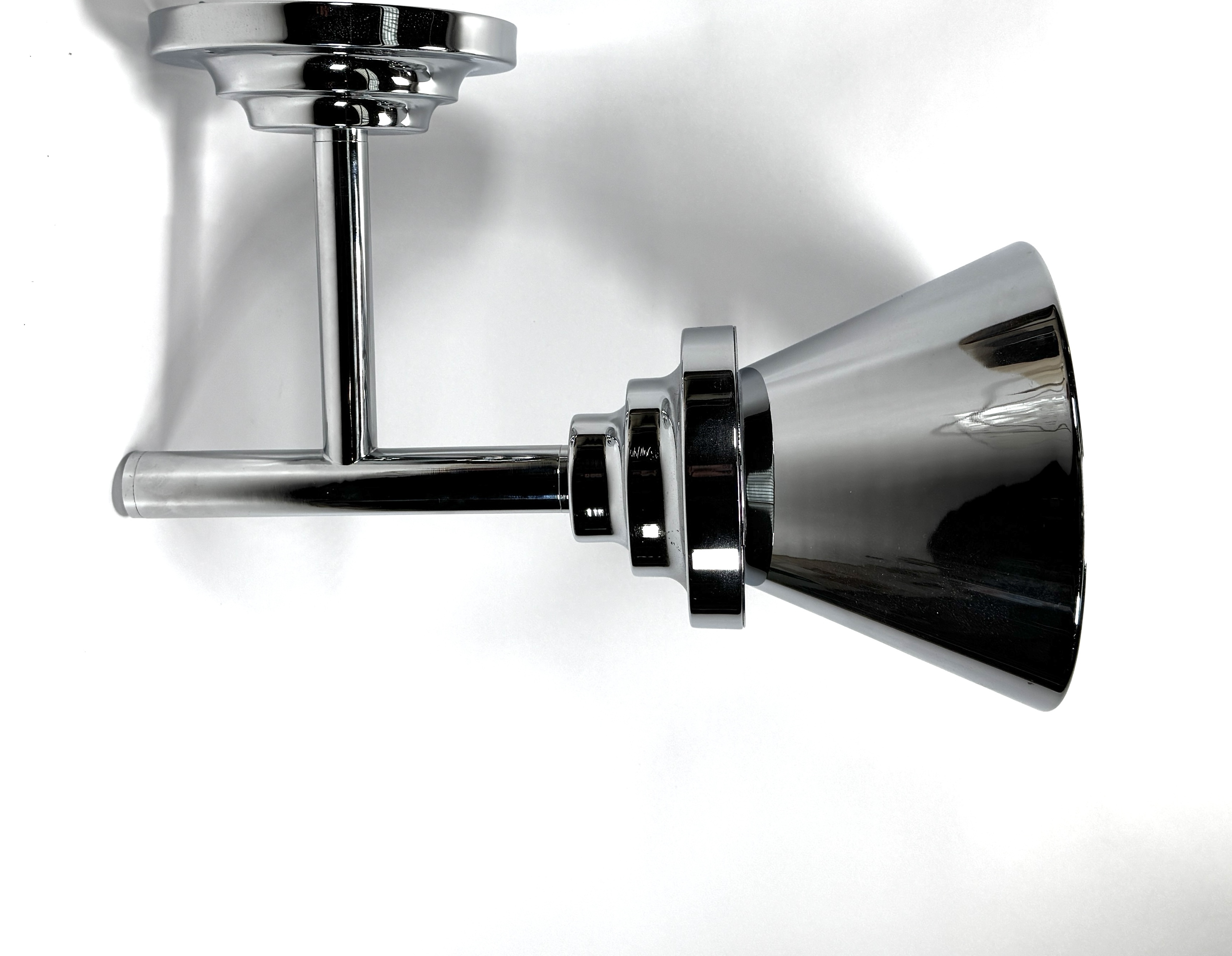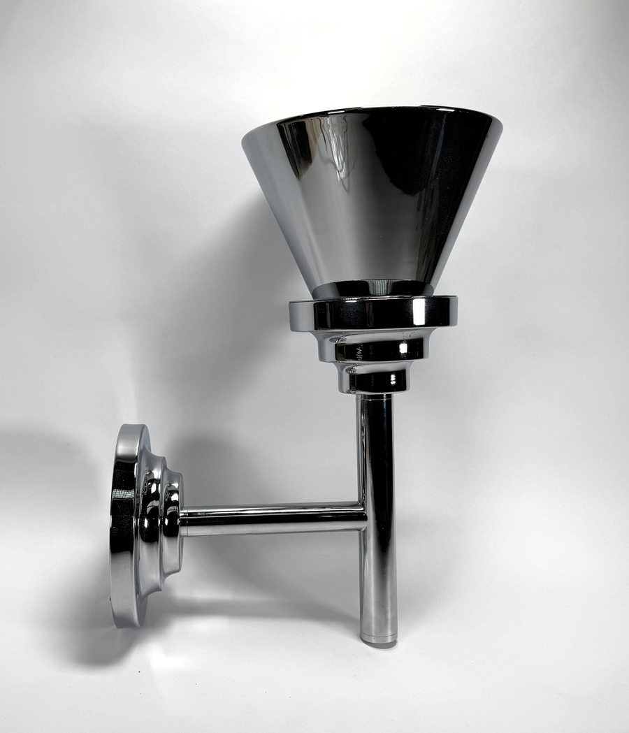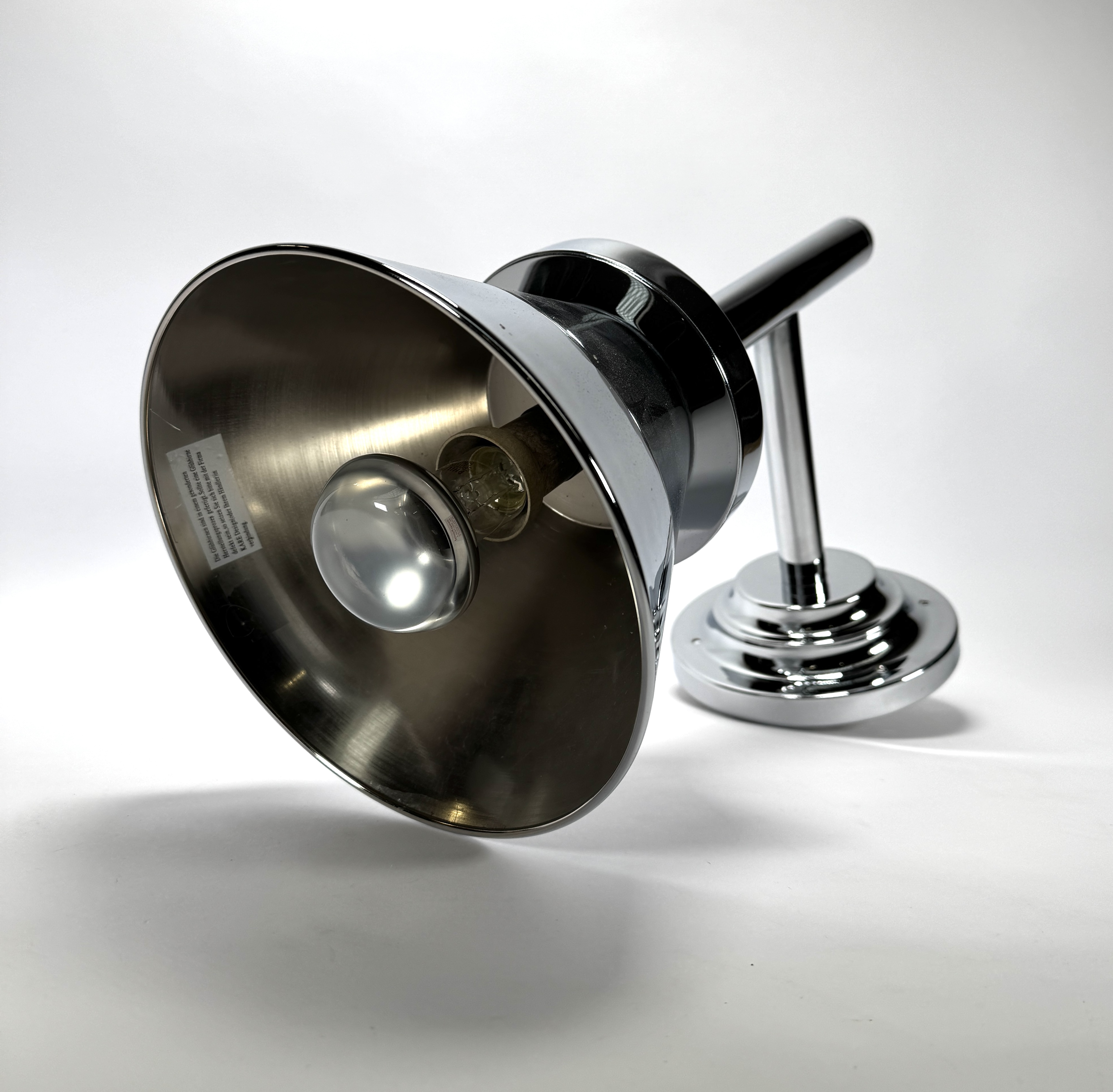 Wandlamp "Olympia" van Kare Design uit Duitsland, vervaardigd uit verchroomd metaal, gedateerd ca. 1990–2010. Het armatuur heeft een moderne Art Deco revival stijl met een cilindrische arm en een omgekeerde conische kap. De lamp is industrieel geproduceerd en maakt gebruik van een GU10 halogeen fitting. Klaar om te bieden? Registreer je nu en doe mee aan de veiling! |