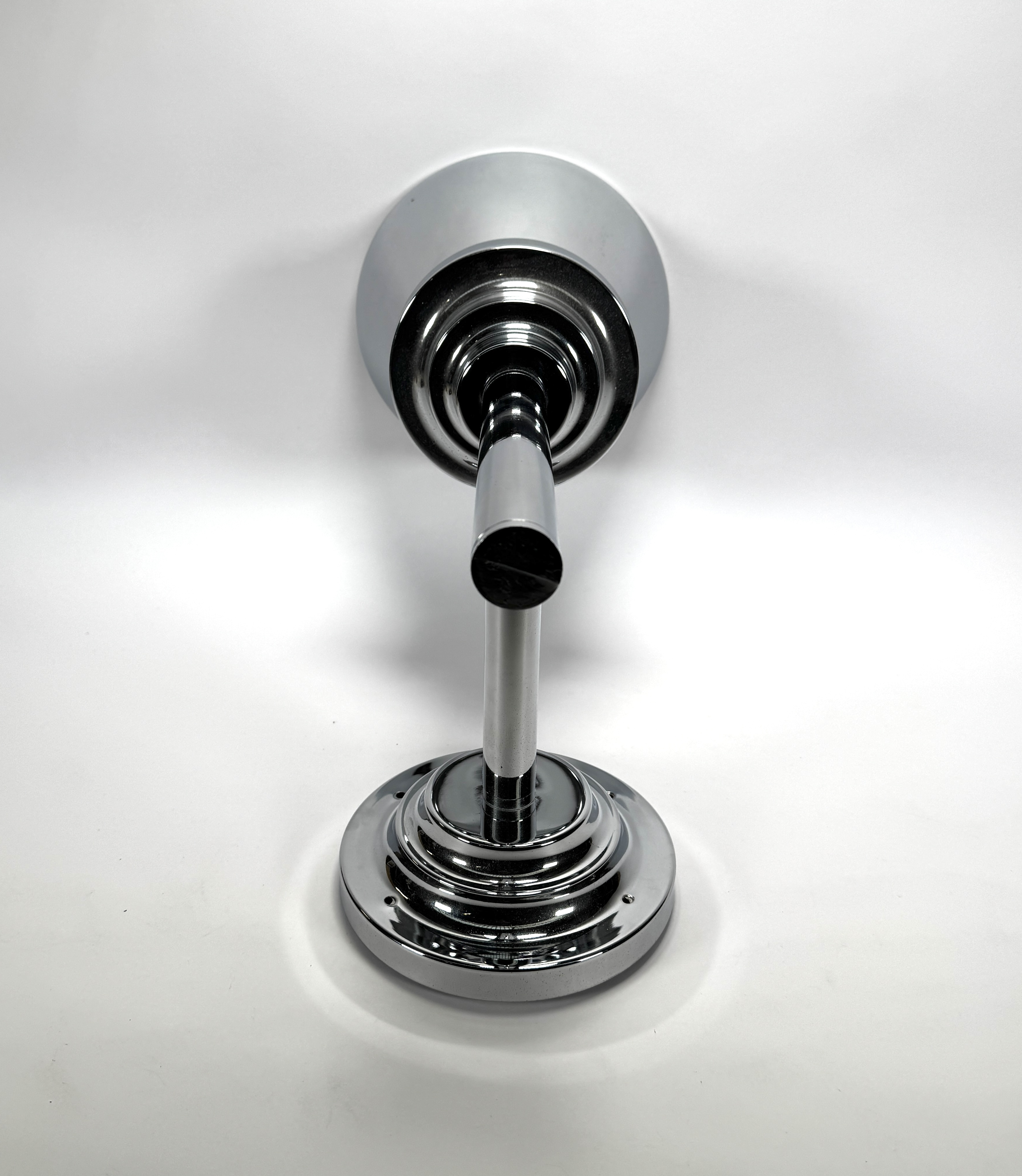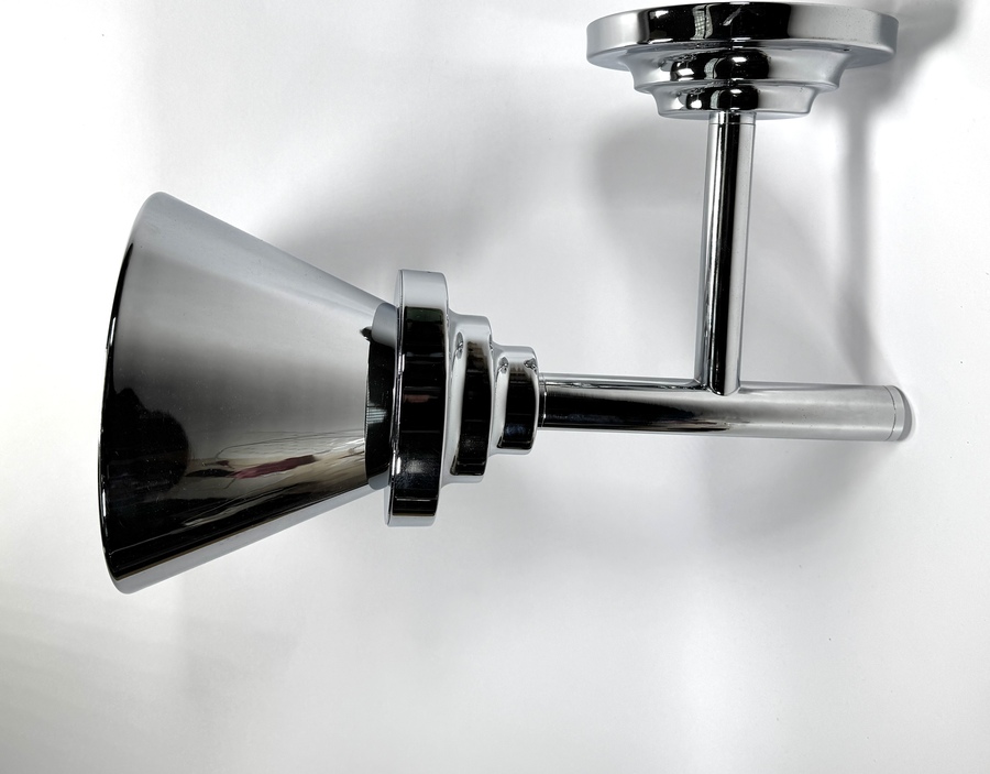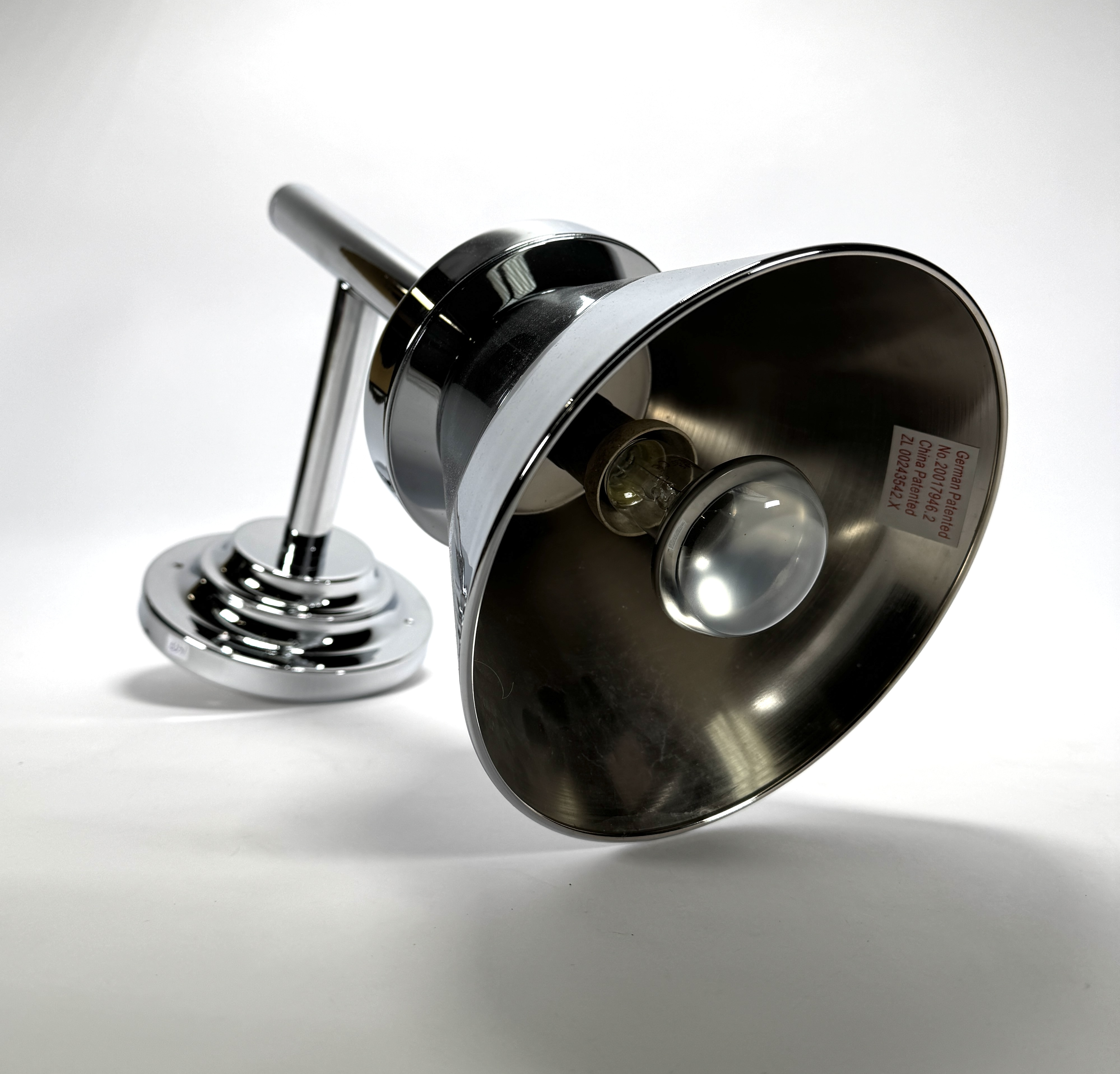 Wandlamp "Olympia" van Kare Design uit Duitsland, vervaardigd uit verchroomd metaal, gedateerd ca. 1990–2010. Het armatuur heeft een moderne Art Deco revival stijl met een cilindrische arm en een omgekeerde conische kap. De lamp is industrieel geproduceerd en maakt gebruik van een GU10 halogeen fitting. Klaar om te bieden? Registreer je nu en doe mee aan de veiling! |