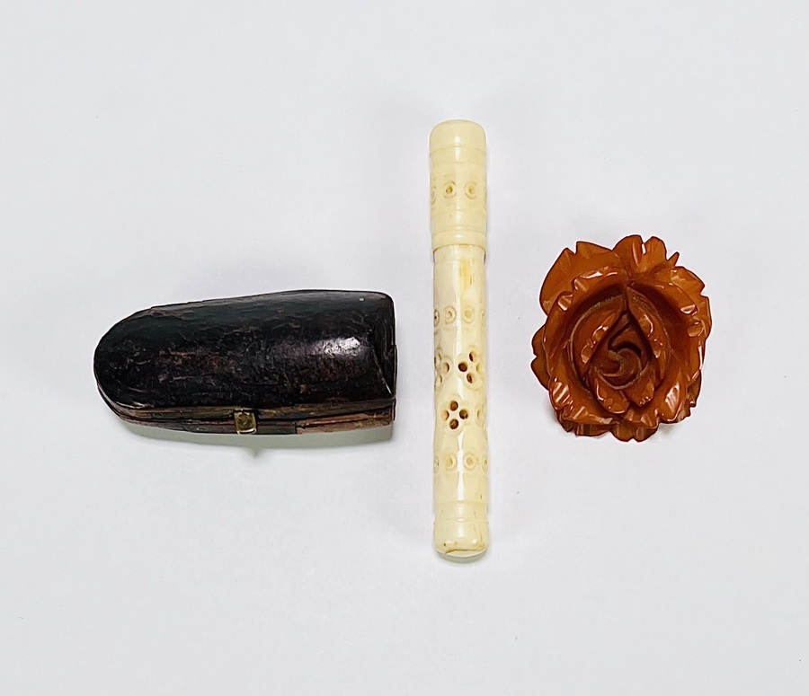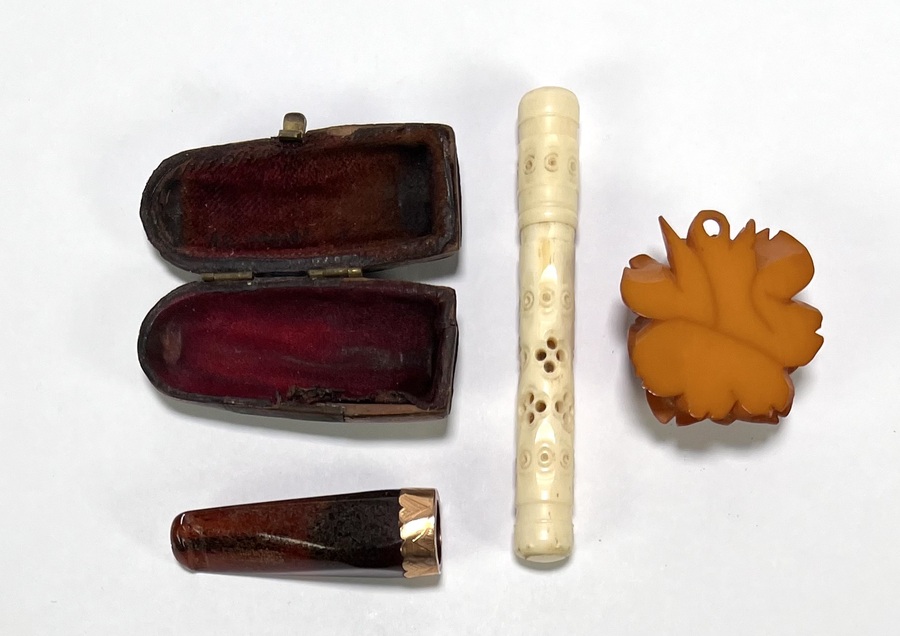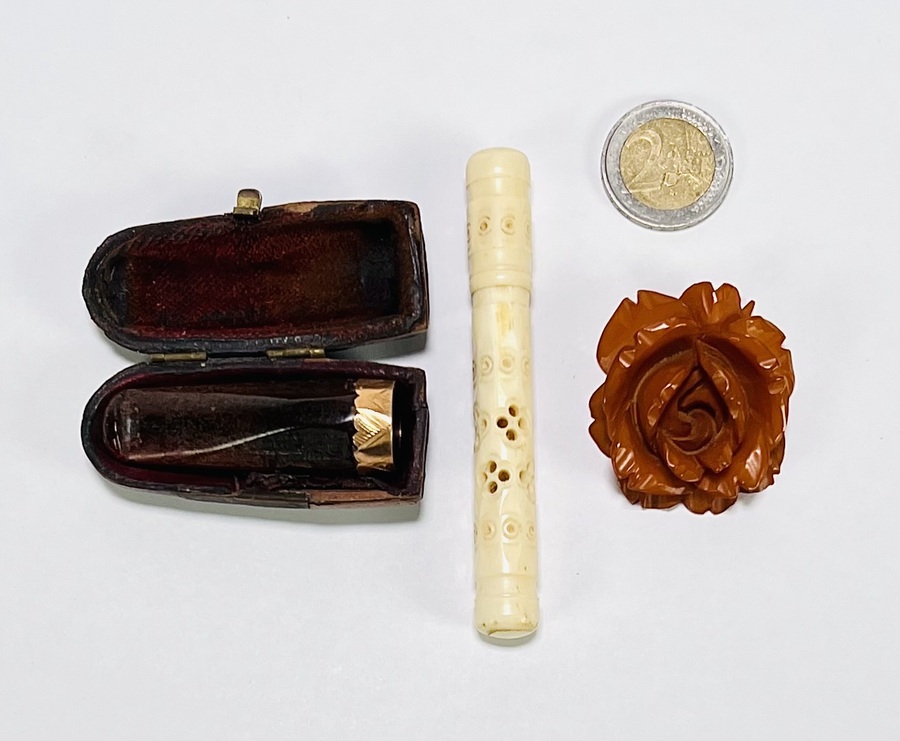 Het kavel omvat een barnsteen rookmondstuk in foedraal, een gegraveerde benen naaldenkoker en een gesneden roos van kunststof. Het mondstuk heeft een gouden applicatie gedecoreerd in Art Nouveau stijl, de naaldenkoker is opengewerkt met gestileerde motieven uit been. Klaar om te bieden? Registreer je nu en doe mee aan de veiling! |